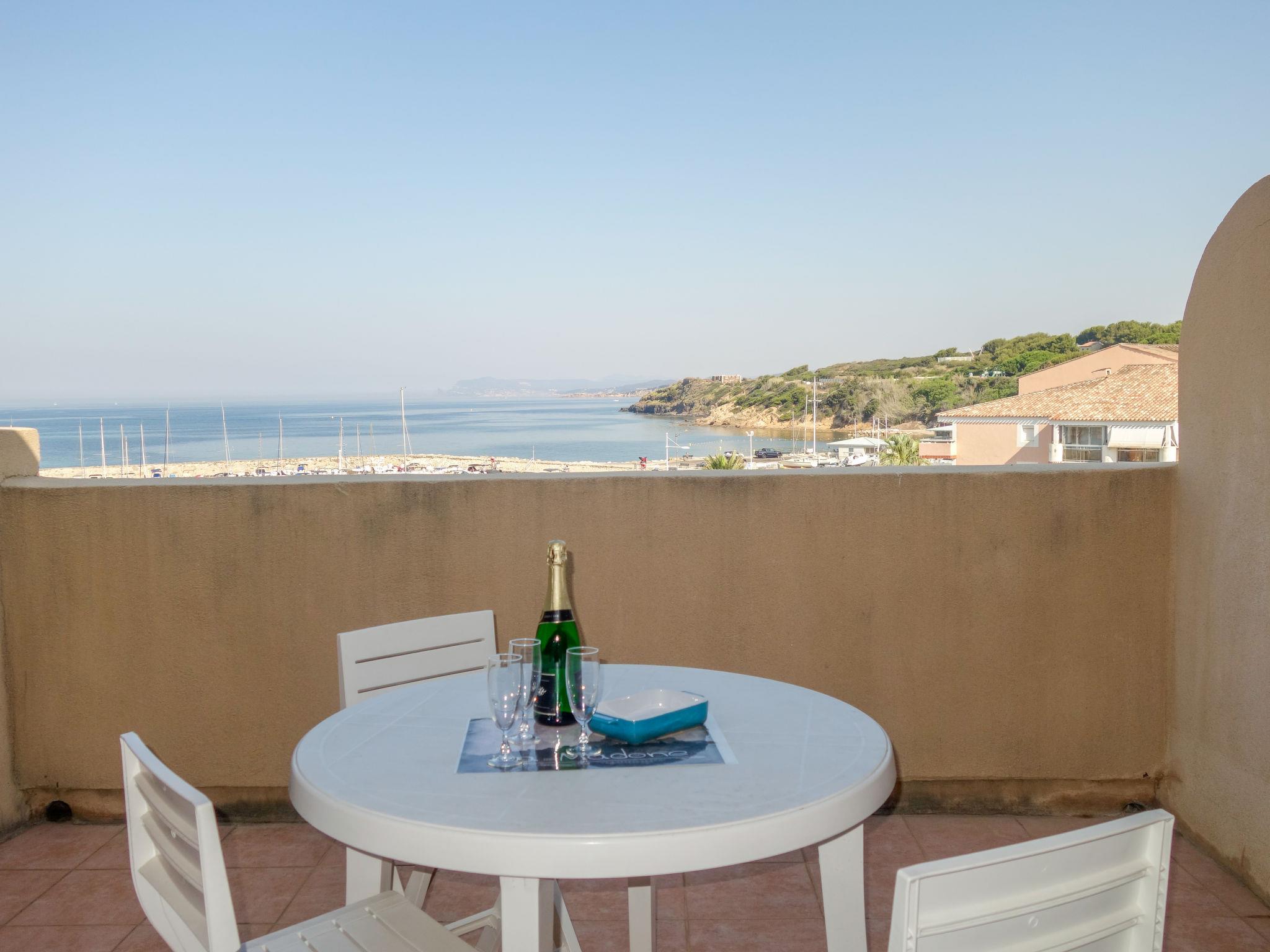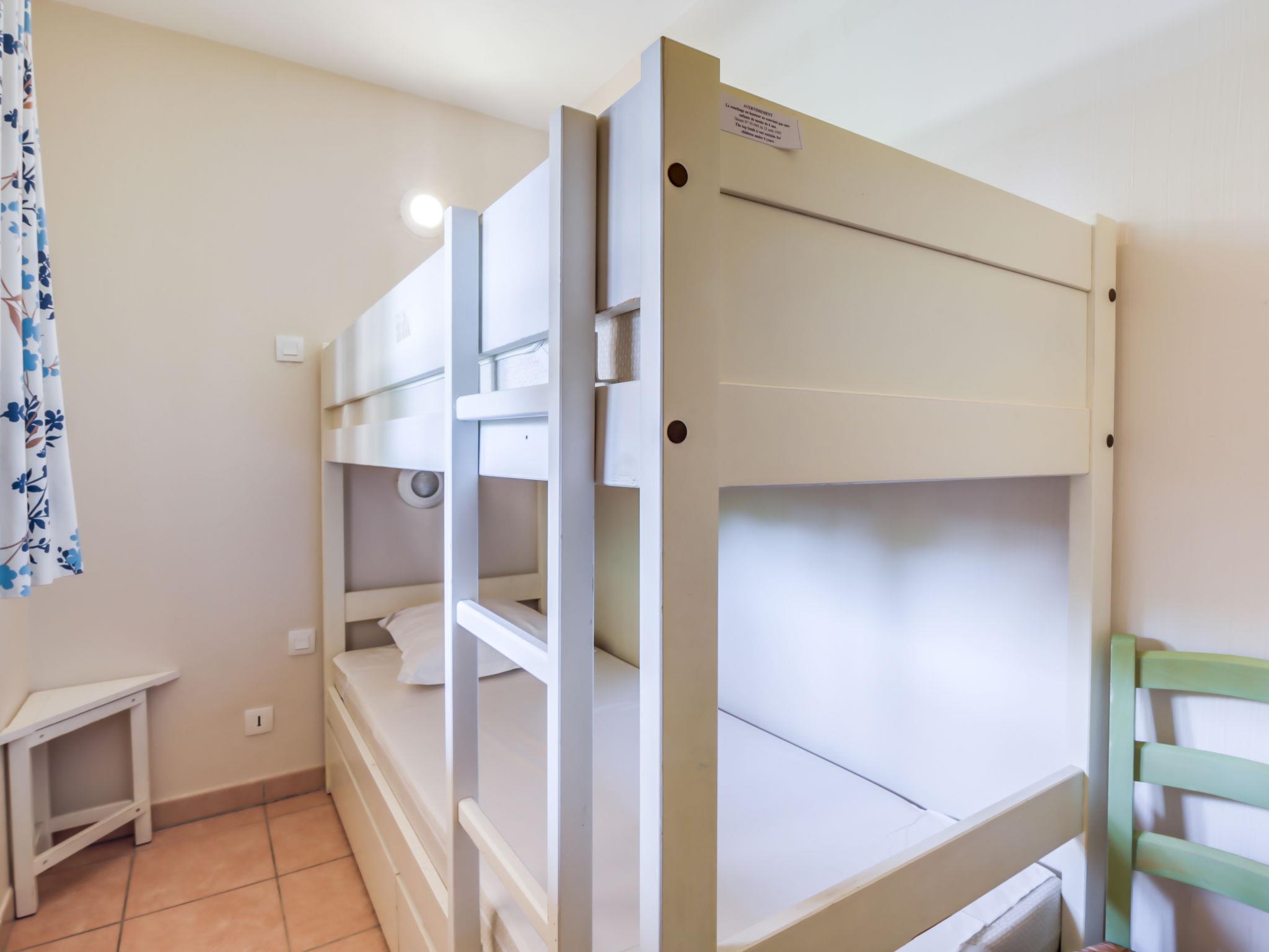3-room apartment 45 m2 on 2 levels on 2nd floor. Practical and beautiful furnishings: living/dining room with 2 beds (80 cm, length 190 cm), TV (flat screen). Exit to the terrace. Sleeping alcove with 1 x 2 bunk beds (80 cm, length 190 cm). Kitchenette (dishwasher, 4 ceramic glass hob hotplates, toaster, kettle, freezer, electric coffee machine, combination microwave). Shower/WC. Upper floor: 1 room with 1 french bed (140 cm, length 190 cm). Exit to the balcony. Bath/WC. Electric heating. Balcony 12 m2, west facing position, terrace 7 m2, roofed, west facing position. Terrace furniture. Beautiful view of the sea. Facilities: washing machine. Internet (WiFi, extra). Parking space n 549 (niveau 2) (roofed), height 190 cm, width 249 cm. Please note: non-smokers only. Maximum 1 pet/ dog allowed. TV only FR. Smoke alarm, no lift. Instead of an enclosed bedroom, some sleeping areas are located in an open-plan area (gallery, alcove, etc.).