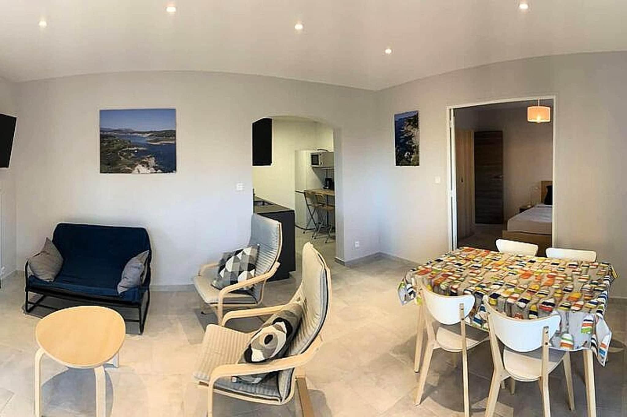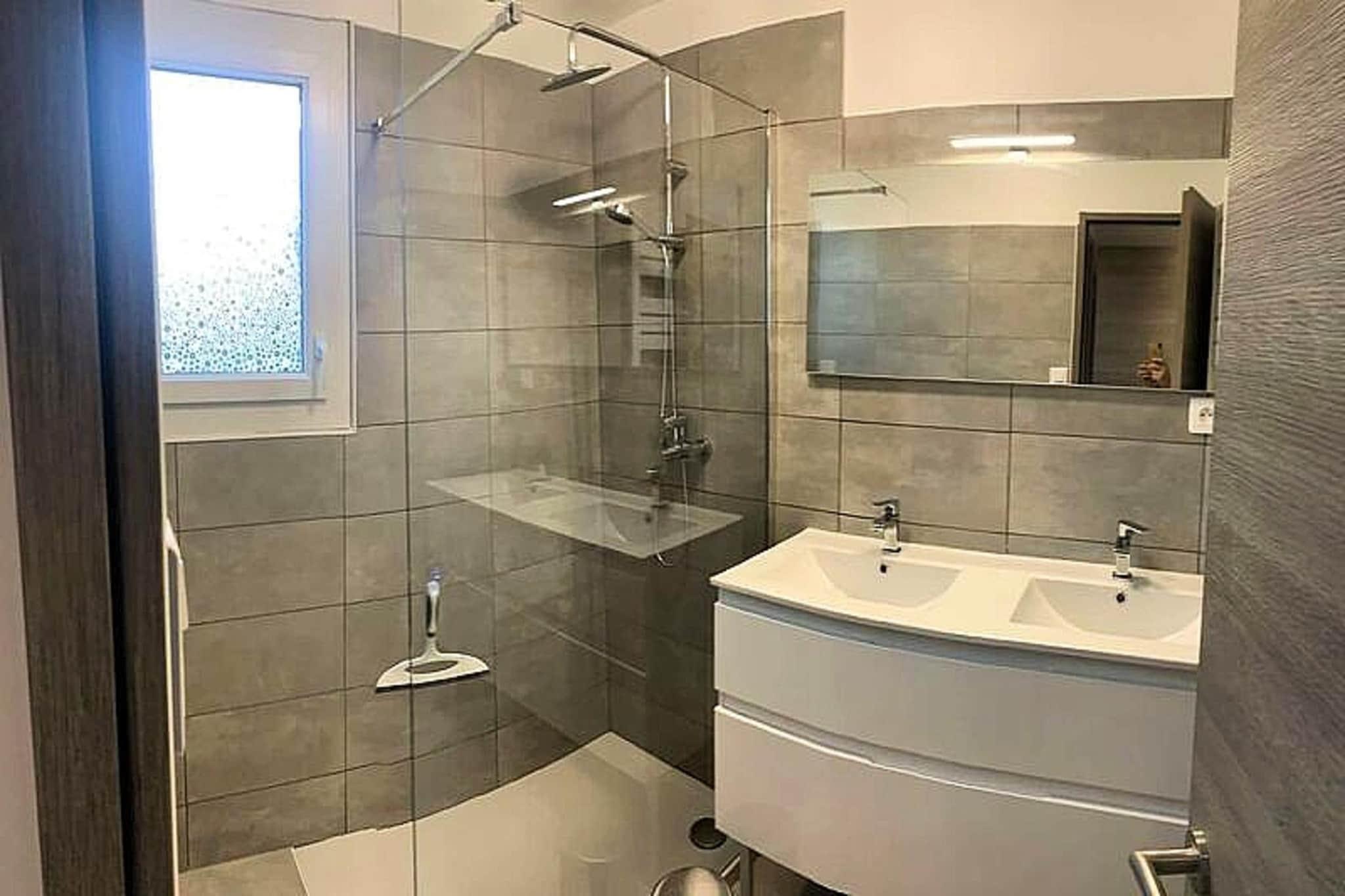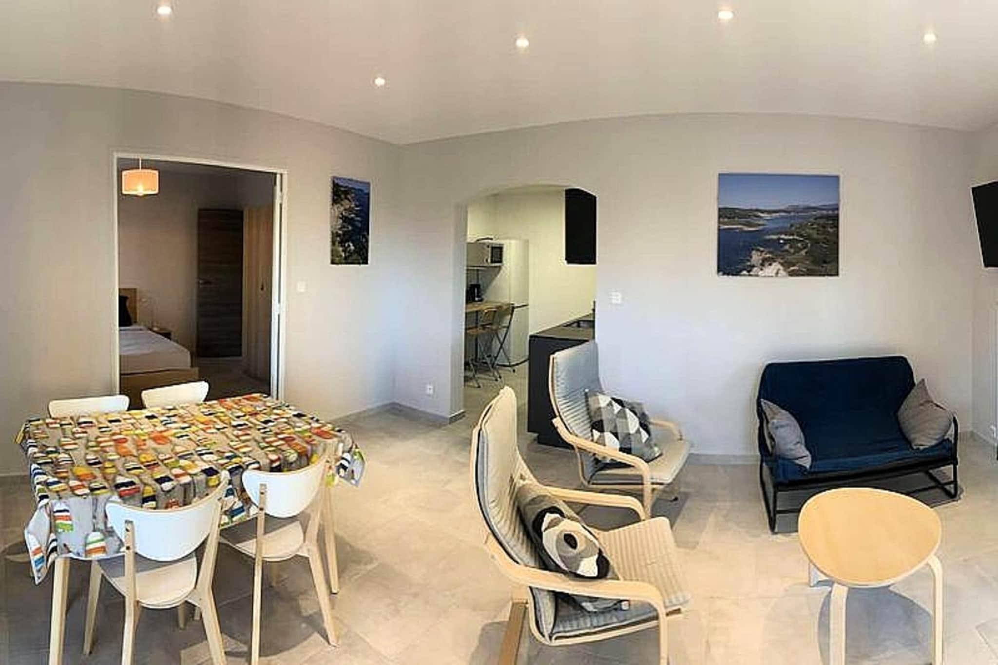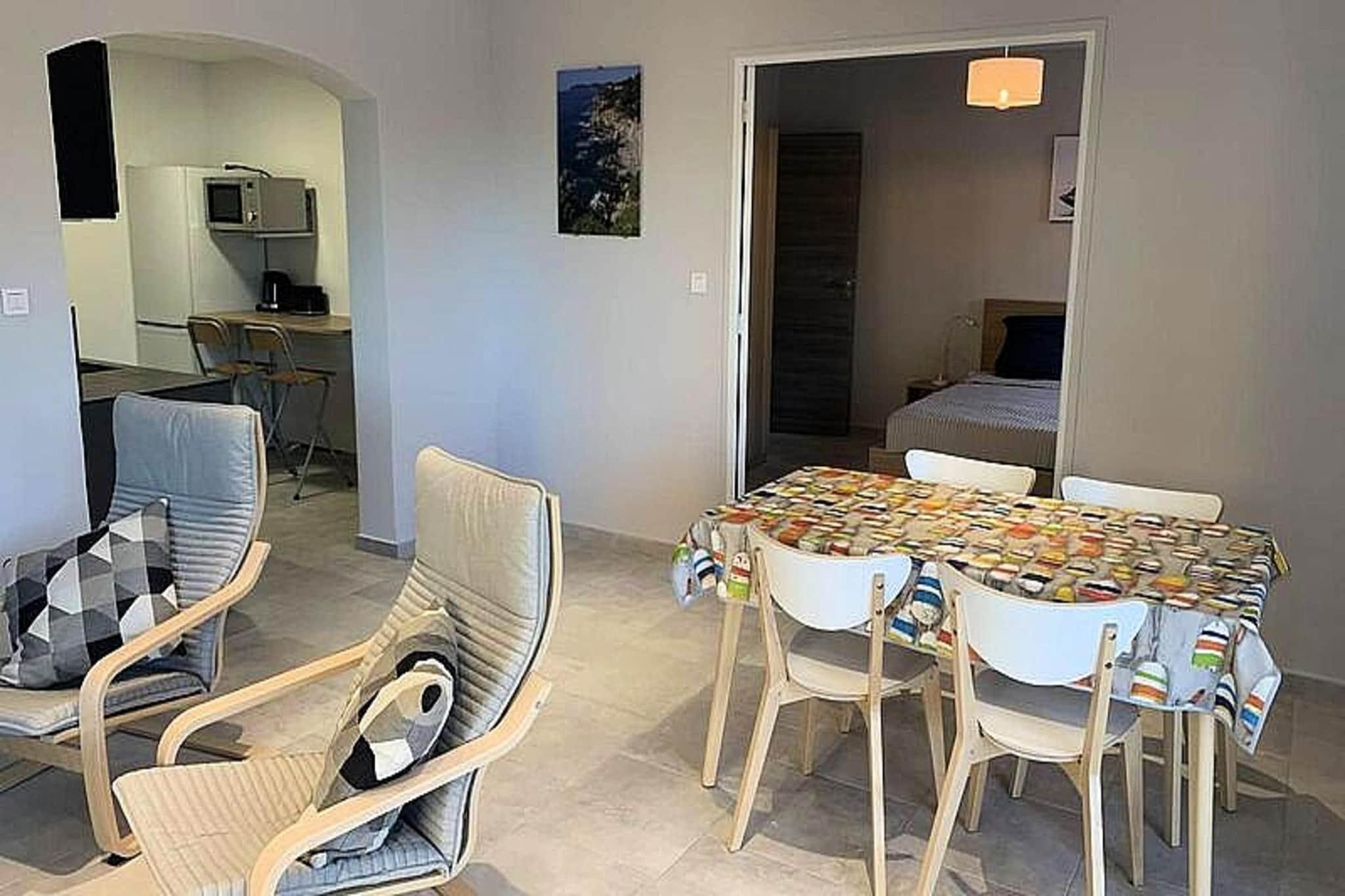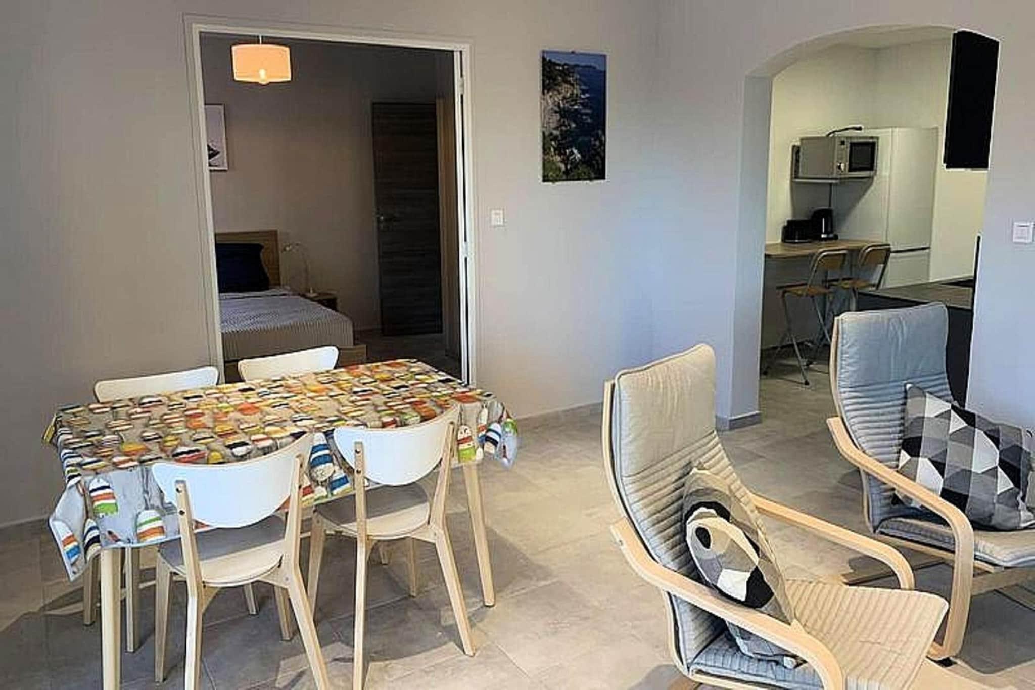 This spacious 80m² T4 apartment, perfect for up to 6 guests, is divided into two independent accommodations. The T3 apartment features a double bedroom (queen-size bed 160x200), a bedroom with two single beds (90x200), a large living room, and a bathroom. The adjoining studio includes a queen-size bedroom (160x200), a kitchenette, a bathroom, and a loggia with a dining table. Non-smoking and pet-free, this property ensures a peaceful environment for your stay. Bed linens and towels are available at an additional charge, and end-of-stay cleaning is included. Located just 100 meters from the sea with direct access, this apartment offers easy access to the stunning beaches and attractions of Sanary-sur-Mer, Gaou Islands, Les Embiez, Porquerolles, Cassis, Bandol, and Le Castellet. Explore charming villages, picturesque coves, and enjoy local cafes, markets, and restaurants offering the finest Provencal flavors. The apartment boasts a well-equipped kitchen with a refrigerator, microwave, and hob for self-catering. The private outdoor space features a 40m² south-facing terrace with garden furniture, perfect for enjoying meals outdoors. The accommodation includes a bathroom in each unit, and heating is available for comfort throughout the year.
