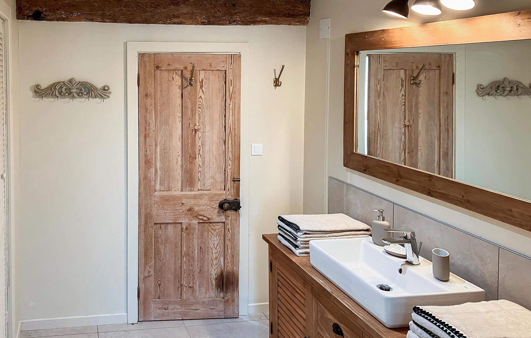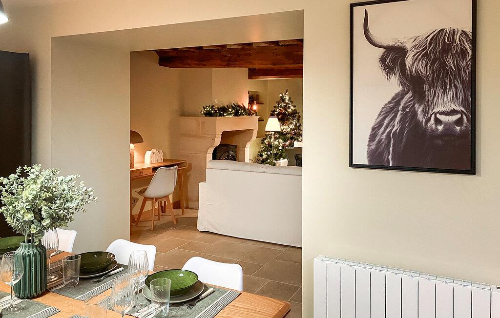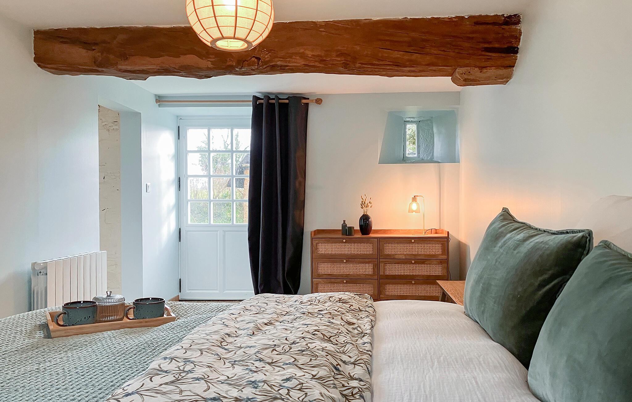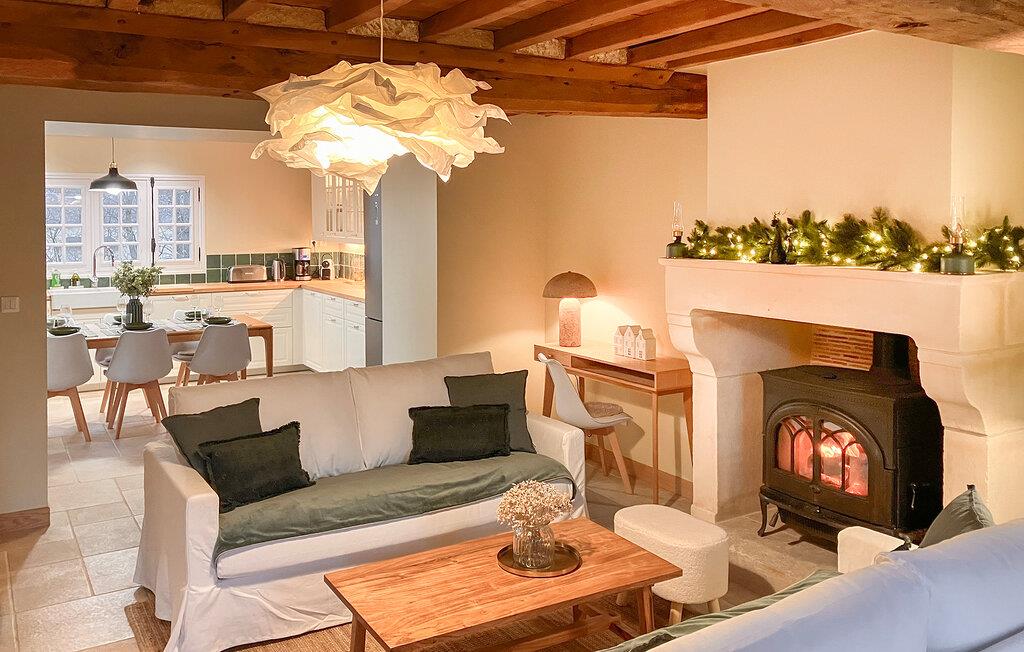 Omgivet af frodigt grønt område tilbyder dette hus de perfekte rammer for en afslappende ferie. Træbjælker, diskrete farver og komfortable møbler skaber en atmosfære, hvor I hurtigt vil føle jer hjemme. Når dagene bliver køligere, inviterer stuen med sin smukke brændeovn jer til hyggelige aftener med et glas vin.