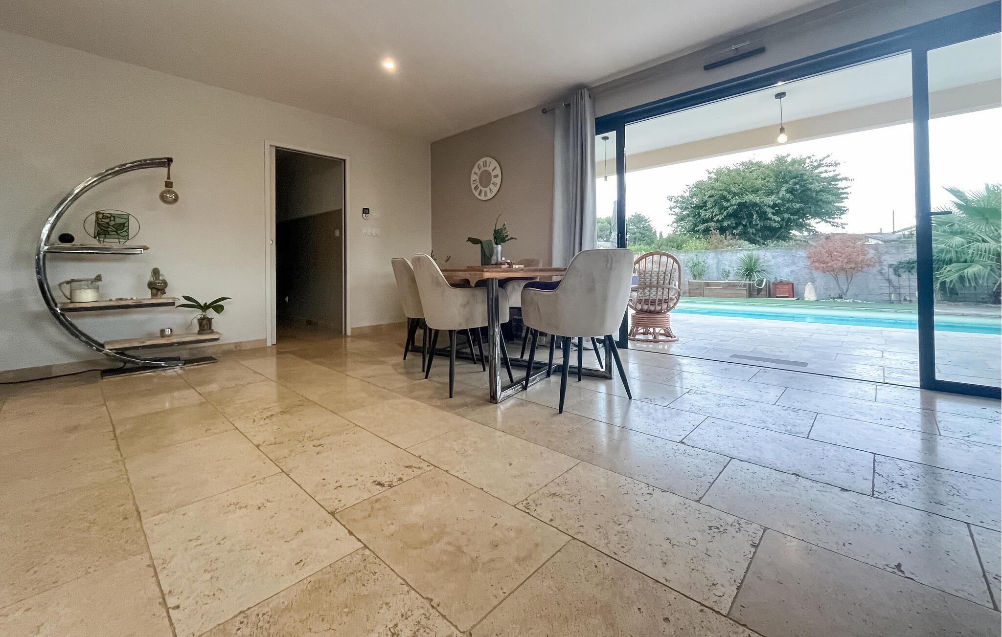 Tilbring en afslappende ferie i dette komfortable hjem, der tilbyder masser af plads til fælles tid og afslappende øjeblikke. Gør det behageligt i de komfortable sofaer i det åbne opholdsområde, hvor de store vinduer tilbyder udsigt over poolen. Tilbered jeres måltider i det moderne køkken med en køkkenø og nyd dem ved det stilfulde spisebord.