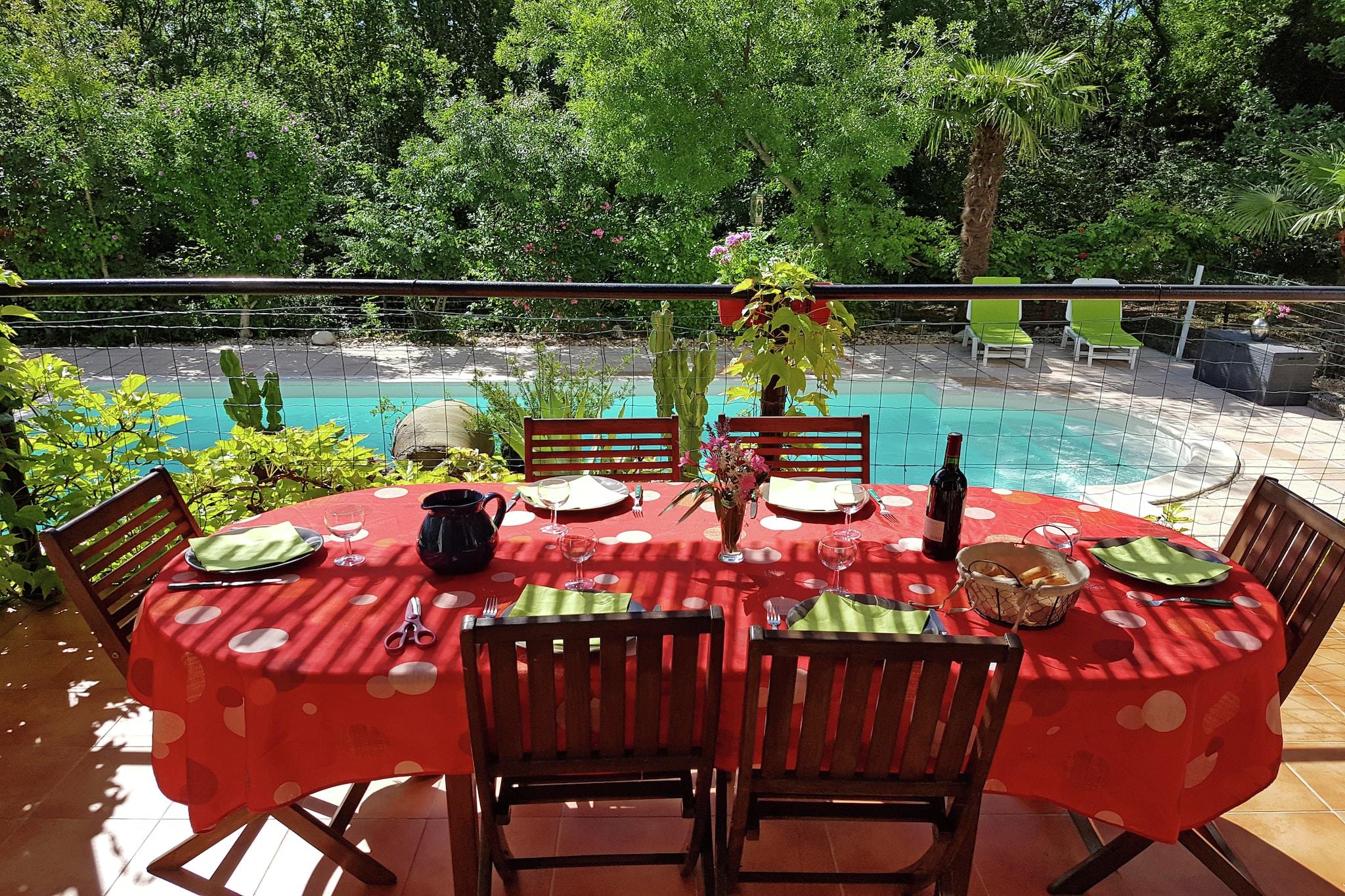 Beliggende i den fredelige landsby Saint-Brès tilbyder dette fritliggende feriehus en fredfyldt flugt i hjertet af Gard, nær Ardèche-grænsen. Ejendommen er omgivet af skovklædte bakker og ligger på en stor lukket ejendom og har en privat swimmingpool, bordtennis og en gynge - perfekt til familier eller venner, der søger afslapning og udendørs sjov. Den grønne have og den rummelige terrasse giver en fantastisk udsigt og rolige omgivelser til sommerens grillfester. Indvendigt er boligen raffineret, pletfri og velholdt. Efter en forfriskende svømmetur kan du slappe af på en liggestol eller nyde et måltid på den skyggefulde terrasse. Placeringen er ideel til at udforske Cevennerne og Ardèche: fra vandreture og kanosejlads til vinture og museer. Must-see attraktioner omfatter Pont d'Arc (30 km), Grotte de La Cocalière (4 km) og den ikoniske Pont du Gard (40 km). Nærliggende byer som St. Ambroix (3 km) og Anduze (37 km) byder på charme og kultur. Denne prisvindende ejendom lover et uforglemmeligt ophold. Elektricitet inkluderer 150 kWh om ugen, med ekstra forbrug. Opladning af el- eller hybridbiler er ikke tilladt. Uanset om du er på eventyr gennem naturen eller slapper af ved poolen, er denne villa en perfekt base for at opdage det sydlige Frankrig.