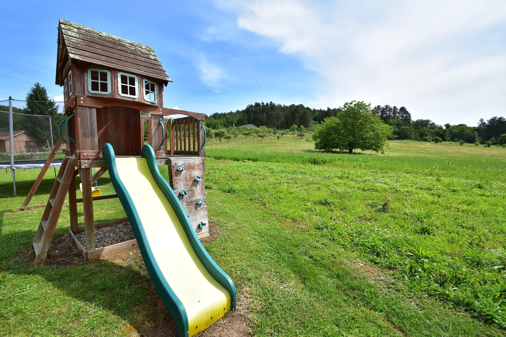 Stueetage: (Stue(Fjernsyn(parabol, antenne, Internationale TV-kanaler), kakkelovn(træ)), åbent køkken(komfur, mikrobølgeovn, opvaskemaskine , køle-fryseskab), soveværelse(dobbeltseng), badeværelse(badekar, bruser, håndvask), kaffemaskine, toilet, vaskemaskine) På 1. etage: (soveværelse(køjeseng), soveværelse(2x enkeltseng, barneseng), badeværelse(bruser, håndvask), toilet) terrasse, solstole, grill, trampolin, liggestole, swimmingpool(deles med ejer, termotæppe til swimmingpool, 8 x 4 m., opened from 1/2 Apr upto and including Oct), legeredskaber, bordtennisbord, loungemøbler, Pladegrill