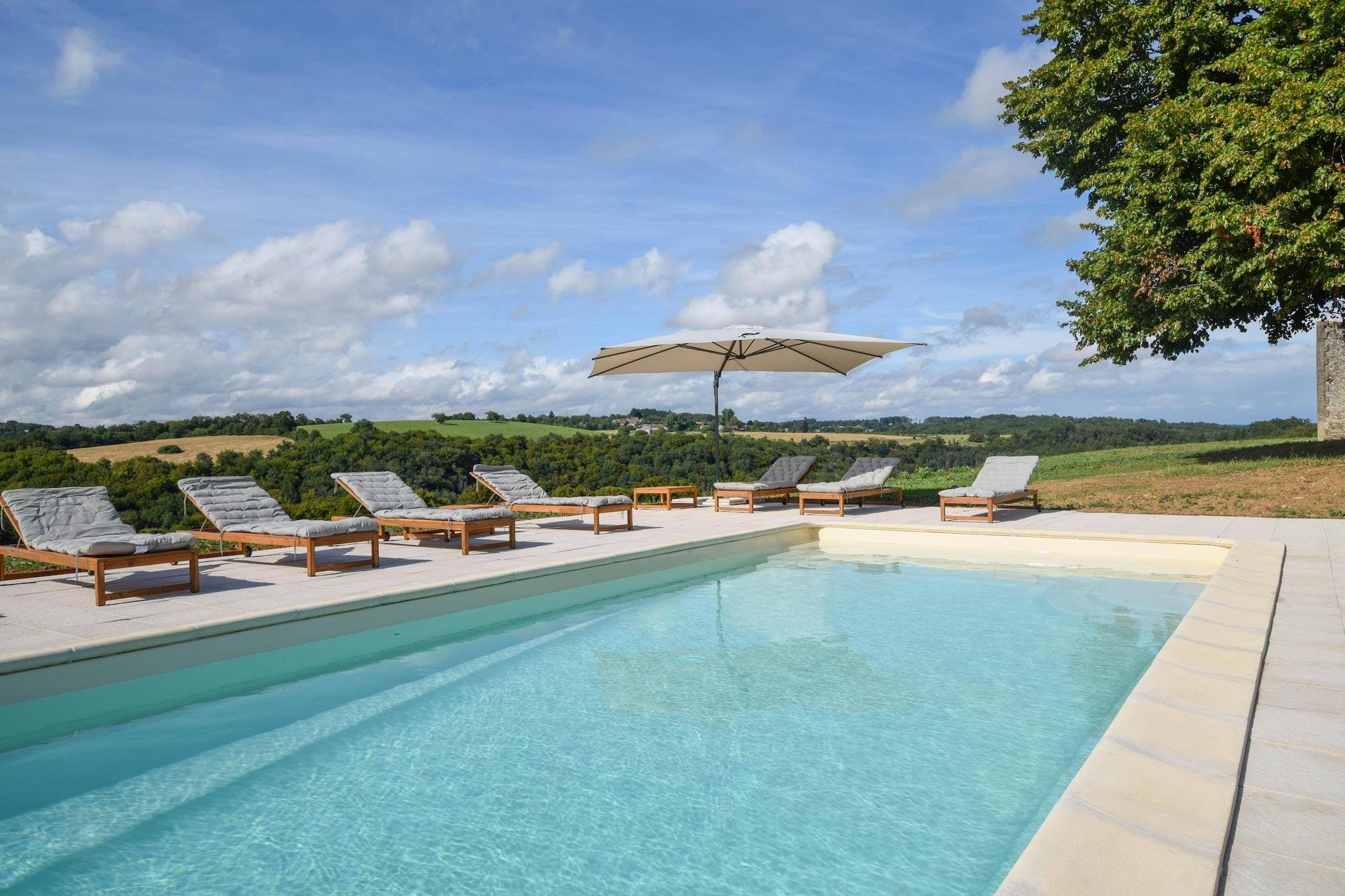 Denne moderne ferievilla i Saint-Médard-d'Excideuil er beliggende i det prestigefyldte Domaine d'Essendiéras, en fredfyldt 400 hektar stor ejendom med to slotte og flere elegante villaer. Villaen er designet til op til 6 gæster og byder på luksuriøst interiør og en privat opvarmet swimmingpool. Det fjerde soveværelse er hyggeligt og bedst egnet til små børn, hvilket gør det ideelt for familier, der søger både komfort og ro. Gæsterne kan nyde en bred vifte af faciliteter på stedet, herunder en 9-hullers golfbane, tennisbane og smukt anlagte haver perfekt til afslappede gåture. Ejendommen ligger på toppen af en af de højeste bakker i Dordogne og tilbyder panoramaudsigt og en rig historisk kulisse. Aktiviteter i nærheden omfatter huleudforskning, rafting og ridning gennem det naturskønne landskab. Kun 35 km fra Périgueux, Dordognes hovedstad, tilbyder denne villa nem adgang til kulturelle vartegn og gourmetoplevelser. Uanset om du slapper af ved poolen eller udforsker regionens naturlige skønhed, lover denne villa en mindeværdig og fredelig flugt.