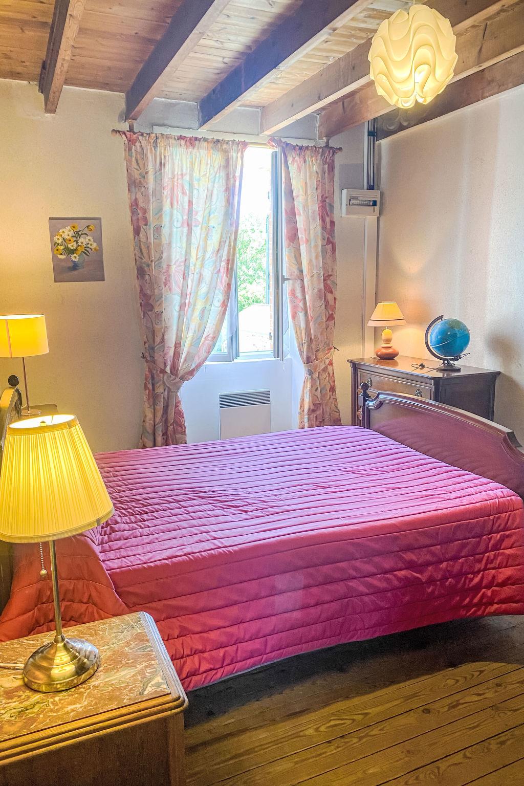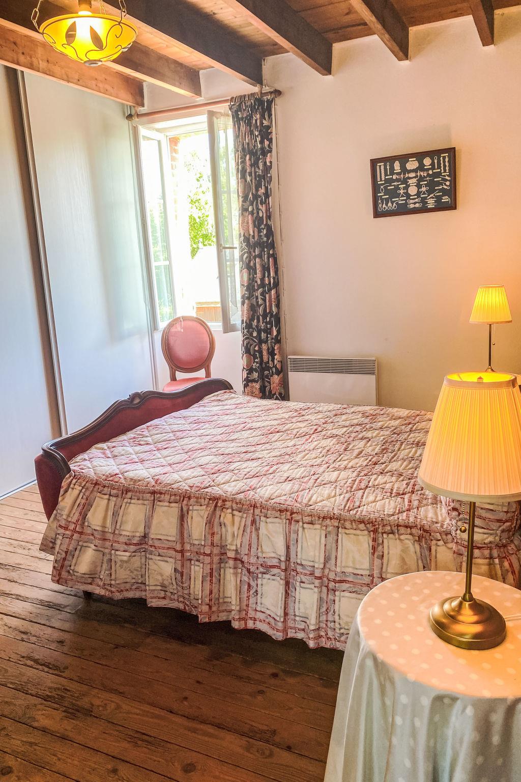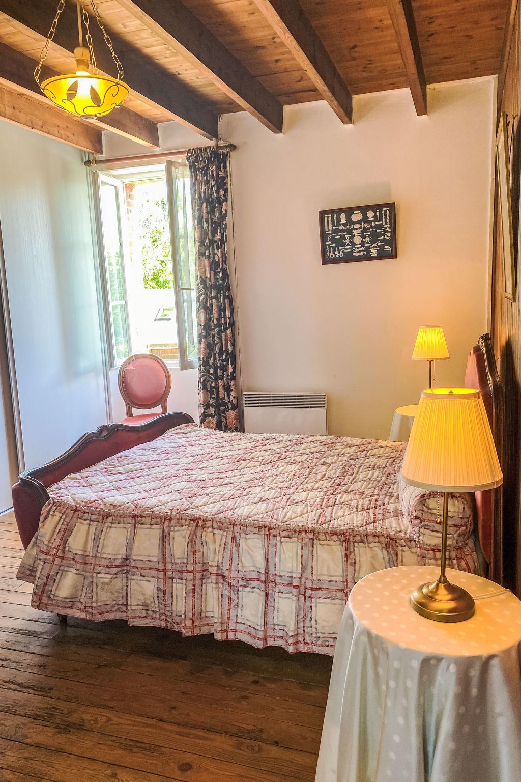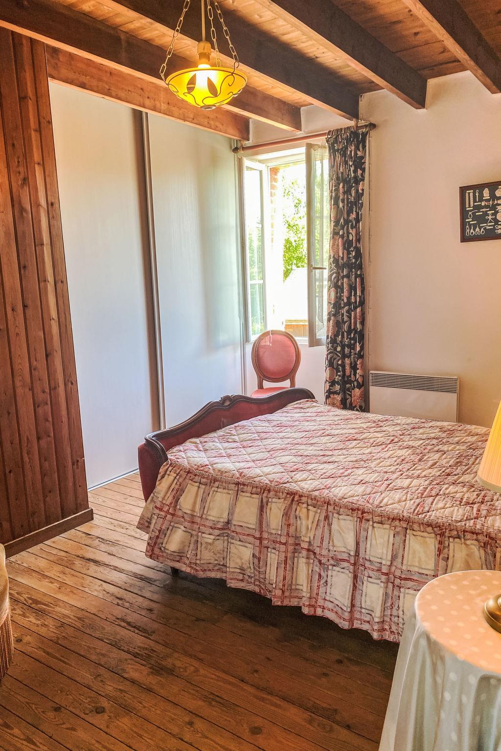 "La Bonneraie", 5-room semi-detached house 120 m2 on 2 levels. Antique and wooden furniture furnishings: living/dining room with dining table, satellite TV, radio and DVD. Large kitchen (oven, dishwasher, 4 gas rings, toaster, kettle, microwave, freezer, electric coffee machine) with open-hearth fireplace and dining table. Exit to the terrace. Shower, sep. WC. Upper floor: 4 rooms, each room with 1 french bed (140 cm, length 190 cm). Sep. WC. Electric heating. Parquet floors. Terrace. Terrace furniture, barbecue, deck chairs (6). Facilities: washing machine, iron, children's high chair. Internet (WiFi, extra). Please note: non-smoking house. Maximum 2 pets/ dogs allowed. Bed layout is flexible. There are more sleeping options available than the maximum number of people allowed which may, however, not be exceeded.