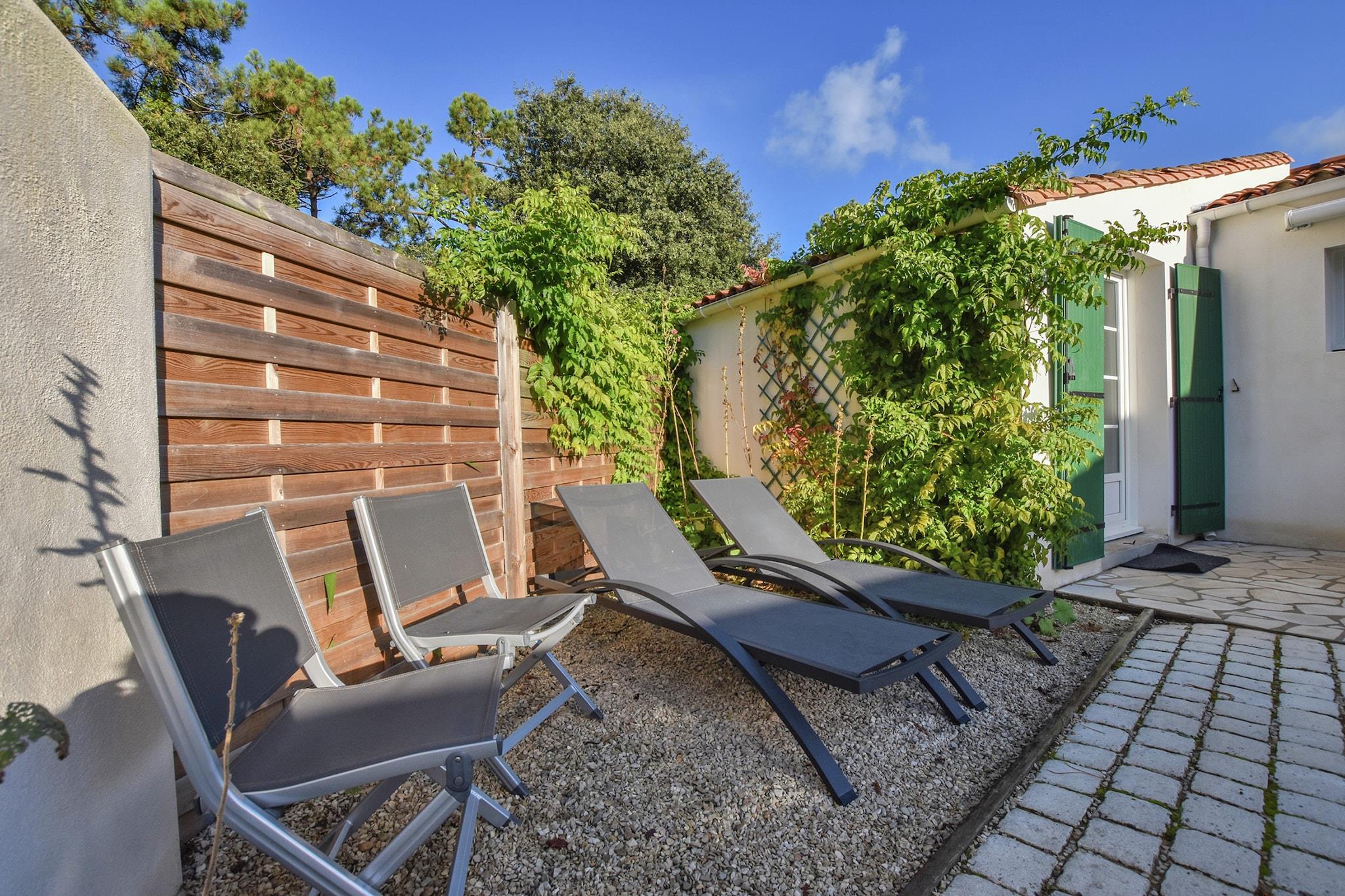 Drømmer du om at tilbringe din ferie på en fransk ø? L 'Île-de-Ré, der er tilgængelig med bro, er stedet for dig. Dette feriehus ligger i nærheden af Sainte-Marie-de-Ré, kun 300 m fra stranden og havet. Indkvarteringen er på et niveau og vinduerne og grønne skodder er i regionens karakteristiske stil. Hvis du har børn, kan du lade dem lege i legepladsen, der er specielt designet til dem og tilgængelig ved en port fra din terrasse. Lejeprisen er todelt, men takket være hegnet, det giver fuldstændig privatlivets fred. Øen er et sandt paradis for cyklister, de kan krydse hele længden og bredden af det langs cykelstier. Stranden har en strand med livreddere kun 2 km væk på cykel. Den befæstede by Saint -Martin-de-Ré (8 km) har en citadel og en lille havn med fantastisk mad og restauranter. Østersne er et must! Den historiske havneby La Rochelle (13 km) er let tilgængeligt med bil. den gamle havn og besøge tårnet Saint Nicolas fra det 14. århundrede du vil også finde det største akvarium i Europa. Les Baleines (24 km) og dets fyr er placeret på øens vestligste punkt. Derfra har du en fantastisk udsigt over Atlanterhavet. Den gamle søby Rochefort (ca. 50 km) er også værd at besøge. Der kan du beundre skibet Hermione, en berømt gengivelse af General Lafayette fregat. Igen med bil kan du også besøge Marais Poitevin Regional Natural Park (33 km).