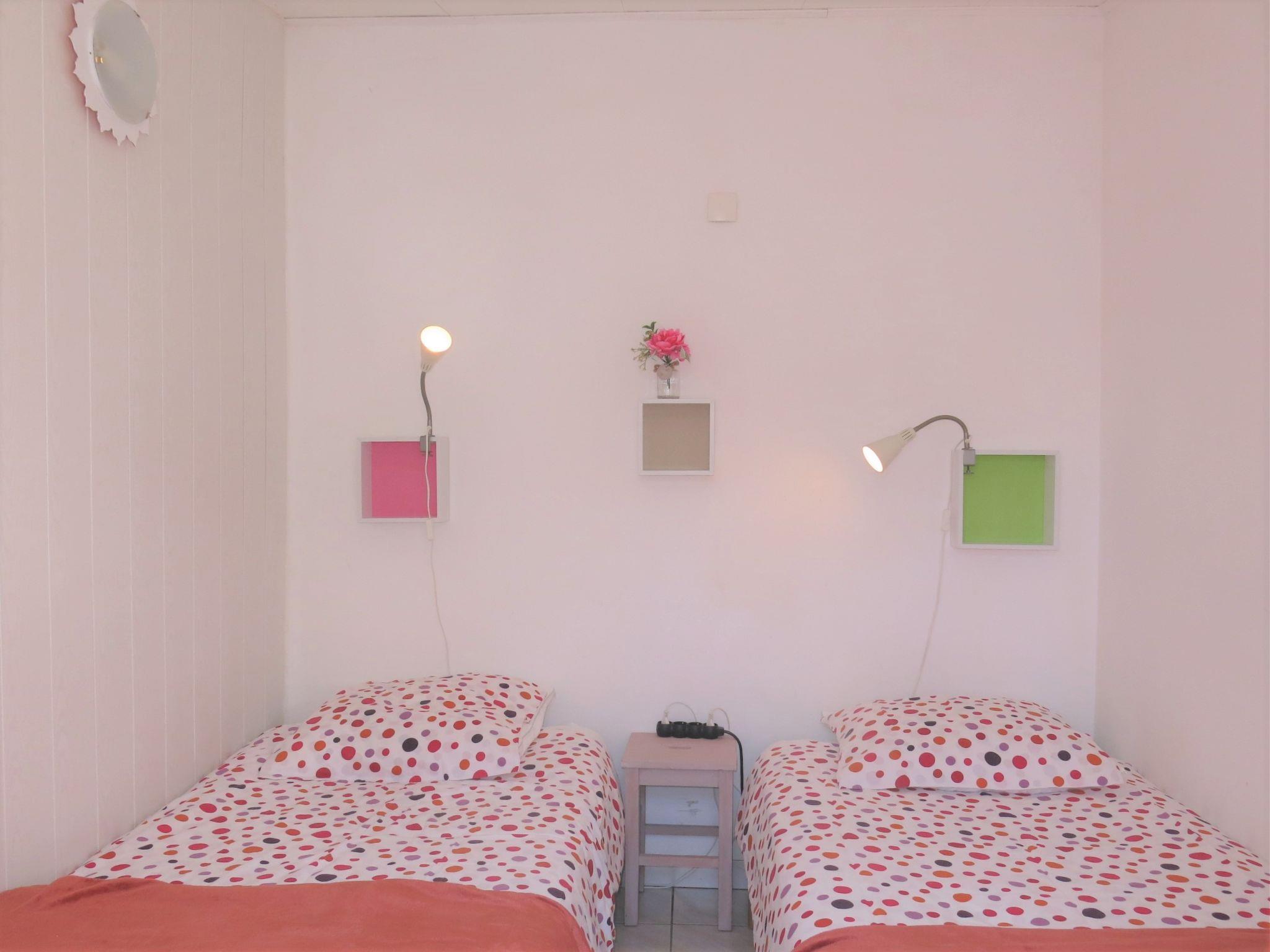 "Roses Tremières", 2-room house 25 m2. Simple and beautiful furnishings: interconnecting room with veranda. 1 small room with 2 beds (90 cm, length 200 cm). Kitchen-/living room (2 hot plates, dishwasher, toaster, kettle, microwave, electric coffee machine, Capsules for coffee machine (Senseo) extra) with dining nook and satellite TV. Exit to the veranda. Shower/WC. Electric heating. Terrace. Terrace furniture, barbecue (portable), deck chairs (2). Facilities: washing machine, iron. Internet (WiFi, free). Please note: non-smoking house. Maximum 1 pet/ dog allowed. Smoke alarm.