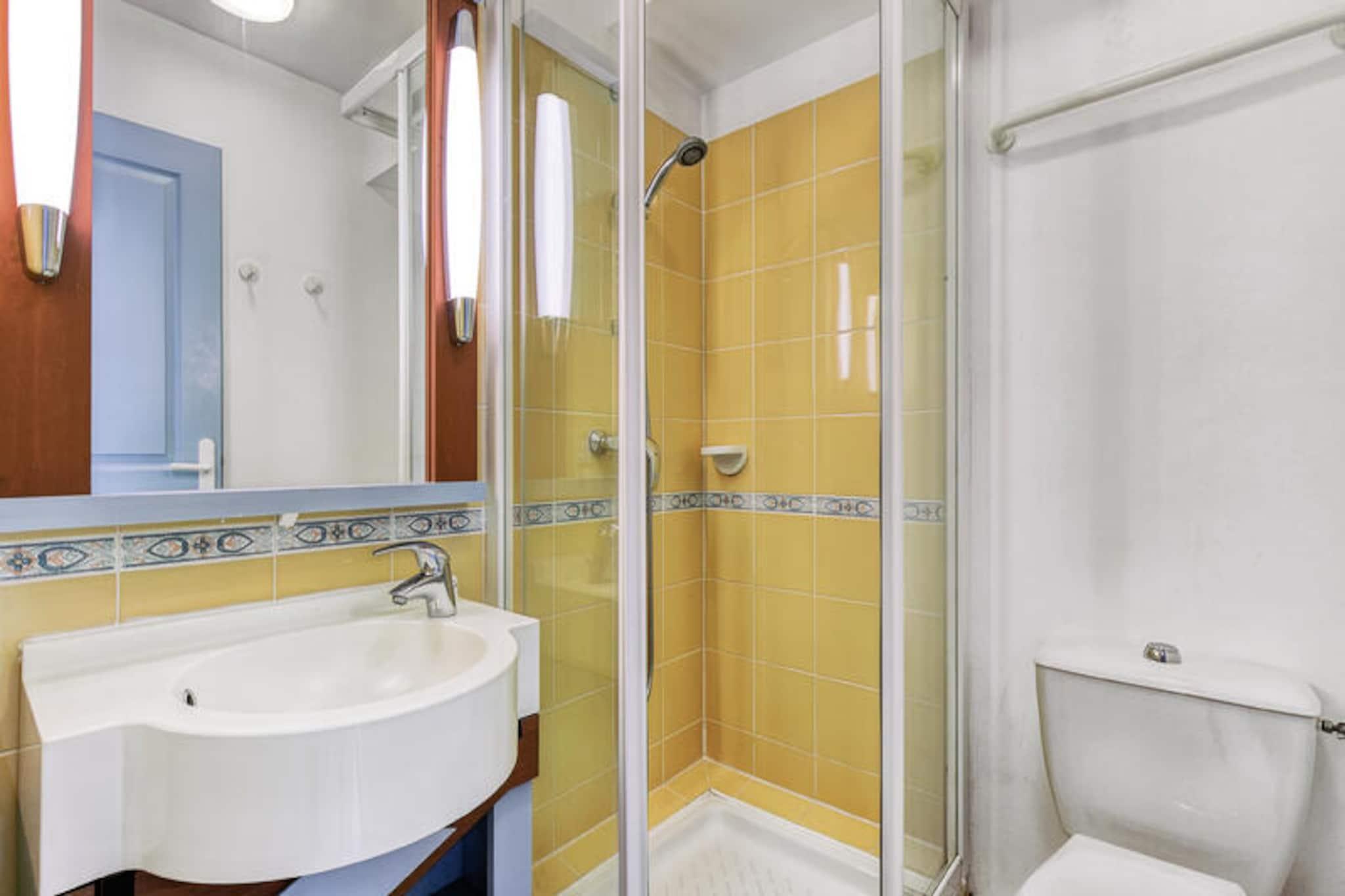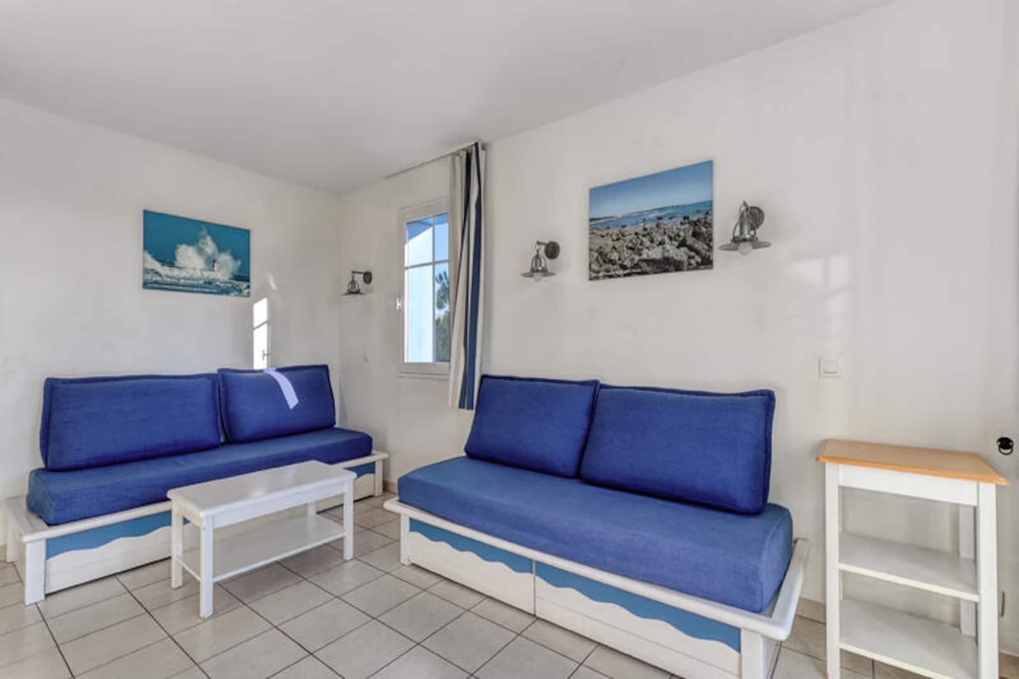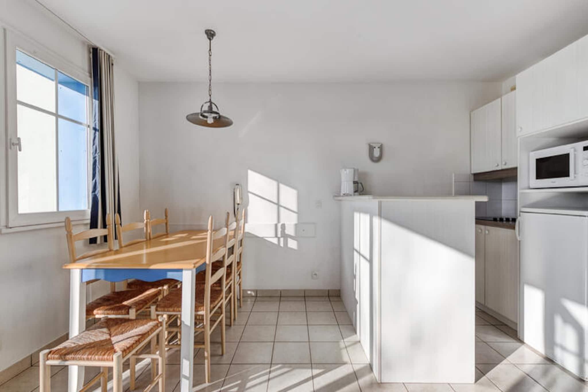 Denne charmerende lejlighed, beliggende i en fredelig ferieby, tilbyder et behageligt ophold for op til 6 gæster med to hyggelige soveværelser og to badeværelser. Det ene soveværelse har en dobbeltseng, mens det andet er udstyret med køjesenge. Lejligheden er lys og velholdt og har en møbleret balkon med udsigt over landsbyen. Det inkluderer også en sovesofa i stuen, perfekt til yderligere gæster. Ejendommen er kæledyrsvenlig, og parkering er bekvemt tilgængelig. Beliggende i en 90 hektar stor ejendom omgivet af fyrreskove, er denne lejlighed tæt på havet, kun en kort cykeltur eller gåtur væk gennem naturskønne stier. Veillon-stranden, omkring 2,5 km væk, byder på en række aktiviteter. Boligen har en række fritidsmuligheder, herunder tre swimmingpools, en vandrutsjebane og to 18-hullers golfbaner. Gæsterne kan også nyde et pizzeria, bageri og bar/isbar på ejendommen. Indvendigt har lejligheden et veludstyret semi-åbent køkken med moderne apparater, herunder opvaskemaskine, mikroovn og fryser. Opholdsområdet har fladskærms-tv, og ejendommen giver gratis adgang til opvarmede pools med rutsjebaner og soppebassin i sommermånederne. Yderligere faciliteter såsom en vaskemaskine, WiFi (mod et ekstra gebyr) og slutrengøring er også tilgængelige.