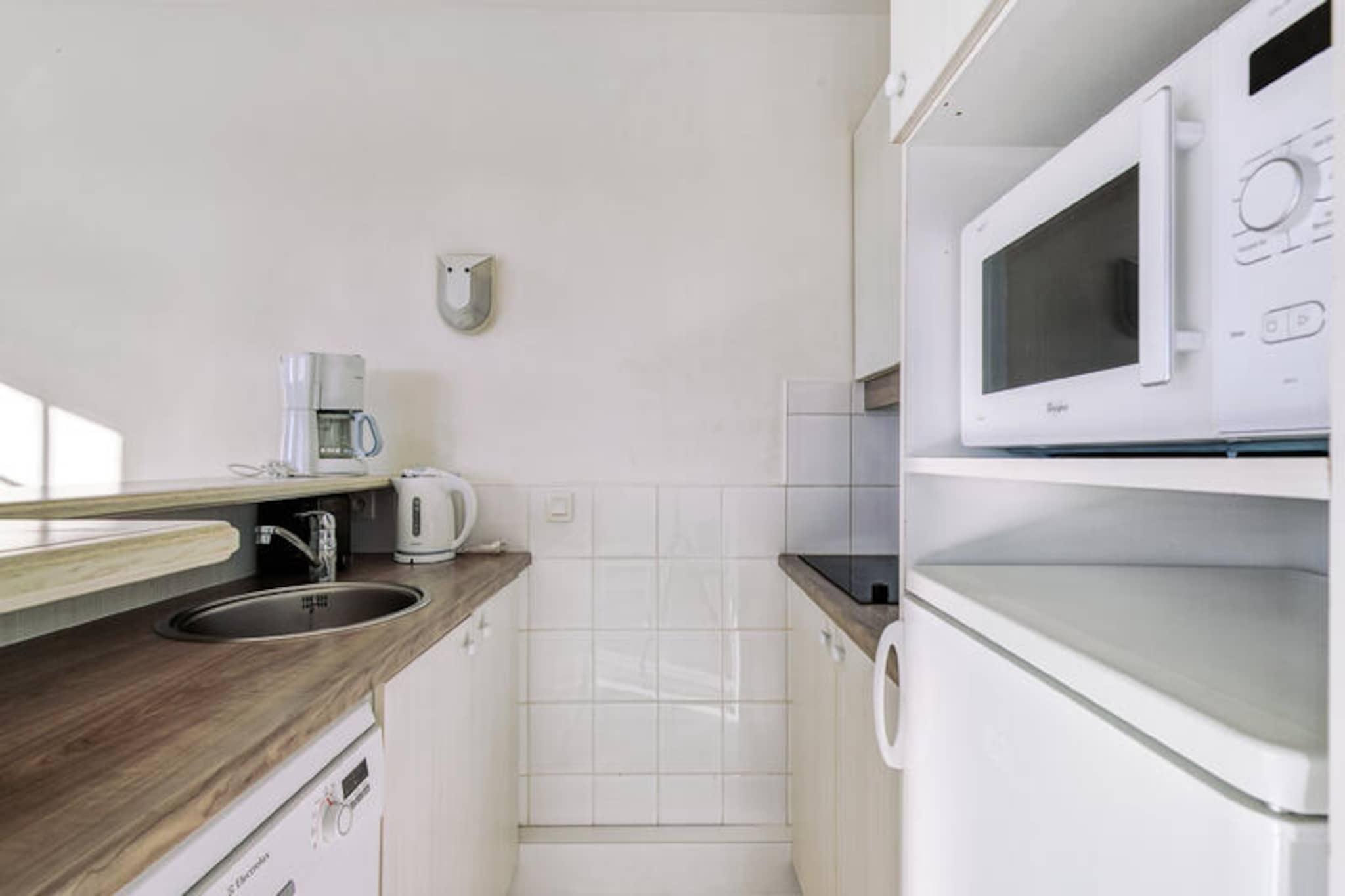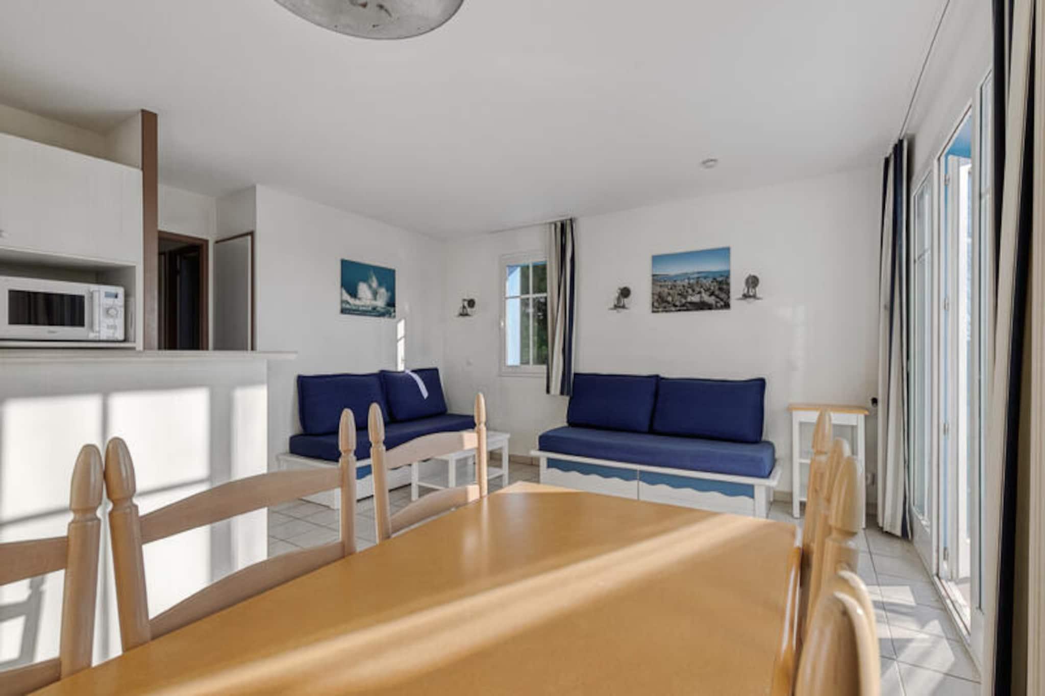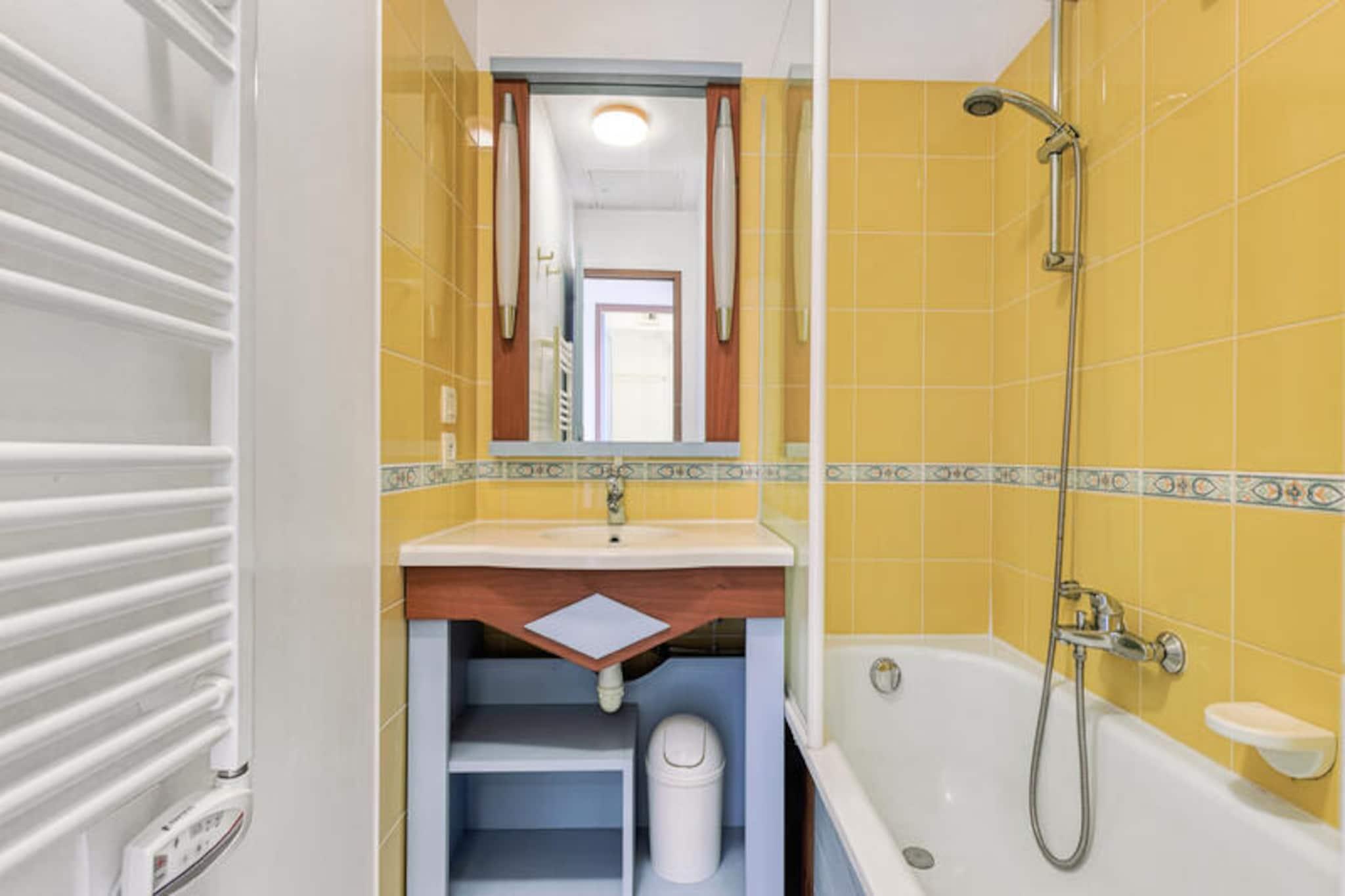 Denne charmerende lejlighed, beliggende i en fredelig ferieby, tilbyder et behageligt ophold for op til 6 gæster med to hyggelige soveværelser og to badeværelser. Det ene soveværelse har en dobbeltseng, mens det andet er udstyret med køjesenge. Lejligheden er lys og velholdt og har en møbleret balkon med udsigt over landsbyen. Det inkluderer også en sovesofa i stuen, perfekt til yderligere gæster. Ejendommen er kæledyrsvenlig, og parkering er bekvemt tilgængelig. Beliggende i en 90 hektar stor ejendom omgivet af fyrreskove, er denne lejlighed tæt på havet, kun en kort cykeltur eller gåtur væk gennem naturskønne stier. Veillon-stranden, omkring 2,5 km væk, byder på en række aktiviteter. Boligen har en række fritidsmuligheder, herunder tre swimmingpools, en vandrutsjebane og to 18-hullers golfbaner. Gæsterne kan også nyde et pizzeria, bageri og bar/isbar på ejendommen. Indvendigt har lejligheden et veludstyret semi-åbent køkken med moderne apparater, herunder opvaskemaskine, mikroovn og fryser. Opholdsområdet har fladskærms-tv, og ejendommen giver gratis adgang til opvarmede pools med rutsjebaner og soppebassin i sommermånederne. Yderligere faciliteter såsom en vaskemaskine, WiFi (mod et ekstra gebyr) og slutrengøring er også tilgængelige.