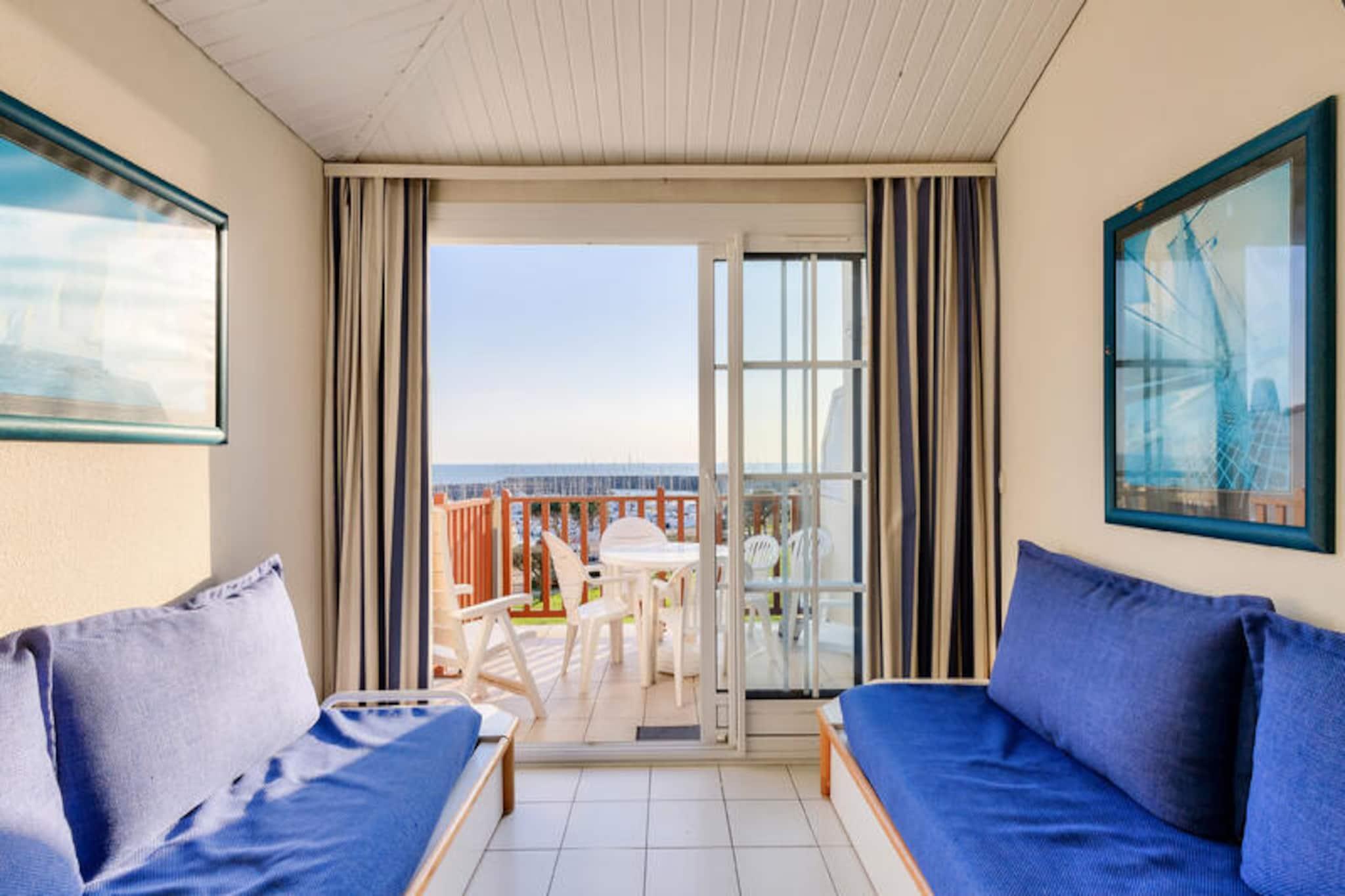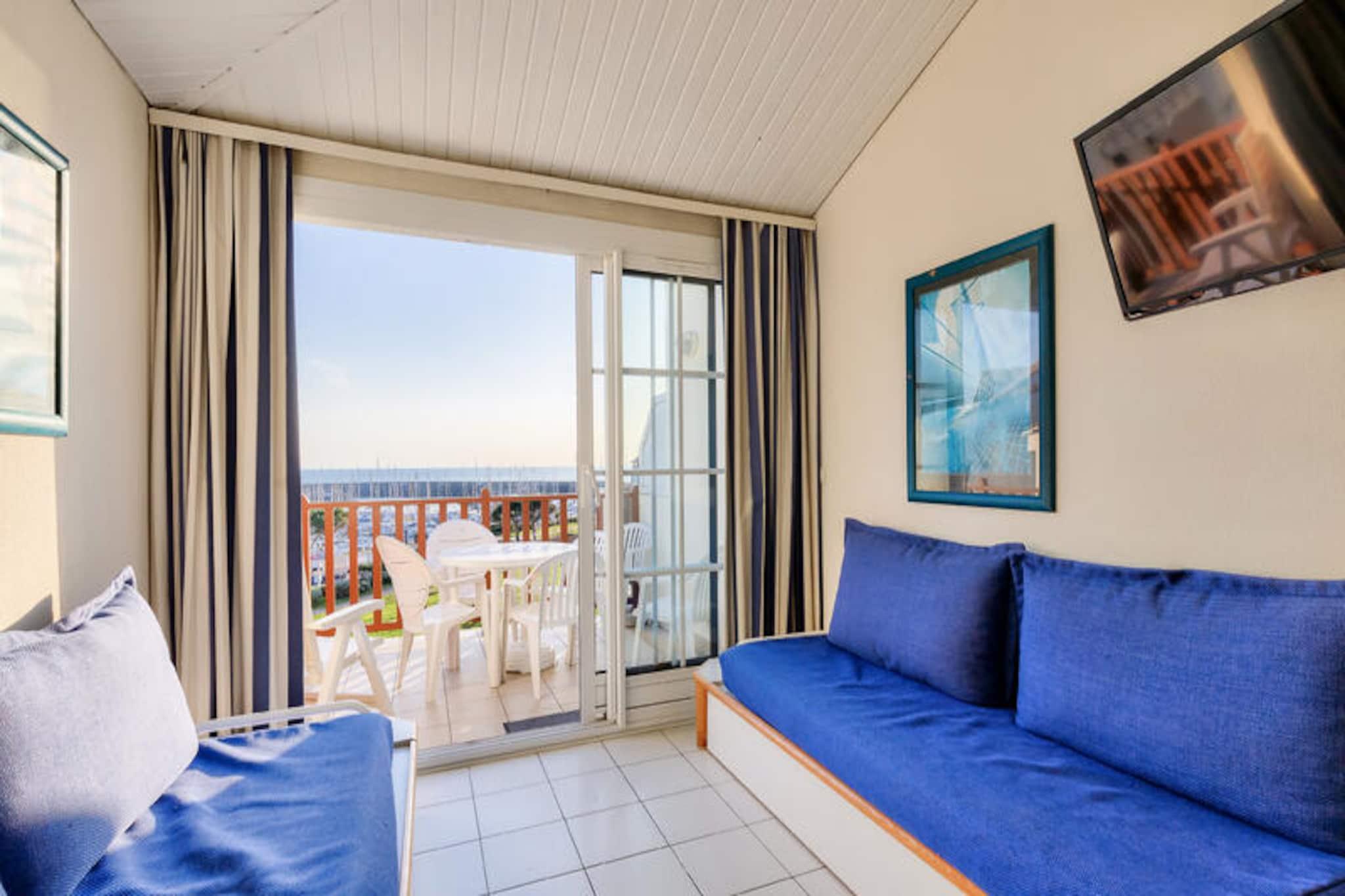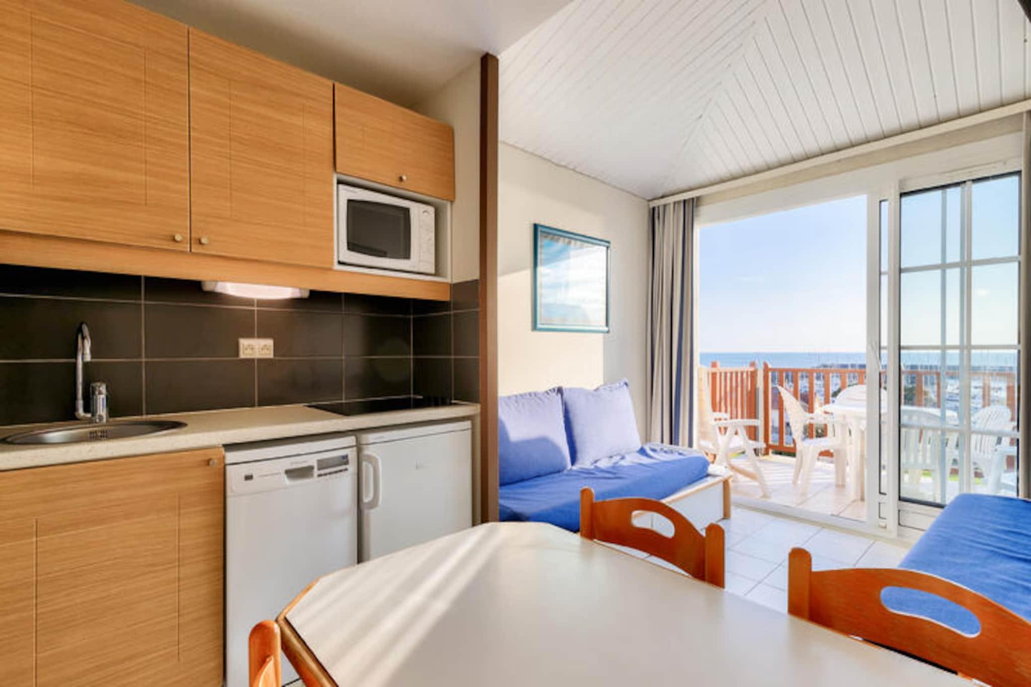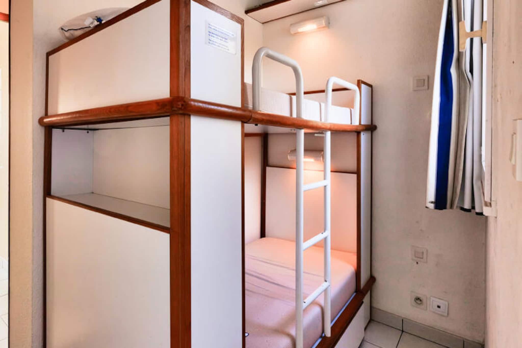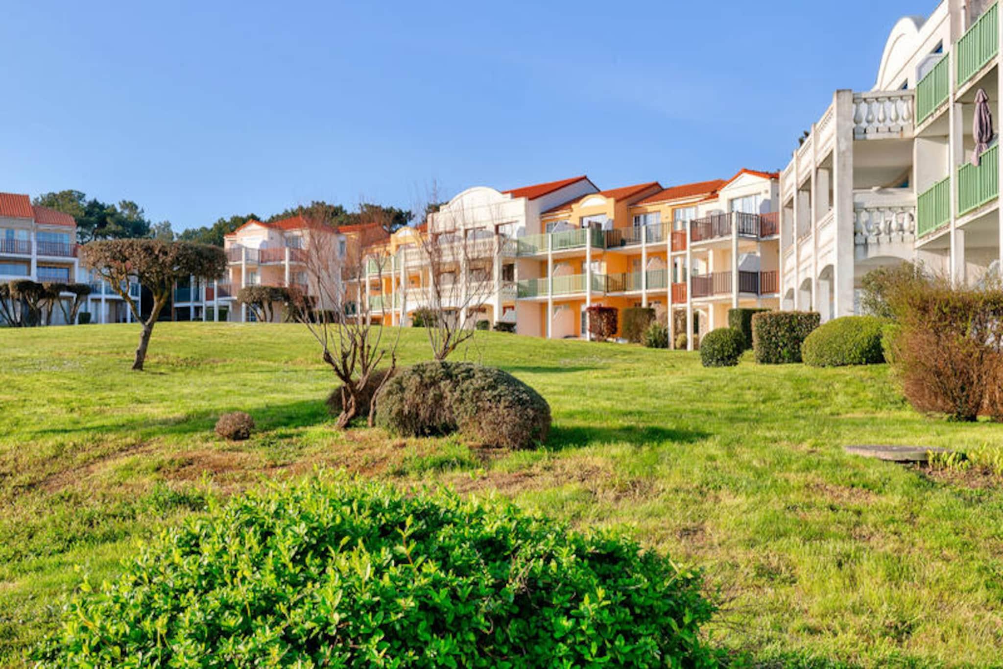 Dette lejlighedskompleks tilbyder en række faciliteter og aktiviteter på stedet til en afslappende ferie i Talmont-Saint-Hilaire, Vendée. Ejendommen er beliggende på en 90 hektar stor ejendom omgivet af en fyrreskov og med udsigt over en sø. Det har en fodgængerbolig med butikker, et pizzeria, bageri og bar/isbar (uafhængige virksomheder). Komplekset kan også prale af tre swimmingpools (åbne på bestemte datoer) med rutsjebaner og et soppebassin. Gæsterne kan nyde yderligere underholdningsmuligheder (mod et ekstra gebyr) såsom tennis og minigolf, eller udforske to nærliggende 18-hullers golfbaner. Selve lejligheden er et studie på 25 m², der komfortabelt kan sove fem gæster. Det har en sydvendt balkon med havudsigt, en stue med en sovesofa til to og en udtræksseng, et køkken i amerikansk stil, et kabineområde med køjesenge og et badeværelse med badekar. Lejligheden er kæledyrsvenlig (med forudgående godkendelse og ekstra gebyrer). Yderligere faciliteter og tjenester, der er tilgængelige mod et gebyr, omfatter Wi-Fi-adgang, leje af babysæt (krybbe og klapvogn), leje af sengelinned og håndklæder, daglig skift af håndklæder, slutrengøring og udækket parkering i boligen. Centerpoolen er tilgængelig for alle gæster fra 29. april til 15. september. Livreddere er kun til stede for rutsjebanen og poolen fra 1. juli til 31. august. Turistskat varierer afhængigt af sted og er gratis for gæster under 18. Der kræves et depositum ved indtjekning.