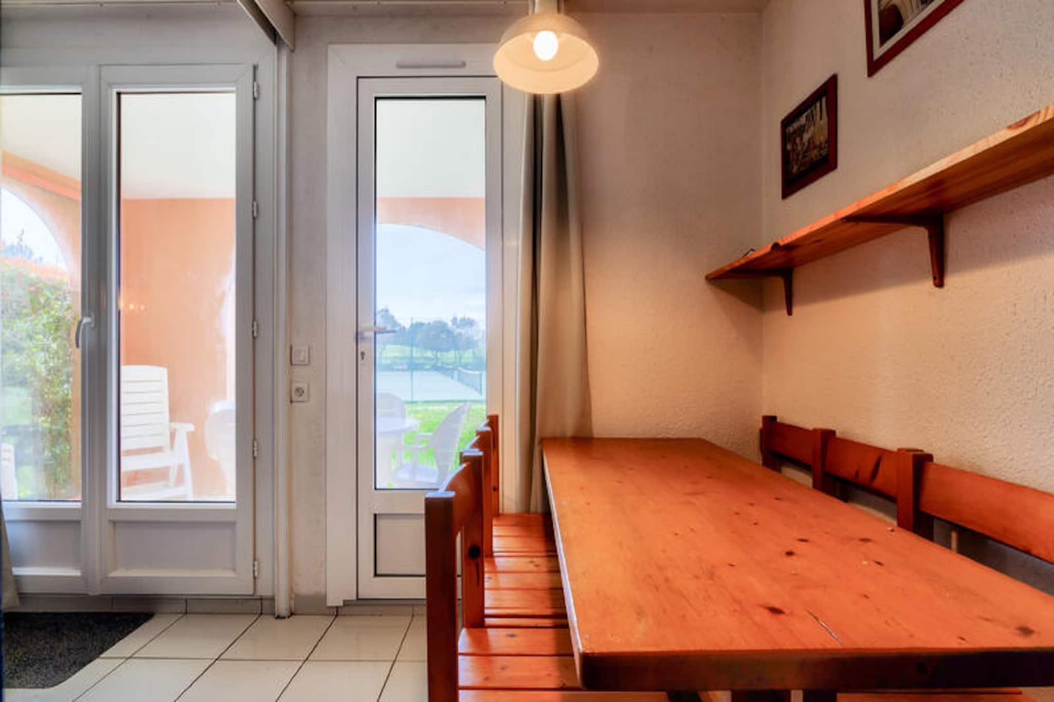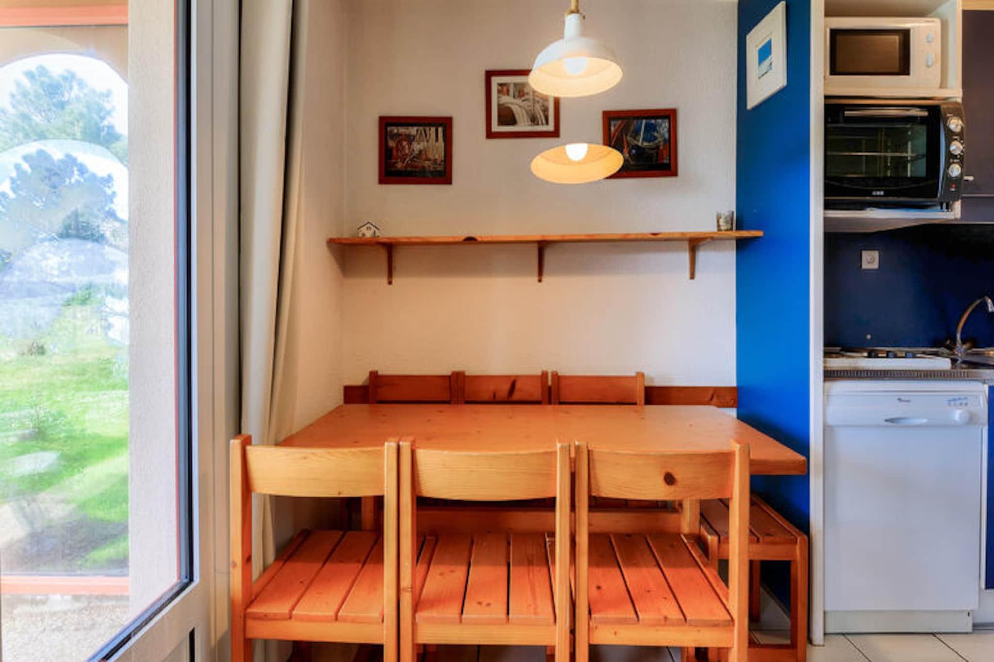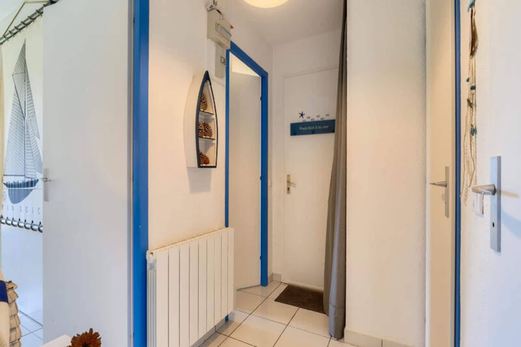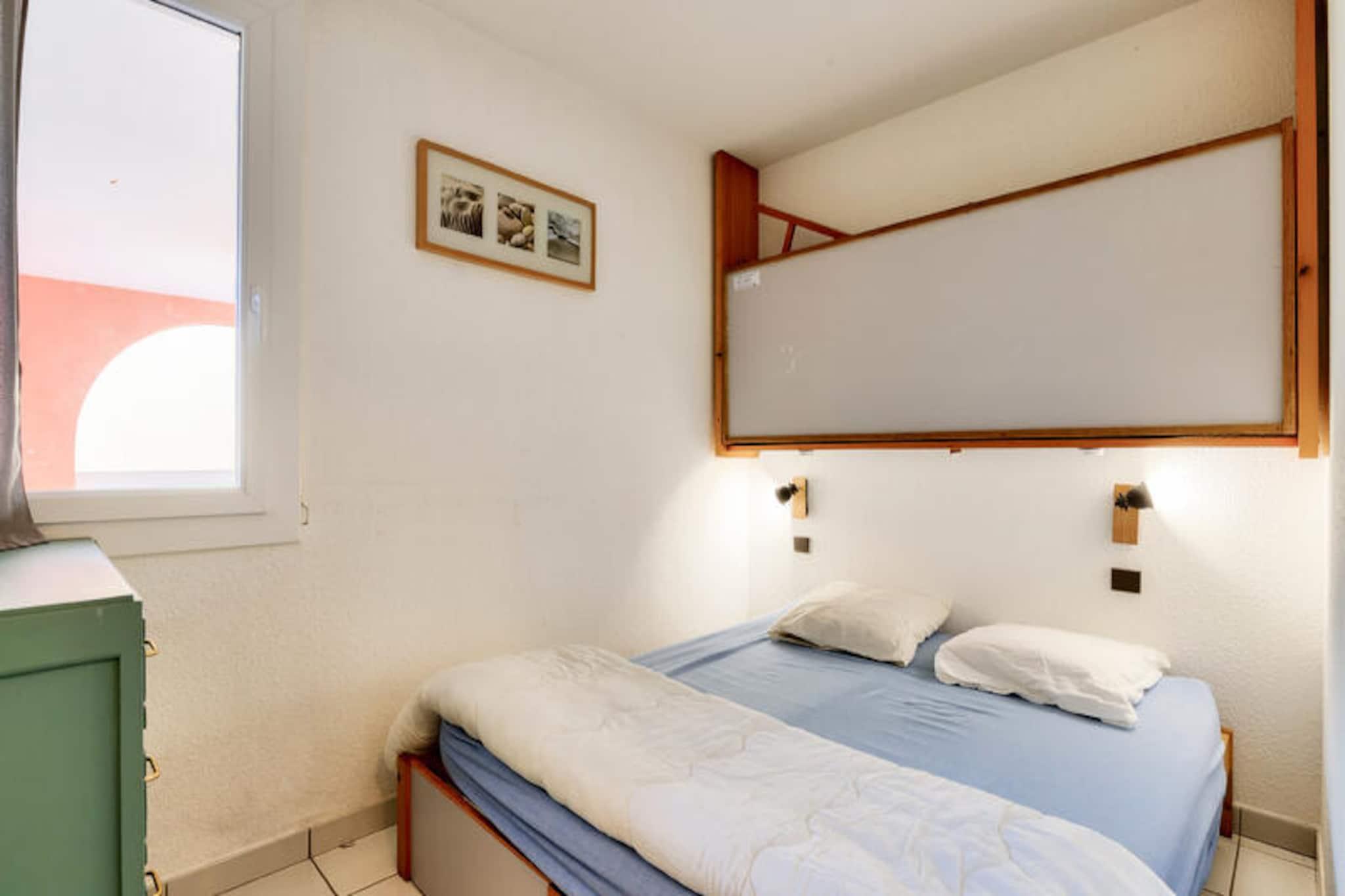 Denne charmerende ferielejlighed er ideel til op til 5 gæster og tilbyder et komfortabelt ophold med et soveværelse med dobbeltseng, et kabineområde med køjesenge, en stue med en sovesofa og et badeværelse med badekar. Lejligheden er kæledyrsvenlig (der kan forekomme ekstra gebyrer), og sengetøj og håndklæder er tilgængelige mod et tillægsgebyr. For ekstra bekvemmelighed opkræves et slutrengøringsgebyr, og parkering er tilgængelig på stedet. Lejligheden har en overdækket terrasse med udsigt over landsbyen, perfekt til at slappe af efter en dag med udforskning. Ejendommen ligger på en 90 hektar stor ejendom omgivet af fyrreskove og tilbyder direkte adgang til havet og kun 2,5 km fra Veillon-stranden, som kan nås til fods, på cykel eller med shuttle. Gæsterne kan nyde en række fritidsaktiviteter, herunder to 18-hullers golfbaner, tennis og minigolf. Boligen har også butikker på stedet, herunder et pizzeria, bageri og isbar, hvilket tilføjer bekvemmelighed og charme til dit ophold. Den nærliggende bymidte byder på yderligere caféer og markeder for en lokal oplevelse. Lejligheden har et semi-åbent køkken udstyret med væsentlige apparater, herunder en mikrobølgeovn og ovn, hvilket gør det nemt at tilberede måltider. Badeværelset har badekar med søjle, og der er god opbevaringsplads til dine ejendele. På stedet finder du opvarmede pools, rutsjebaner og et soppebassin til familiesjov. Med sin førsteklasses beliggenhed og mange faciliteter er denne lejlighed perfekt til en afslappende ferie.