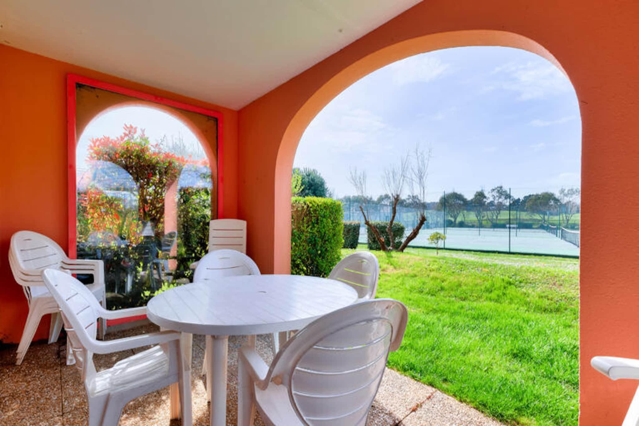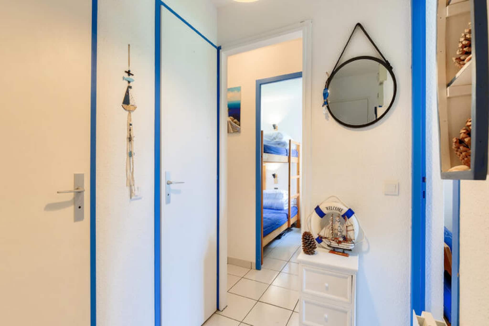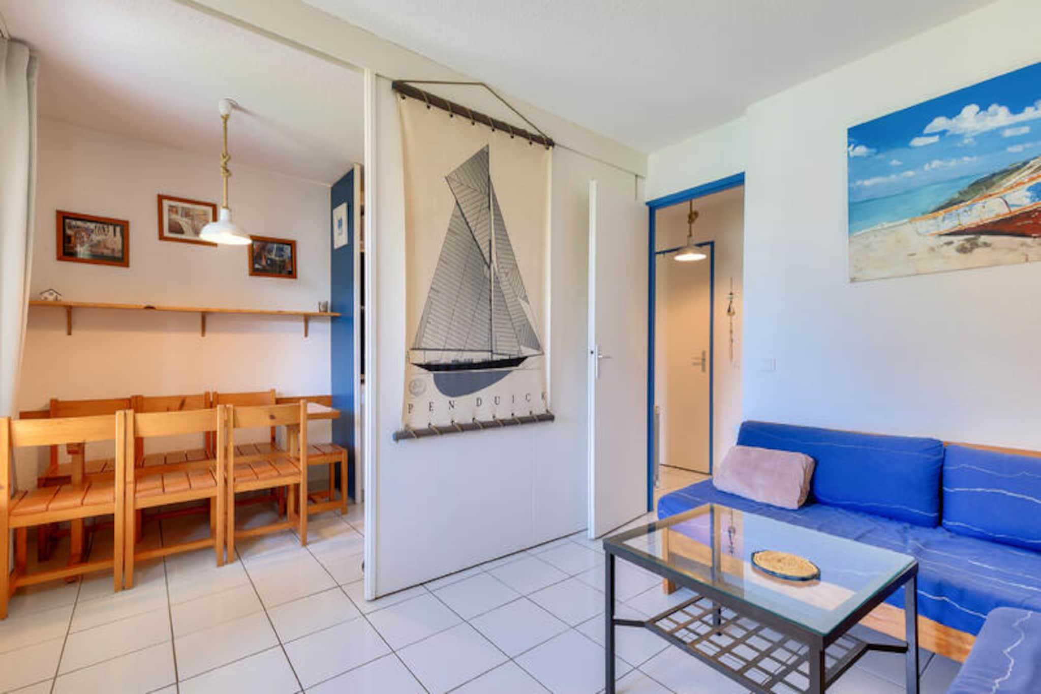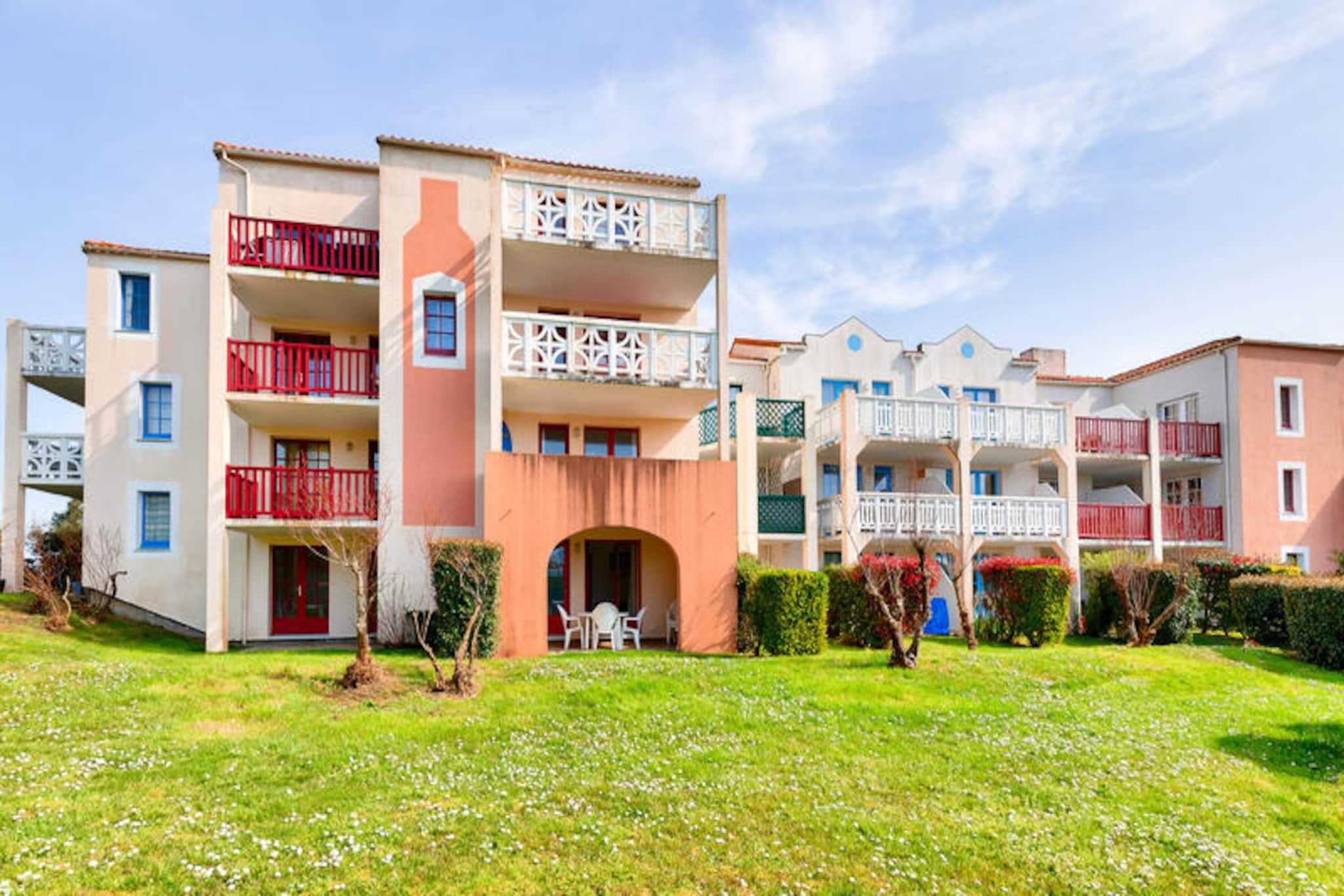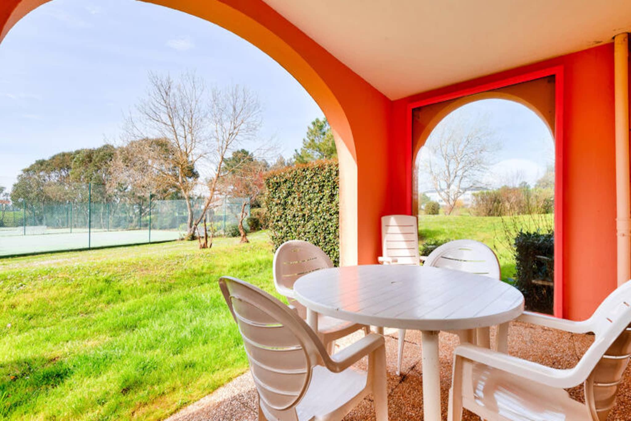 Denne charmerende ferielejlighed er ideel til op til 5 gæster og tilbyder et komfortabelt ophold med et soveværelse med dobbeltseng, et kabineområde med køjesenge, en stue med en sovesofa og et badeværelse med badekar. Lejligheden er kæledyrsvenlig (der kan forekomme ekstra gebyrer), og sengetøj og håndklæder er tilgængelige mod et tillægsgebyr. For ekstra bekvemmelighed opkræves et slutrengøringsgebyr, og parkering er tilgængelig på stedet. Lejligheden har en overdækket terrasse med udsigt over landsbyen, perfekt til at slappe af efter en dag med udforskning. Ejendommen ligger på en 90 hektar stor ejendom omgivet af fyrreskove og tilbyder direkte adgang til havet og kun 2,5 km fra Veillon-stranden, som kan nås til fods, på cykel eller med shuttle. Gæsterne kan nyde en række fritidsaktiviteter, herunder to 18-hullers golfbaner, tennis og minigolf. Boligen har også butikker på stedet, herunder et pizzeria, bageri og isbar, hvilket tilføjer bekvemmelighed og charme til dit ophold. Den nærliggende bymidte byder på yderligere caféer og markeder for en lokal oplevelse. Lejligheden har et semi-åbent køkken udstyret med væsentlige apparater, herunder en mikrobølgeovn og ovn, hvilket gør det nemt at tilberede måltider. Badeværelset har badekar med søjle, og der er god opbevaringsplads til dine ejendele. På stedet finder du opvarmede pools, rutsjebaner og et soppebassin til familiesjov. Med sin førsteklasses beliggenhed og mange faciliteter er denne lejlighed perfekt til en afslappende ferie.