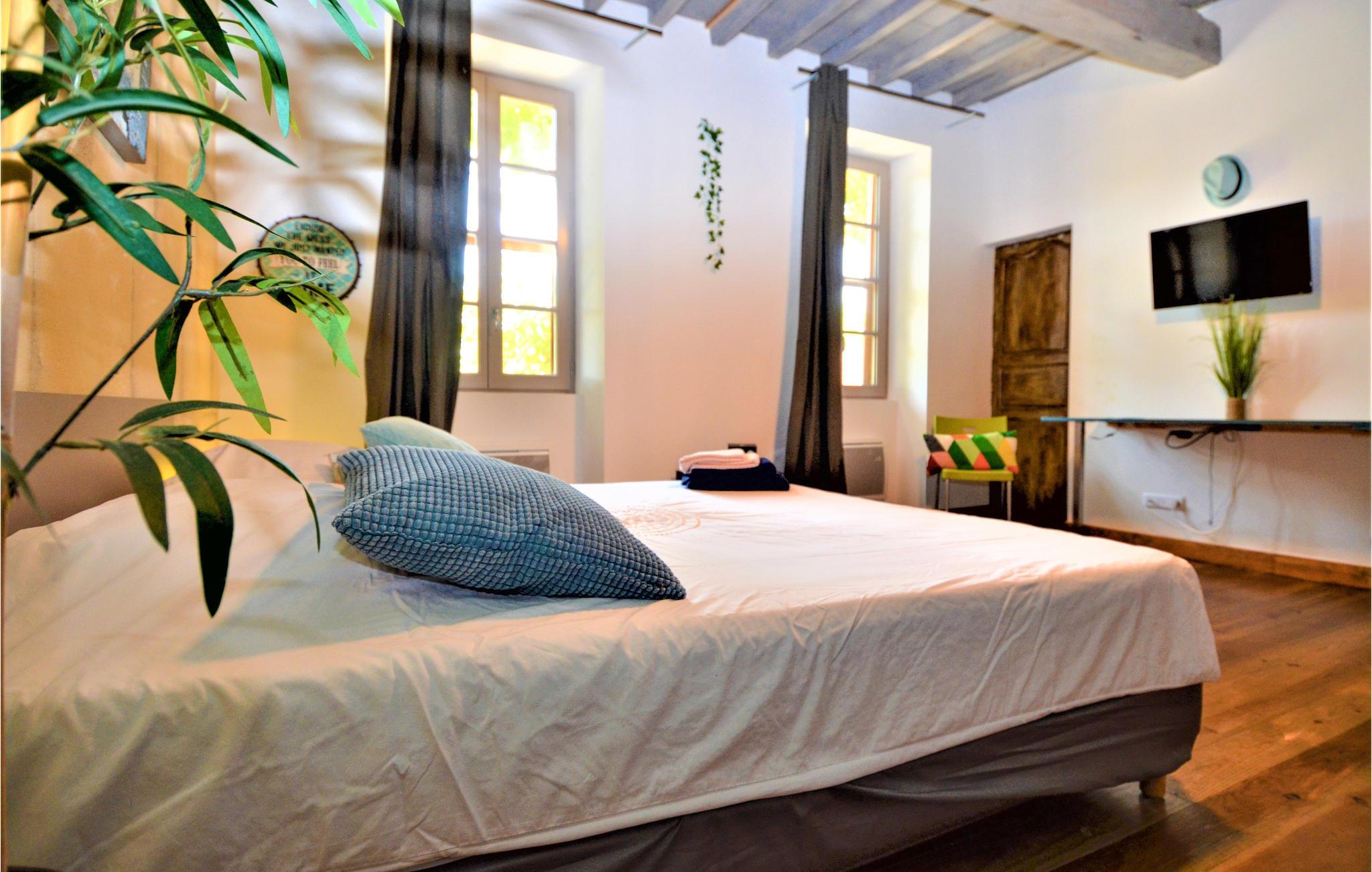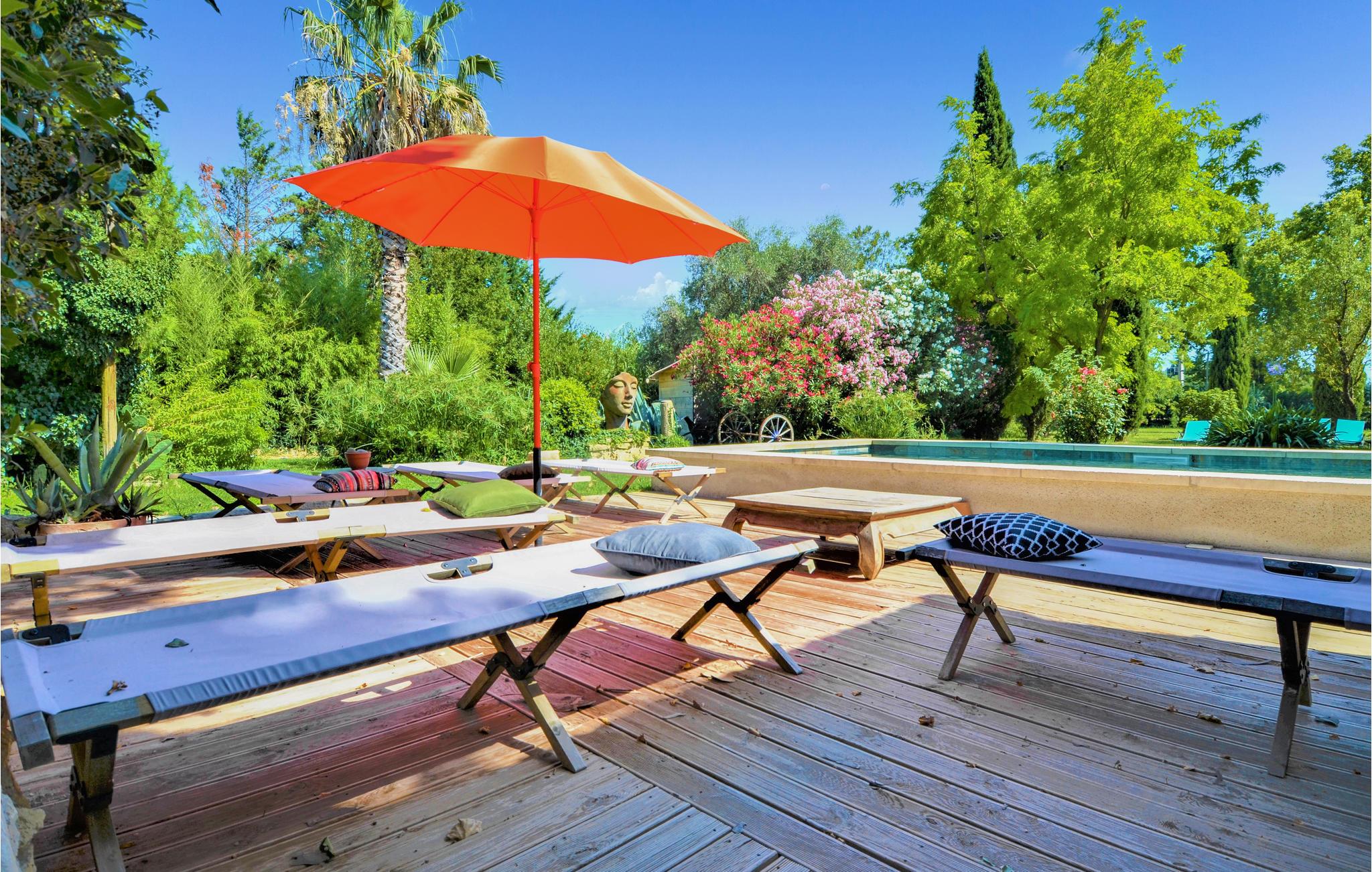Ved ankomsten vil I blive fortryllet af synet af poolen og de store palmer. I tilbringer jeres ferie i en smuk provencalsk bondegård med plads til 14 personer. Soveværelserne er på de øverste etager. Huset har aircondition. I stueetagen venter et stort opholdsområde med åbent køkken og adgang til terrassen og haven.