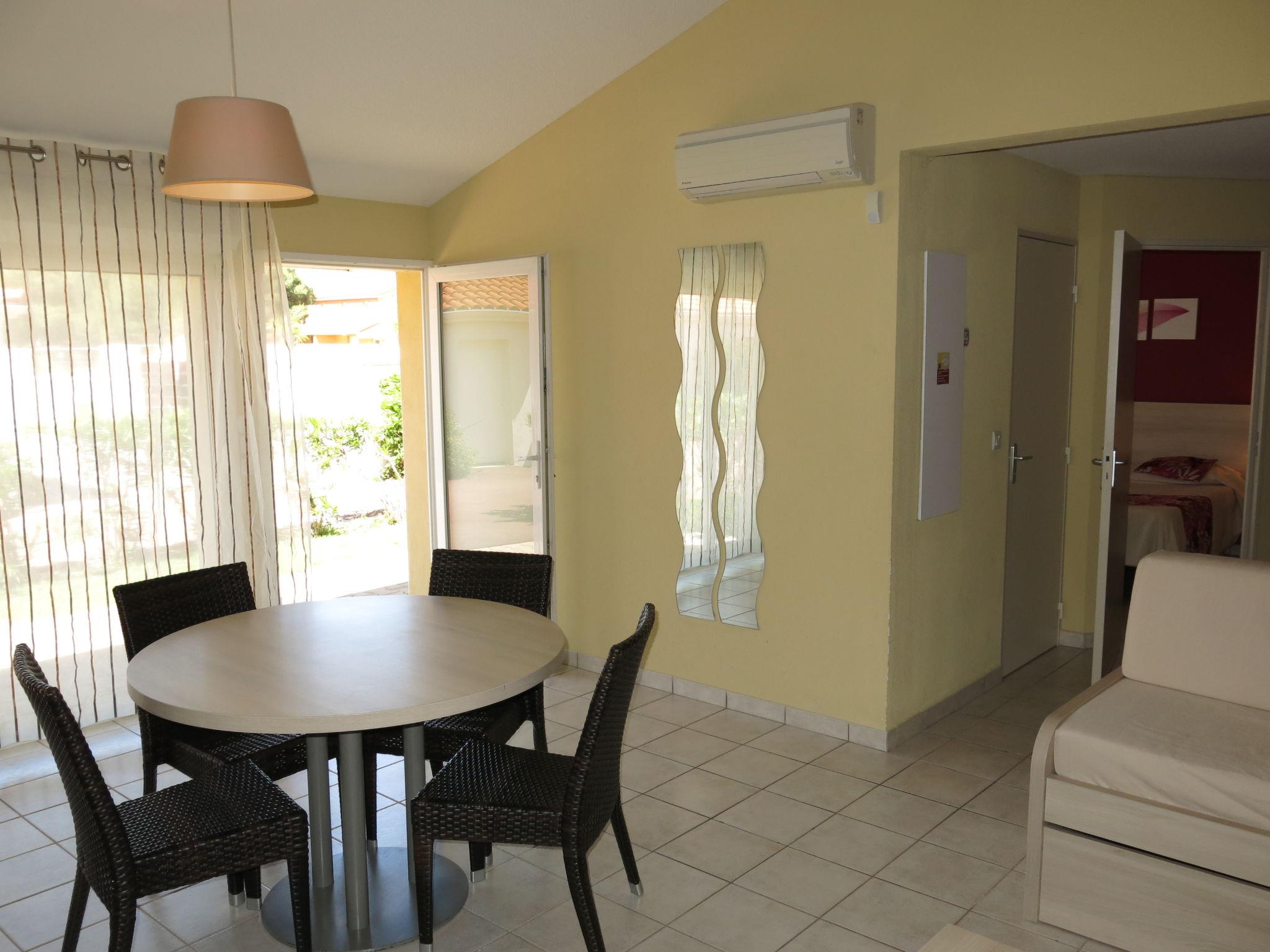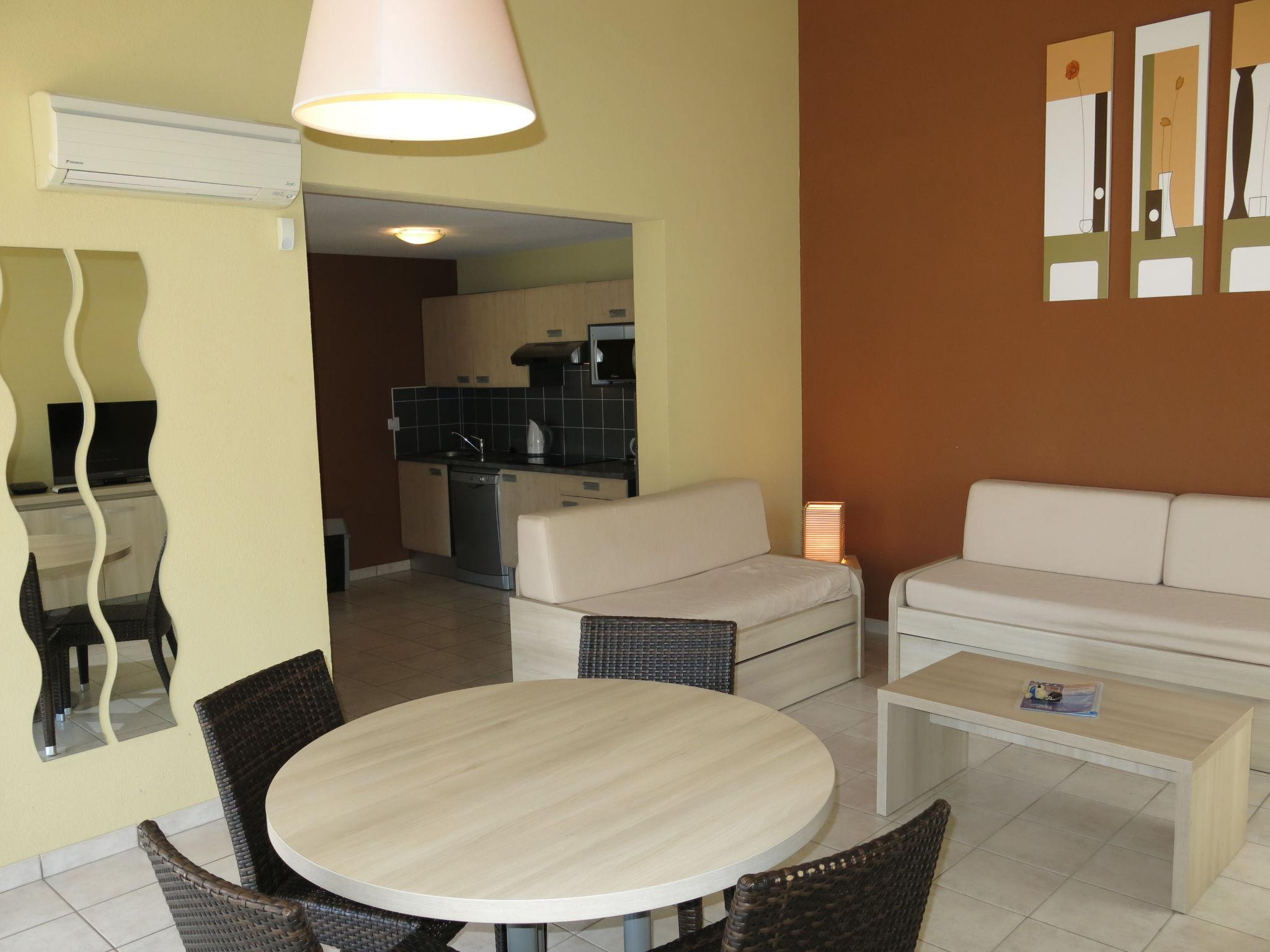 Resort "Le Mas de Torreilles". 84 apartments in the residence. 100 m from the centre of Torreilles-Plage, on the outskirts, 4 km from the centre of Torreilles, 16 km from the centre of Perpignan, 1 km from the sea. For shared use: property (fenced), swimming pool (150 m2, seasonal availability: 15.Apr. - 15.Oct.). WC in the pool area, children's pool, outdoor shower, table tennis, boccia, children's playground. In the complex: reception, bar, bistro, sauna (extra). Fitness room, massage (extra). Steam room (extra). Table tennis, central heating system, washing machine (for shared use, extra). Bread roll service. Parking. Shop 1 km, supermarket 4 km, bus stop "St Julien" 1.8 km, railway station "Perpignan" 25 km, sandy beach 1 km. Please note: entertainment in the season. Childminding in the season. The photograph shows a typical example. The holiday properties may differ in living space, floorplan, equipment and furnishing. No access for children and teenagers under 18 years to the fitness room and the wellness area with sauna and steam bath.