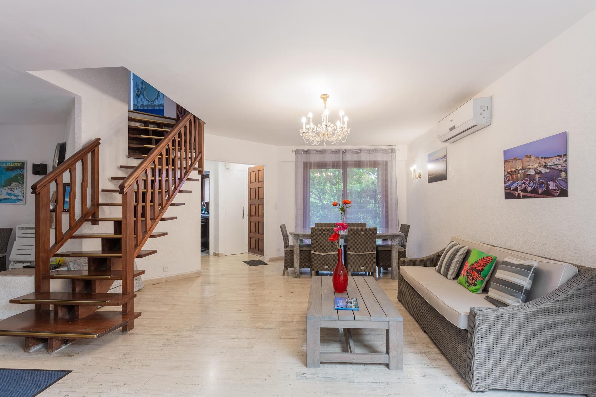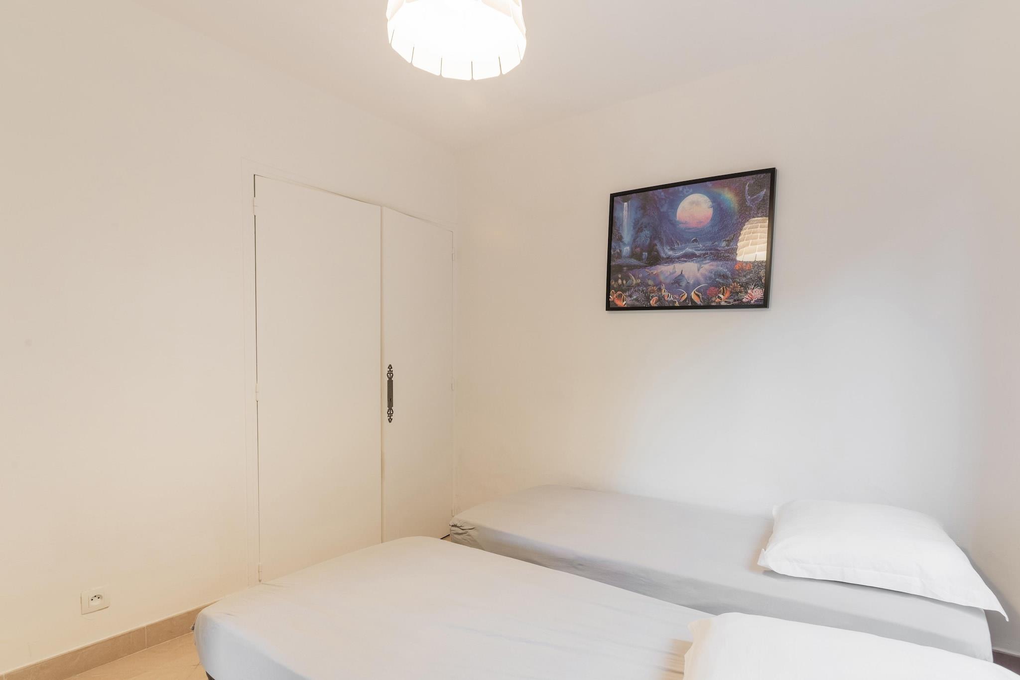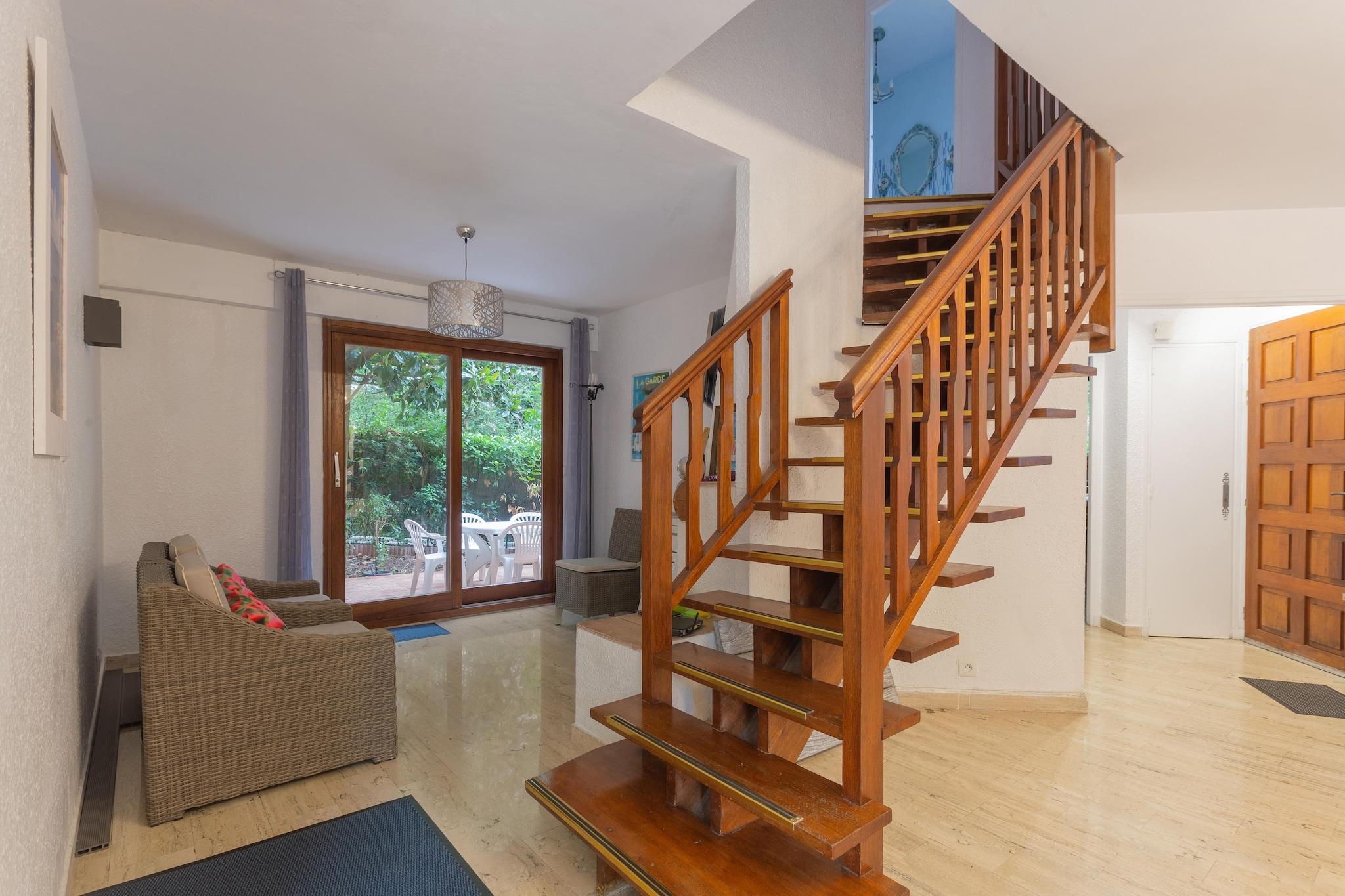 Dette veludstyrede feriehus i Var er ideelt til en familie. Ejendommen har en fælles swimmingpool, en fælles tennisbane og ligger i gåafstand fra stranden. Du kan nyde lange gåture på stranden eller vandsport, kun 1 km væk. Gå ud til restauranterne eller besøg supermarkedet 0,5 km væk. Et spil golf kan nydes 15 km derfra. Chapelle Notre Dame du Cap Falcon er placeret for enden af Cap Brun, midt i en statue af Jomfruen, fantastisk udsigtspunkt, der omfavner havnen i TOULON, og bugter til dykning! La Calanque og L"ESCALE er de populære restauranter! Feriehuset har en rummelig opholdsstue med tv, dvd-afspiller og aircondition. Du kan tilbringe en aktiv dag med at spille tennis på tennisbanen. En privat indhegnet have giver dig mulighed for at slappe af midt i naturen Parkering på gaden er gratis Parkeringspladser i boligen er efter først-til-mølle princippet Deponer skraldespandene + sortering i det dedikerede teknikrum i ejerlejligheden.Nærmeste lufthavn ligger 15 km væk.