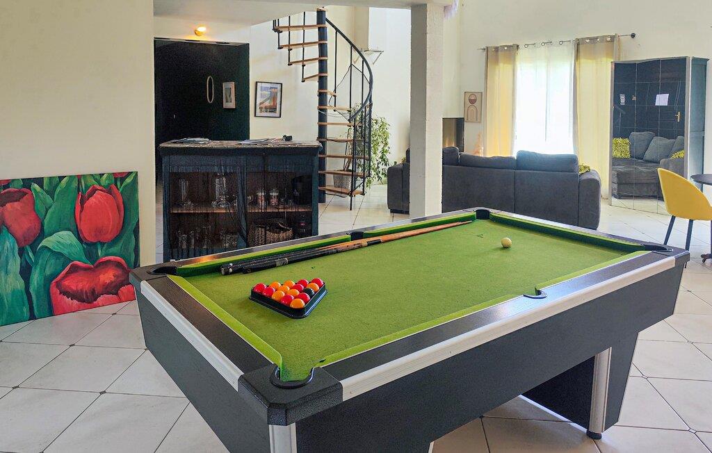 Dette moderne indrettede feriehus i landlige omgivelser har et lyst og rummeligt interiør, der tilbyder masser af plads til afslappende dage med familien. Planlæg jeres aktiviteter over harmoniske måltider, konkurrer ved poolbordet, og afslut en begivenhedsrig dag med en sjov spilleaften på den behagelige sofa.