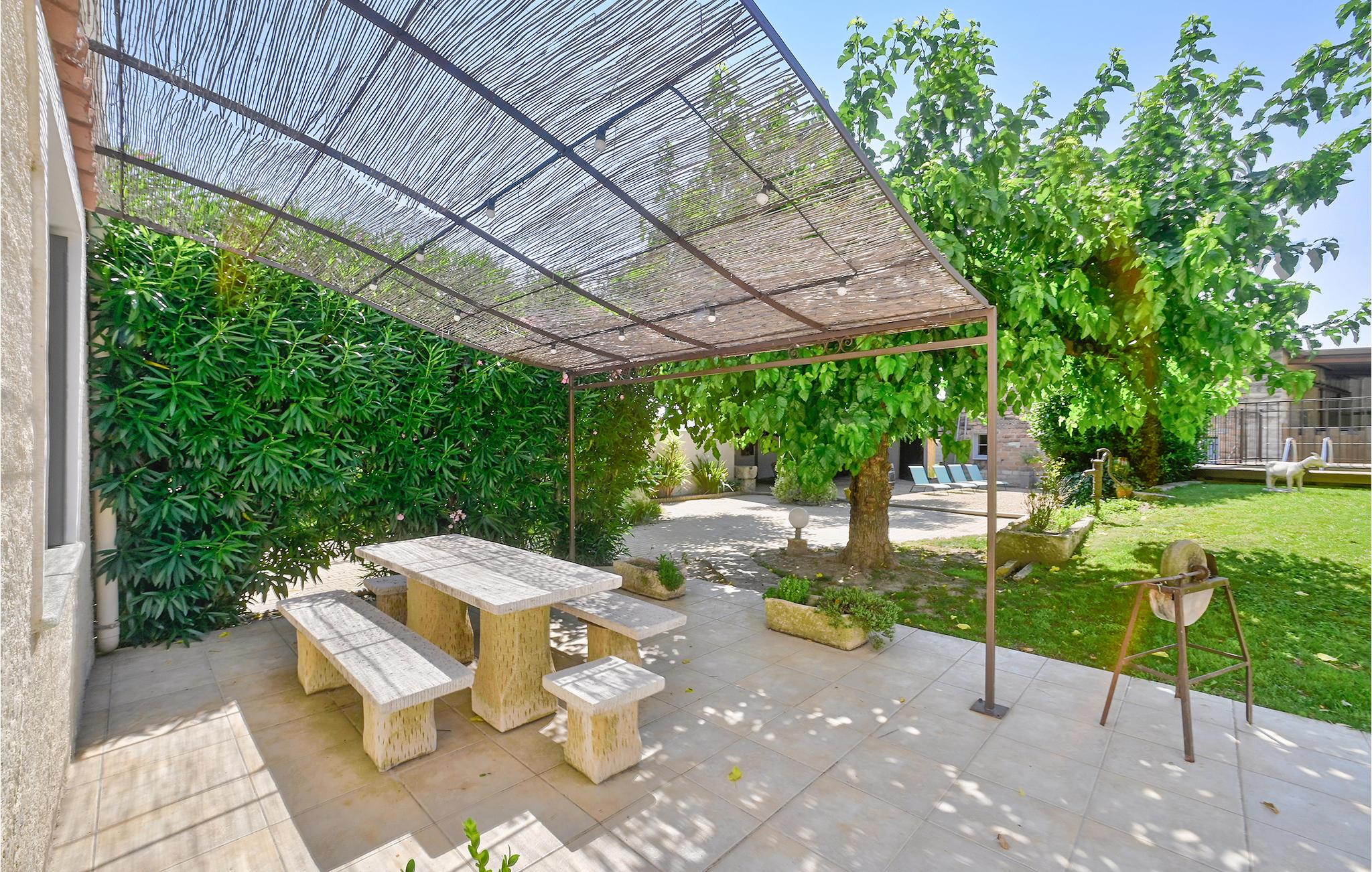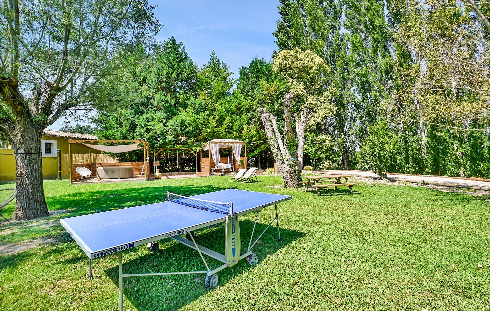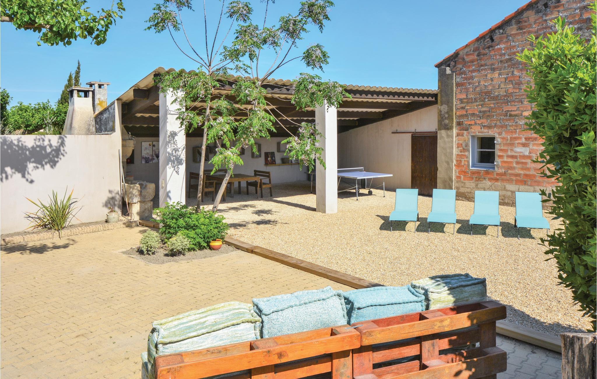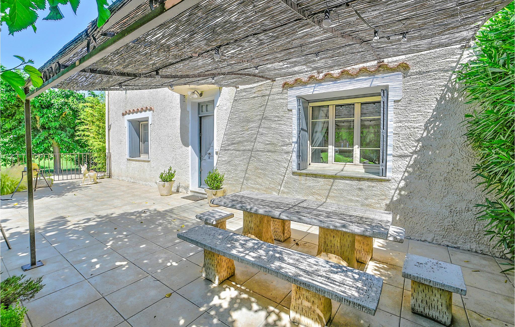 Til boligen hører en lille balkon, en åben terrasse til solbadning og en stor overdækket terrasse. Begge terrasser støder op til jeres private pool. I soveværelset i stueplan er der et hyggeligt siddehjørne. Af og til hører I en traktor tøffe forbi – men til gengæld kan I få udleveret frisk frugt fra husets ejer. I nærheden kan I besøge: Avignon (23 km), Saint-Rémy-de-Provence (21 km), Beaucaire (7 km), Nîmes (30 km), Arles (22 km) og Les Baux-de-Provence (22 km). I kan gå pragtfulde ture i Alpillerne og i den nærliggende by (2,5 km) er det gratis at spille tennis. Her er også en skaterpark og en lille sø.