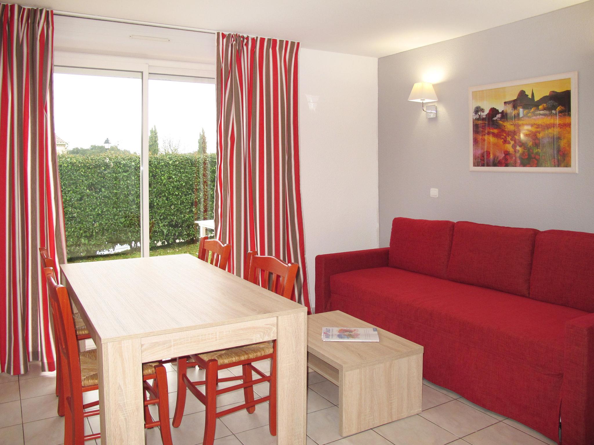 "Odalys Référence Les Hauts de Salavas", 2-room apartment 28 m2. Object suitable for 4 adults + 1 child. Bright, practical furnishings: living/sleeping room with 1 sofabed, 1 pull-out bed, dining table and TV. 1 room with 1 x 1 bunk beds, 2 sleeping facilities. Kitchenette (4 hot plates, dishwasher, microwave, electric coffee machine). Shower/WC. Electric heating. Balcony or terrace. Balcony furniture. Facilities: children's high chair, baby cot. Internet (WiFi, extra). Please note: non-smokers only. Maximum 1 pet/ dog allowed. Smoke alarm.