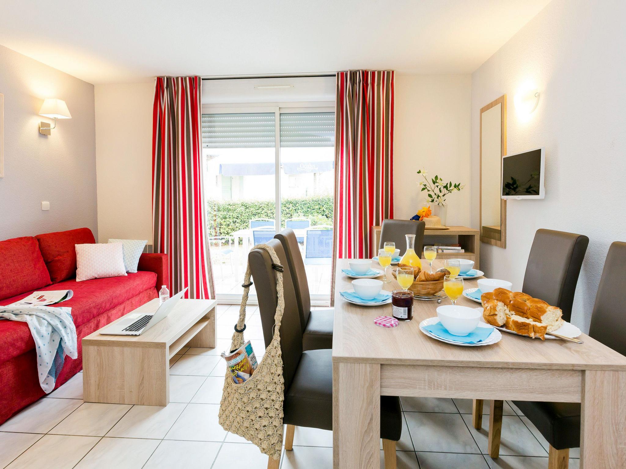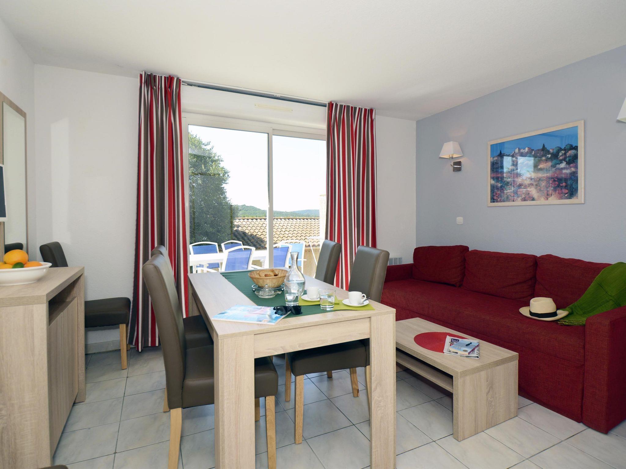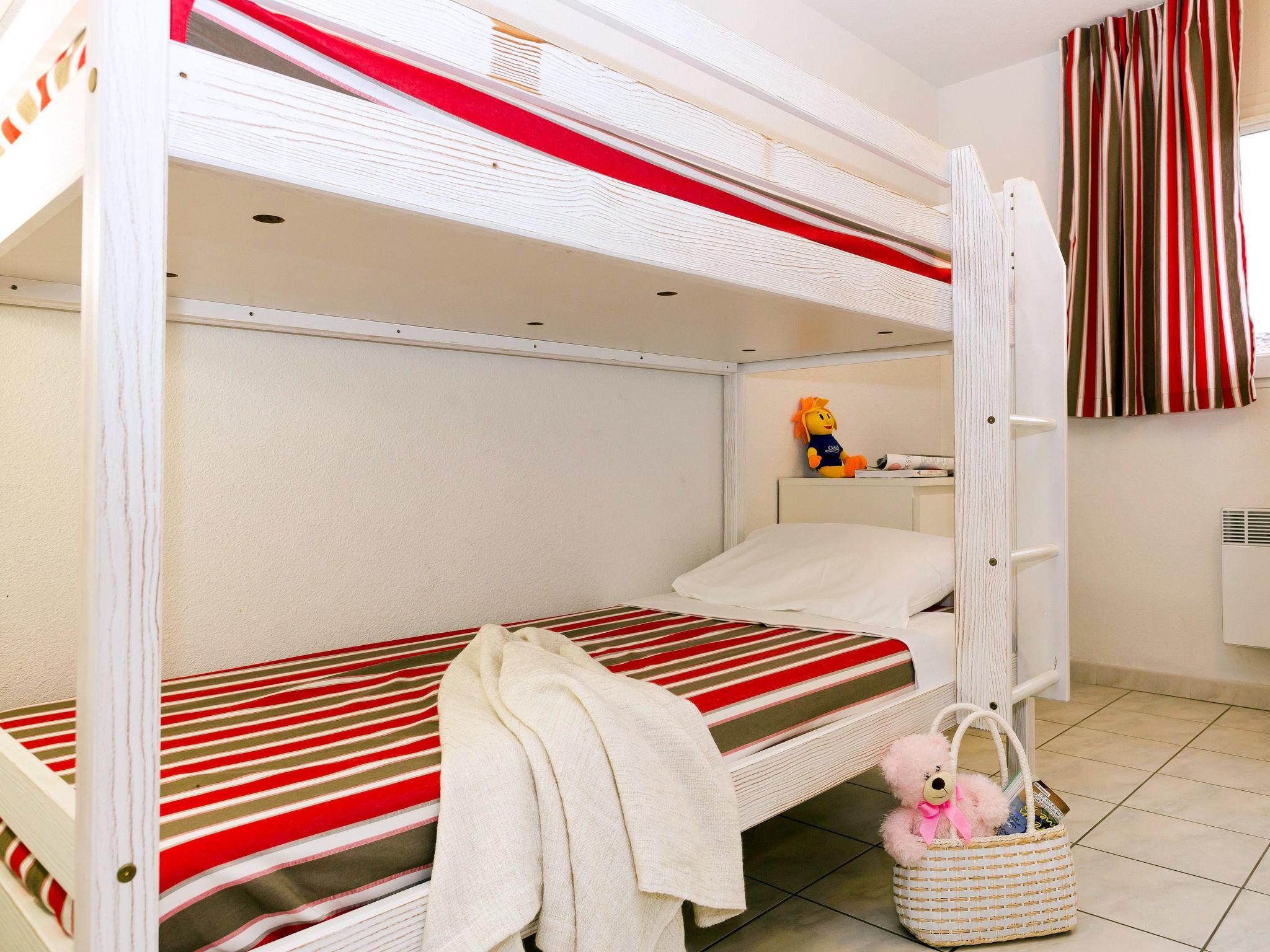 "Odalys Référence Les Hauts de Salavas", 4-room terraced house 44 m2 on 2 levels. Object suitable for 7 adults. Bright, practical furnishings: living/sleeping room with 1 sofabeds, 1 pull-out beds, dining table and TV. Alcove with 1 x 2 bunk beds. Kitchenette (4 hot plates, dishwasher, microwave, electric coffee machine). Sep. WC. Upper floor: 2 rooms, each room with 2 sleeping facilities. Bath/WC. Electric heating. Terrace. Terrace furniture. Facilities: children's high chair, baby cot. Internet (WiFi, extra). Please note: non-smokers only. Maximum 1 pet/ dog allowed. Smoke alarm. Instead of an enclosed bedroom, some sleeping areas are located in an open-plan area (gallery, alcove, etc.).