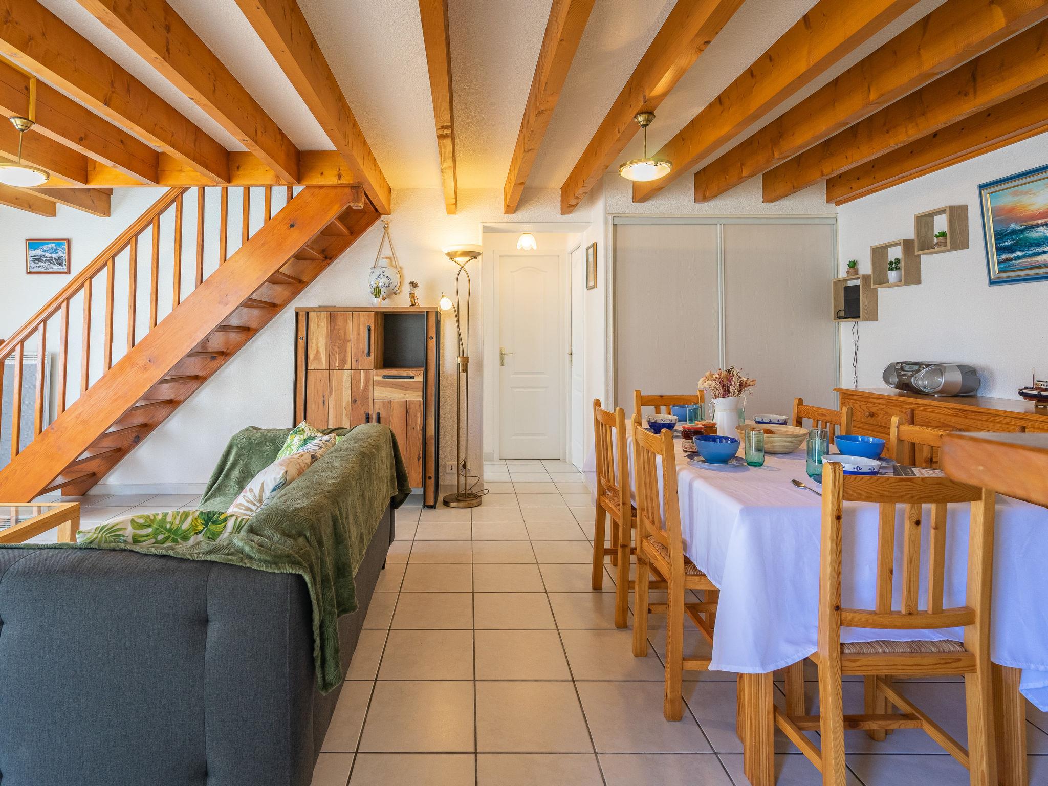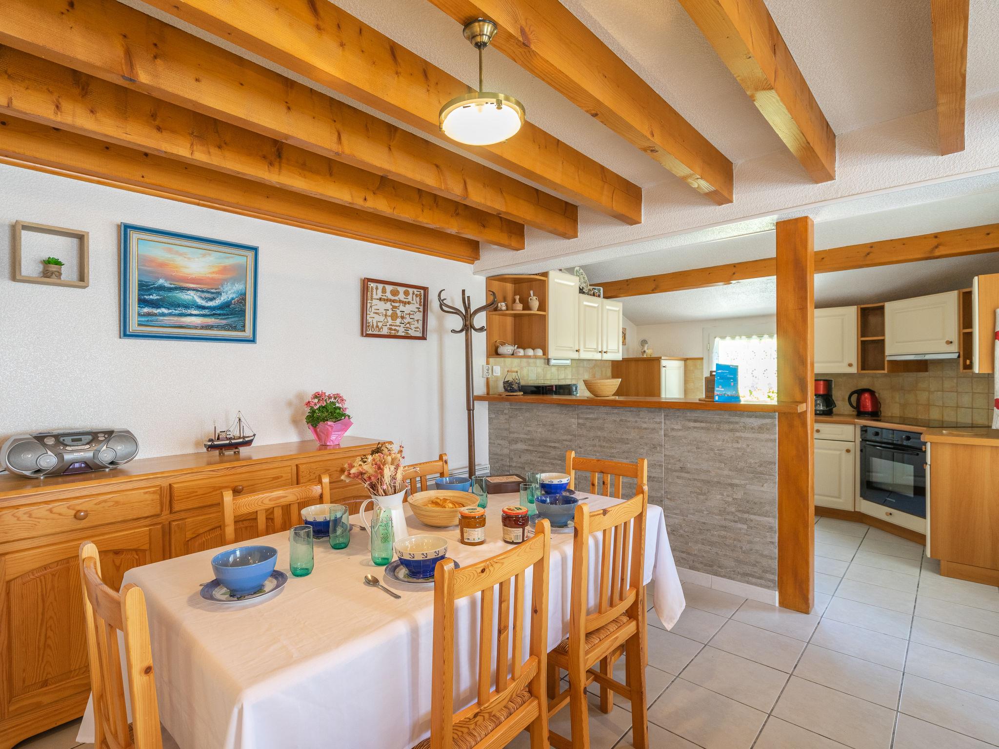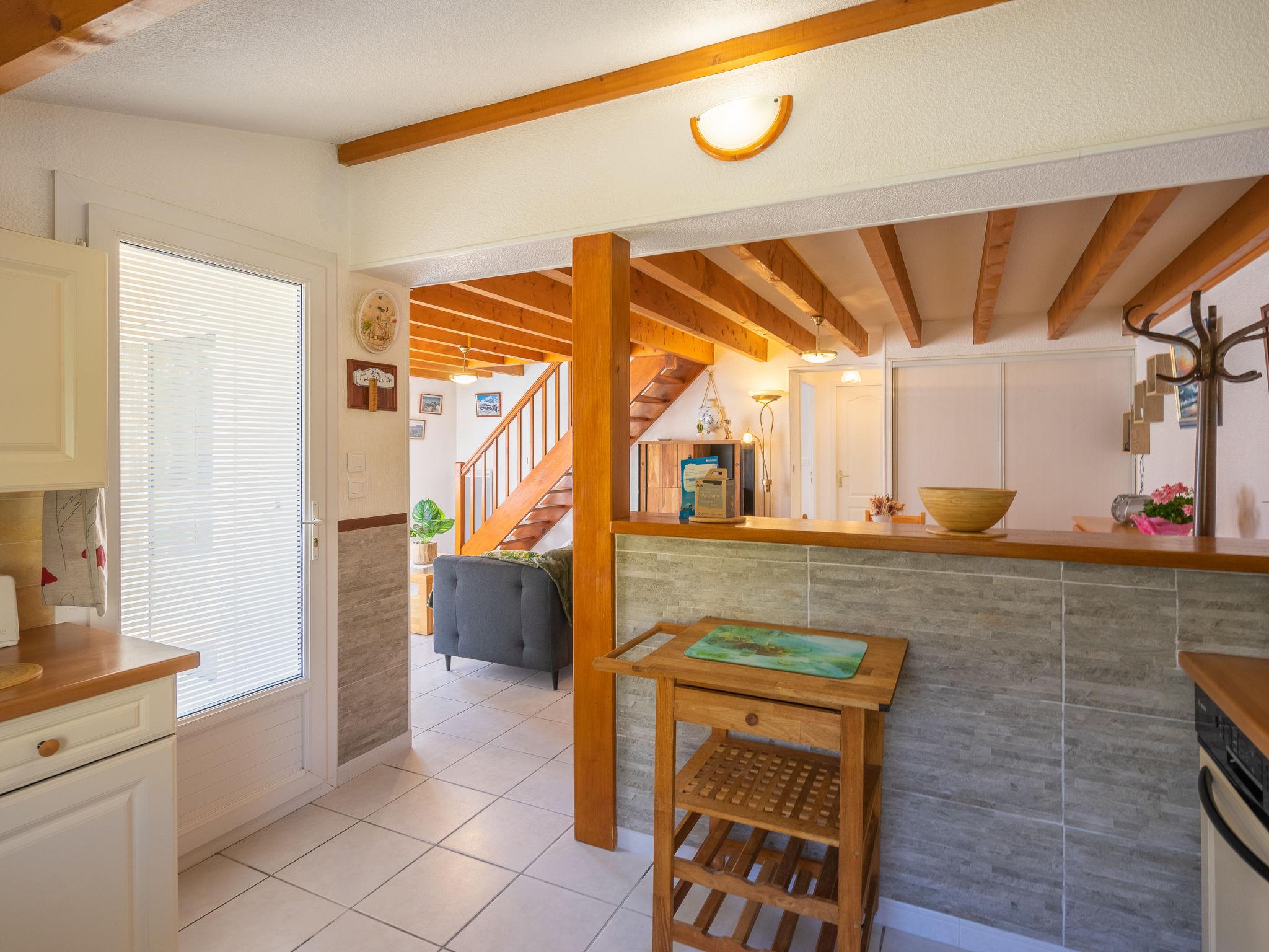 4-room house 70 m2 on 2 levels. Comfortable furnishings: living/dining room with TV (flat screen). Exit to the terrace. 1 room with 1 french bed (1 x 140 cm, length 190 cm). Open kitchen (oven, dishwasher, 4 ceramic glass hob hotplates, microwave, electric coffee machine). Bathroom, sep. WC. Electric heating. Upper floor: 2 rooms, each room with 1 french bed (1 x 140 cm, length 190 cm). Terrace furniture. Facilities: washing machine, iron. Internet (WiFi, free). Parking (2 cars). Please note: smoke alarm.