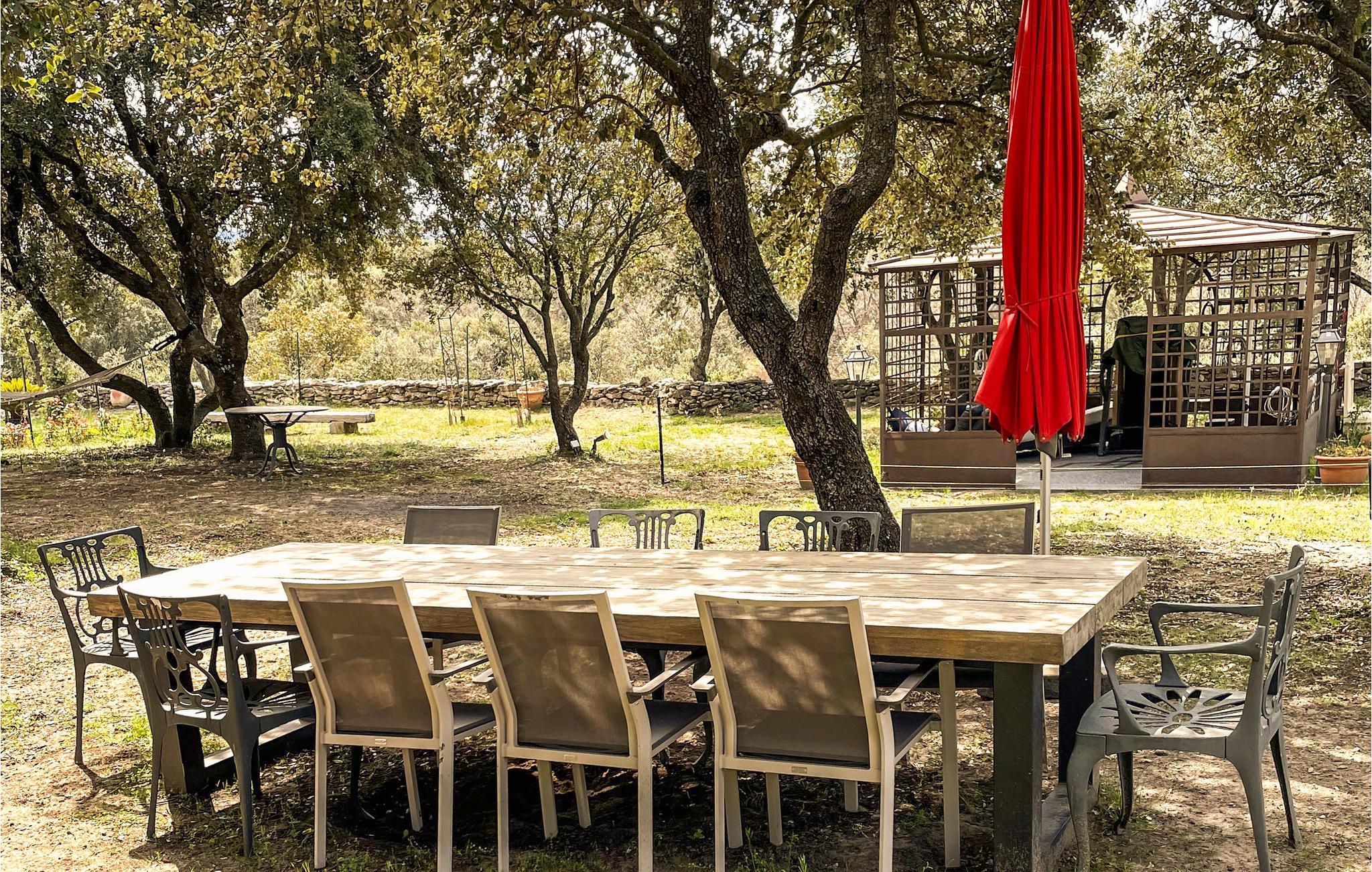 Velkommen til dette veludstyrede feriehus, hvor der er god plads til en stor gruppe venner eller en storfamilie. Her kommer I ikke til at mangle noget i en bolig, der kombinerer landlig charme med komfort. Læn jer godt tilbage og slap af på den store grund. Snup en dukkert i poolen, som ligger helt privat eller få sved på panden på fitnessmaskinen. Dæk op på det lange bord til en stor middag under træerne og glæd jer til en uforlignelig atmosfære.