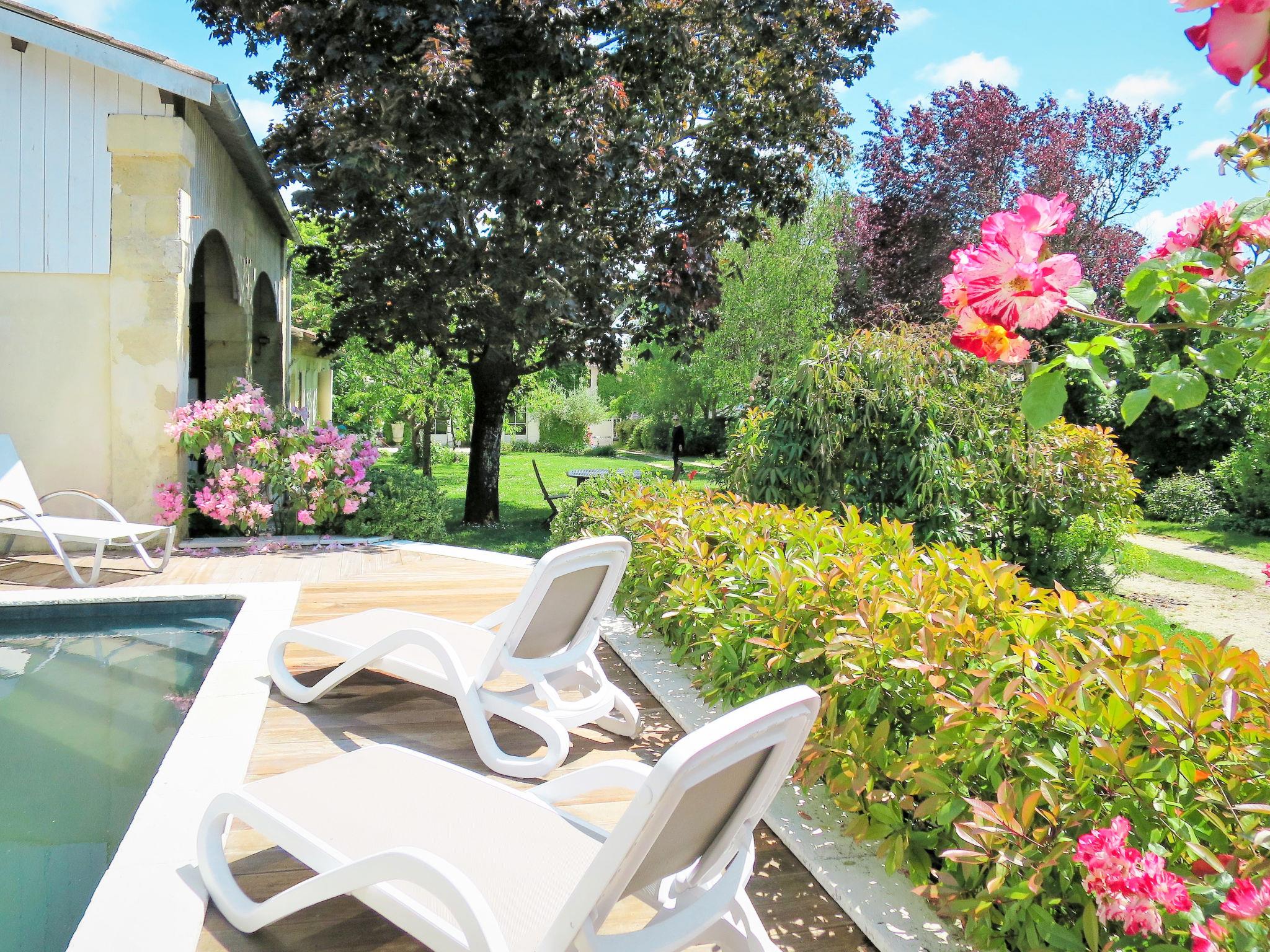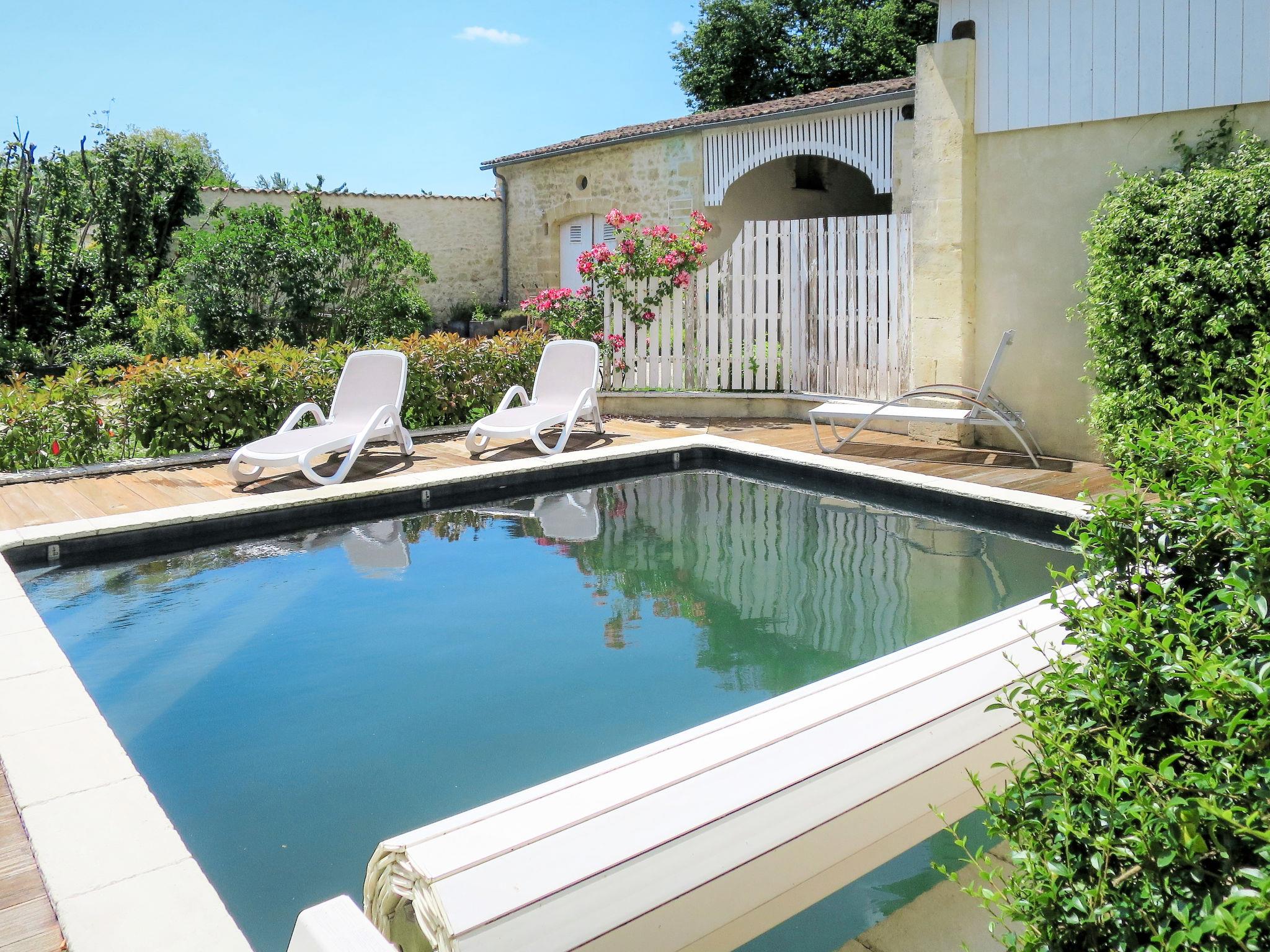 Beautiful, cosy single-family house "La Vertheuillaise". 200 m from the centre of Vertheuil, 12 km from the centre of Lesparre, 12 km from the centre of Pauillac, in the residential district, 32 km from the sea, 9 km from the river. For shared use: garden 1'800 m2 (fenced) with plants and trees, meadow. Private: swimming pool (5 x 5 m, depth 170 cm, seasonal availability: 01.Jun. - 30.Sep.). Terrace, garden furniture, pool maintenance by the owner/gardener. Parking (for 2 cars) at the house on the premises. Supermarket 200 m, bus stop "Bourg" 250 m, sandy beach "Naujac-sur-Mer, Hourtin-Plage" 32 km. Please note: residence with electric gates. The owner lives on the same property.