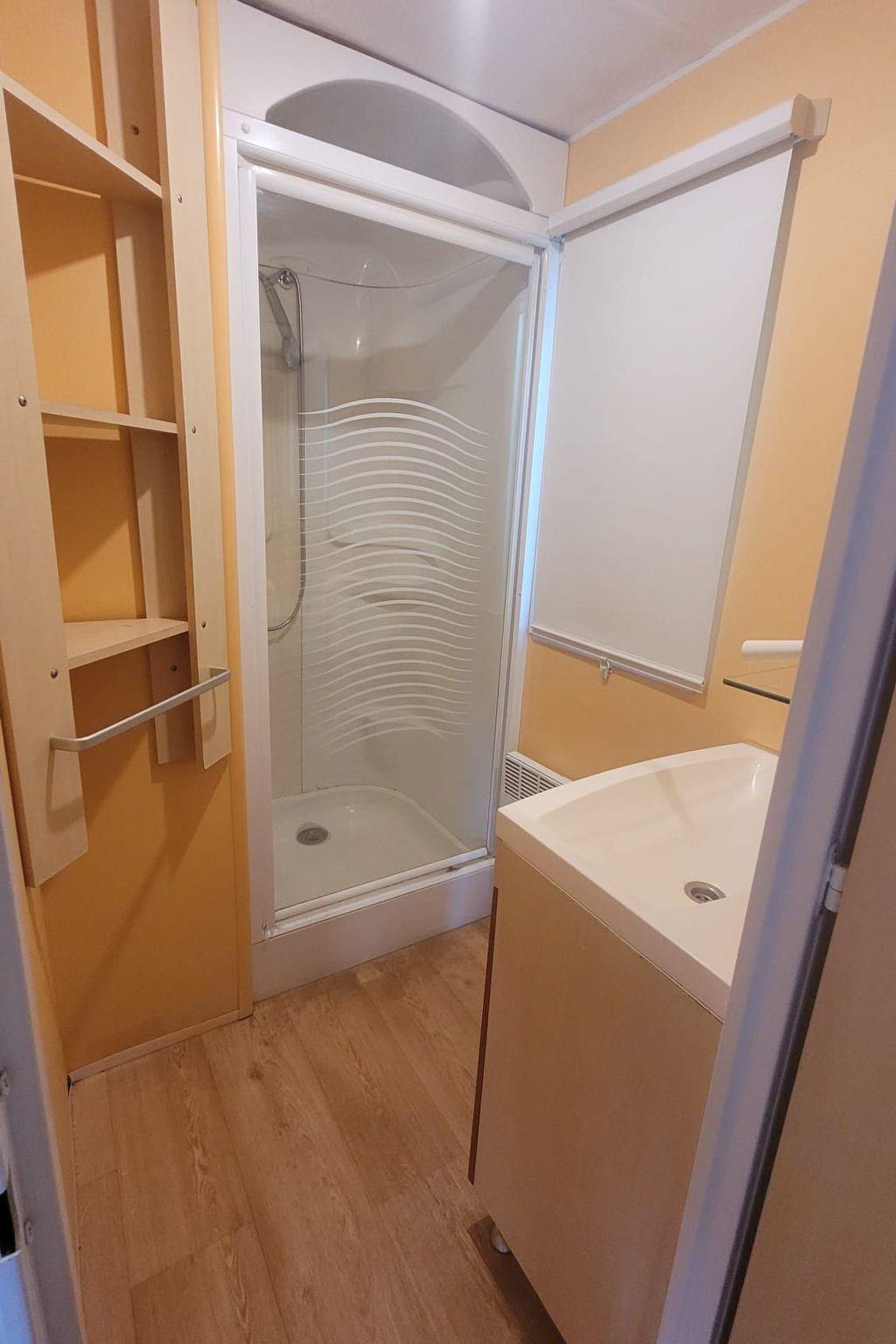 Mobile home IRM 29 m2, air conditioning. 2 bedrooms suitable for 4-5 pers. 1 bedroom with double bed and 1 bedroom with 2 single beds. Lounge area converts into fifth bed. Wooden terrace with garden furniture and party tent.