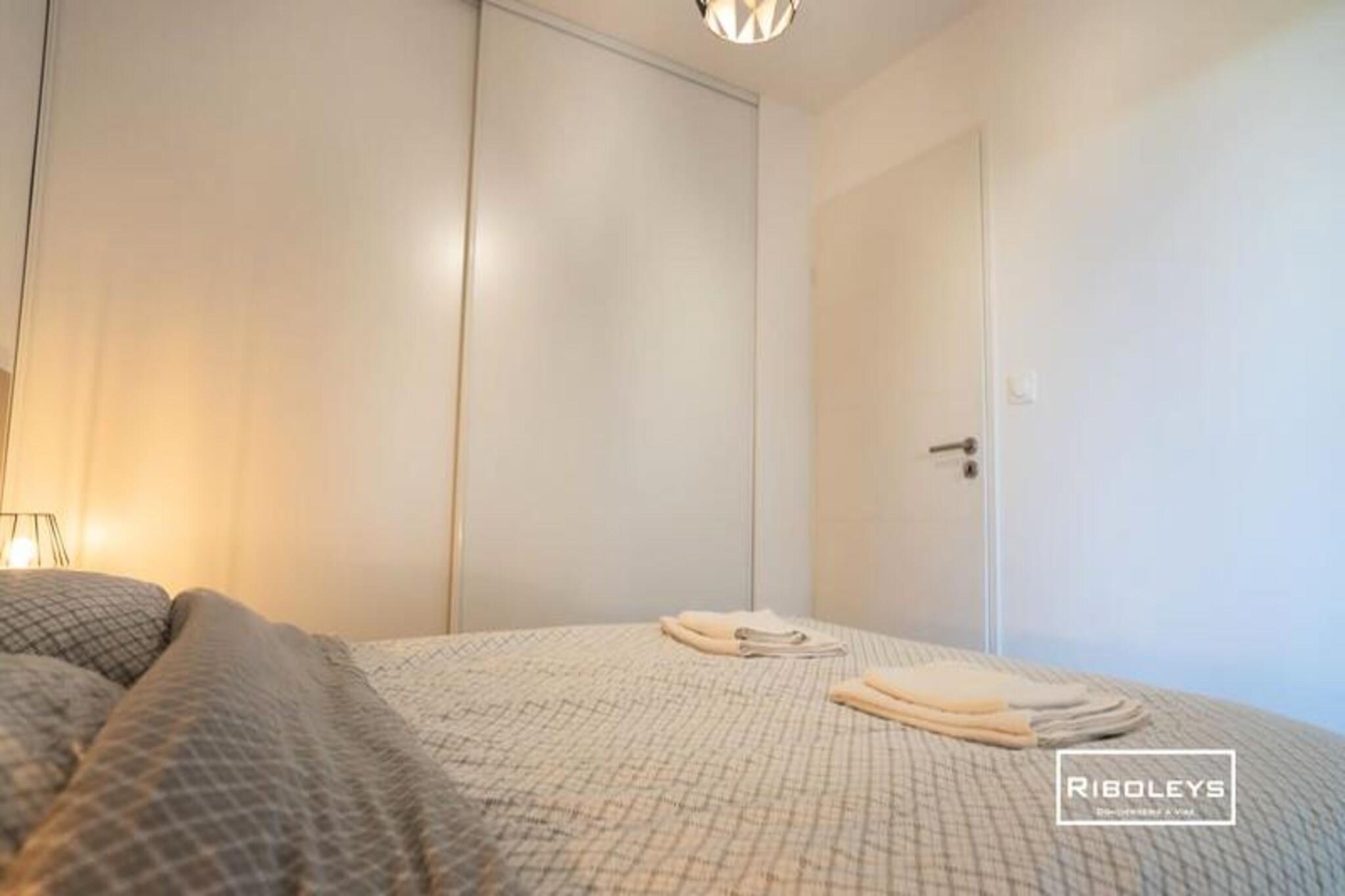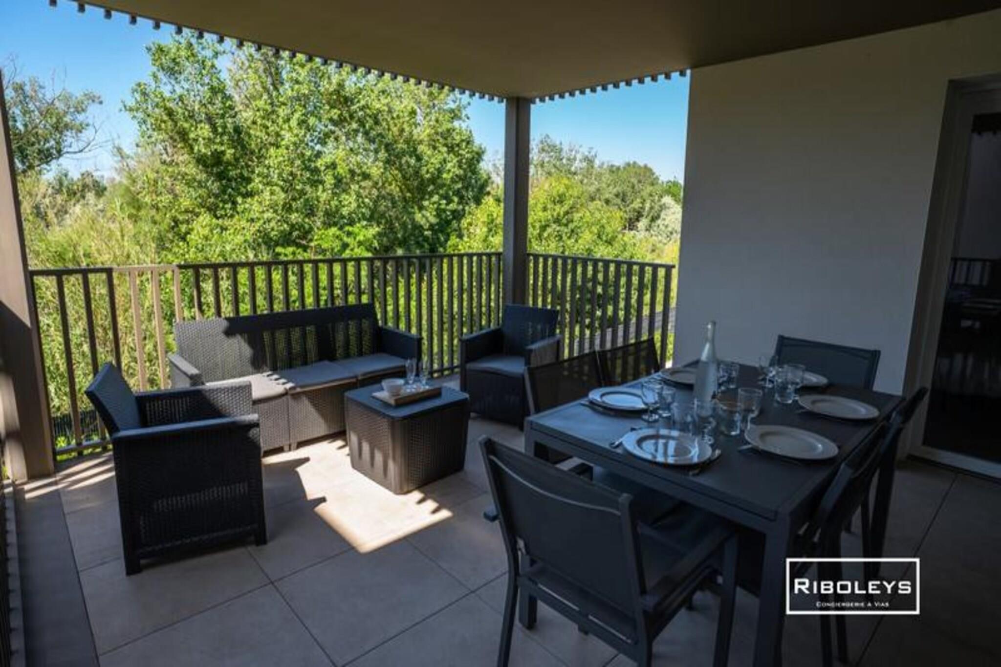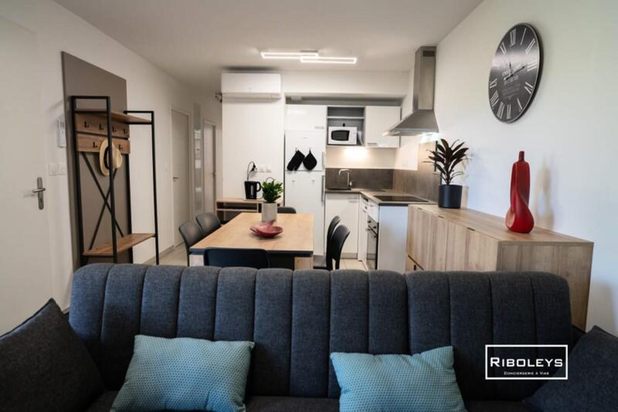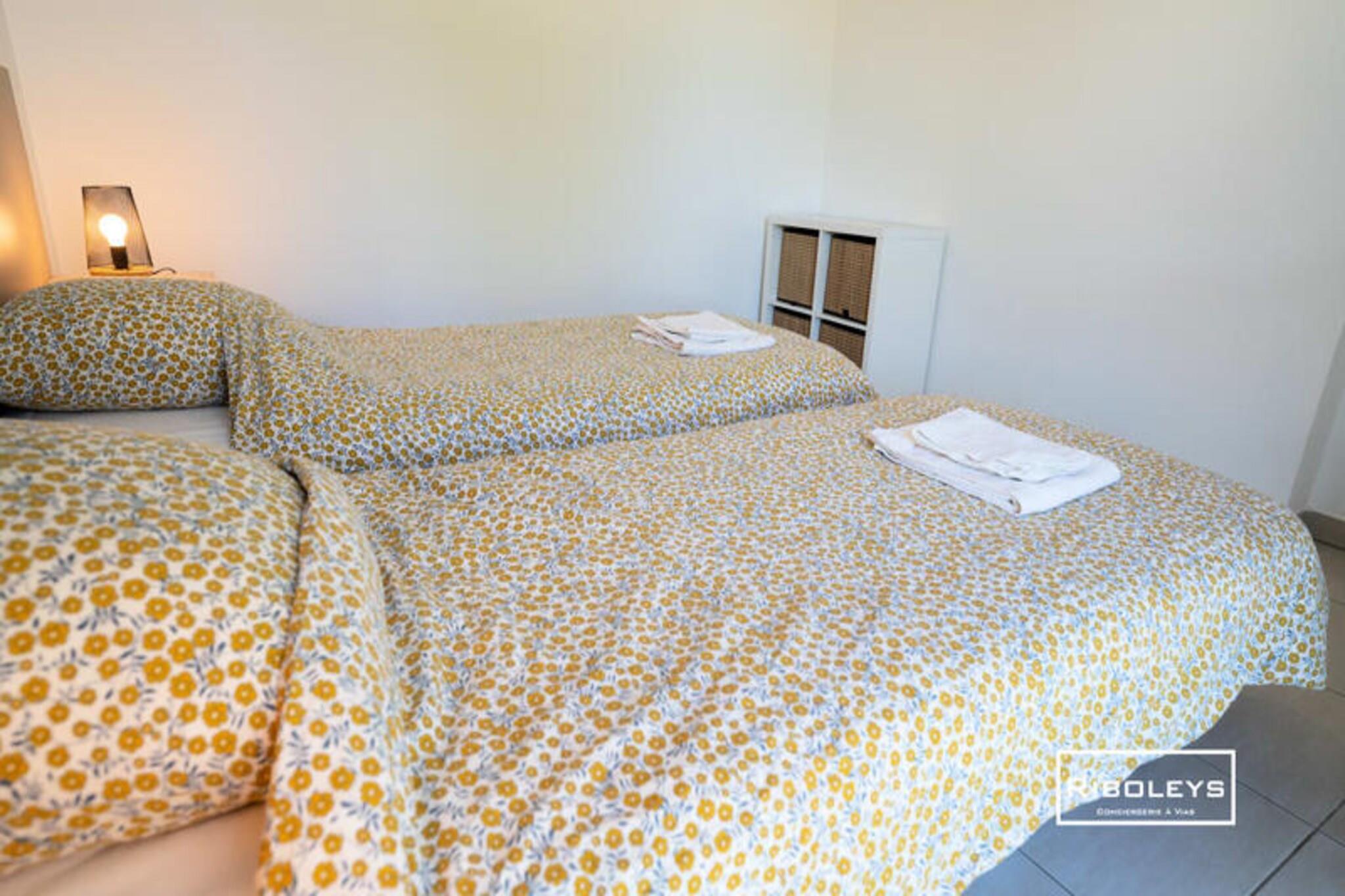 Denne charmerende lejlighed på 63 m² i Vias Plage er perfekt til familier. Det har tre soveværelser: to med dobbeltsenge og et med to enkeltsenge. Nyd den rummelige 17 m² store terrasse med udsigt over et grønt område, ideel til afslapning. Lejligheden er ikke kæledyrsvenlig. Oplev den pulserende atmosfære i Vias Plage! Udforsk de smukke strande, besøg kunstgalleriet André Malraux og slentre langs Canal du Midi. Nyd vandsport såsom dykning, sejlads og jetski. Oplev lokale markeder, charmerende caféer og en række restauranter. Denne moderne lejlighed tilbyder komfortabel opholdsstue med et fuldt udstyret køkken, to private parkeringspladser og en sikker cykelgarage. Beboerne har adgang til en fælles swimmingpool i sommermånederne.