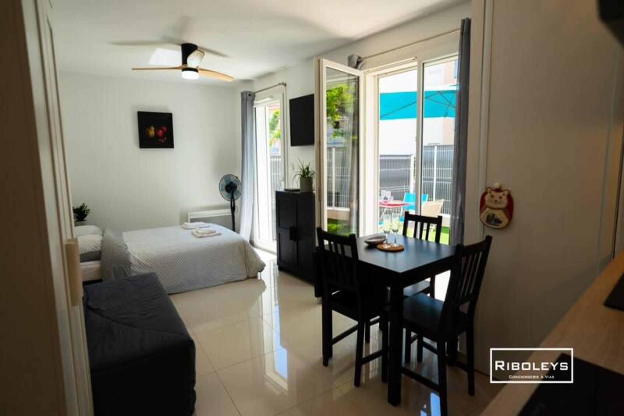 Denne charmerende lejlighed i stueetagen ligger kun 100 meter fra stranden og tilbyder komfortabel indkvartering for op til 4 gæster. Det har en stue med to sovesofaer, et spisebord og et veludstyret køkken. Det rummelige badeværelse har brusekabine, vaskemaskine og toilet. Kæledyr er velkomne mod et tillægsgebyr, og ejendommen inkluderer en privat, nummereret parkeringsplads. Lejligheden er beliggende i hjertet af Vias, en dynamisk badeby kendt for sine 5 km fine sandstrande og traditionelle markeder. Besøgende kan nyde aktiviteter som at udforske André Malrauxs kunstgalleri, slentre langs Canal du Midi og cykle langs naturskønne ruter. Området byder på forskellige vandsportsaktiviteter såsom dykning, sejlads og jetski. I nærheden finder du en række restauranter, barer og butikker samt nem adgang til Vias' strande via cykelstier eller parkering. Lejligheden har en privat have og terrasse, perfekt til at nyde middelhavsklimaet. Det fuldt udstyrede køkken og vaskemaskine gør det nemt at føle sig hjemme under dit ophold. Hvis det foretrækkes, kan senge- og håndklædesæt reserveres mod et ekstra gebyr, og rengøringsservice er tilgængelig efter anmodning til en fast pris.