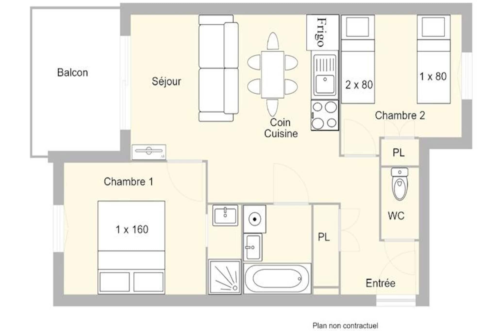 I den fredfyldte omfavnelse af Beaufortain-bjergene tilbyder denne elegante lejlighed en perfekt blanding af alpin charme og moderne komfort. Beliggende kun 5,6 km fra hjertet af Les Saisies, kan ejendommen prale af en opvarmet indendørs swimmingpool, der er tilgængelig i højsæsonen om vinteren og sommeren, og som sikrer afslapning efter en dag med eventyr. Den sydøstvendte balkon inviterer dig til at nyde den rolige udsigt over bjergene, mens den overdækkede parkeringsplads gør dit ophold mere behageligt. Dette er et tilflugtssted skabt til dem, der søger en fredelig, men forfriskende ferie. \n\nLejligheden, der ligger på anden sal i boligen, er omhyggeligt designet til at rumme op til fem gæster. Master-suiten har en luksuriøs queensize-seng og et eget badeværelse med bruser, der tilbyder et privat fristed. Et andet soveværelse har to køjesenge og en enkeltseng, ideelt for familier eller grupper. Det åbne køkken er problemfrit forbundet med stuen og skaber et varmt og indbydende rum til måltider og afslapning. Med et separat badeværelse og toilet sikrer layoutet både komfort og praktisk anvendelighed. Denne ejendom, der er klassificeret som en møbleret 2-stjernet turistindkvartering, garanterer kvalitet og stil til din ferie.\n\nUd over boligen lokker Les Saisies med sin charmerende landsbyatmosfære og et væld af aktiviteter. Uanset om du står på ski på uberørte pister om vinteren eller vandrer gennem frodige stier om sommeren, tilbyder regionen uendelige muligheder for friluftsentusiaster. Den nærliggende Beaufortain-dal er kendt for sine betagende landskaber og traditionelle alpekultur, hvilket gør den til en destination at huske.\n\nVælg denne lejlighed for dens unikke blanding af ro, bekvemmelighed og adgang til de franske alpers vidundere. Skab uforglemmelige minder i omgivelser, der hylder naturens skønhed og glæden ved at udforske.