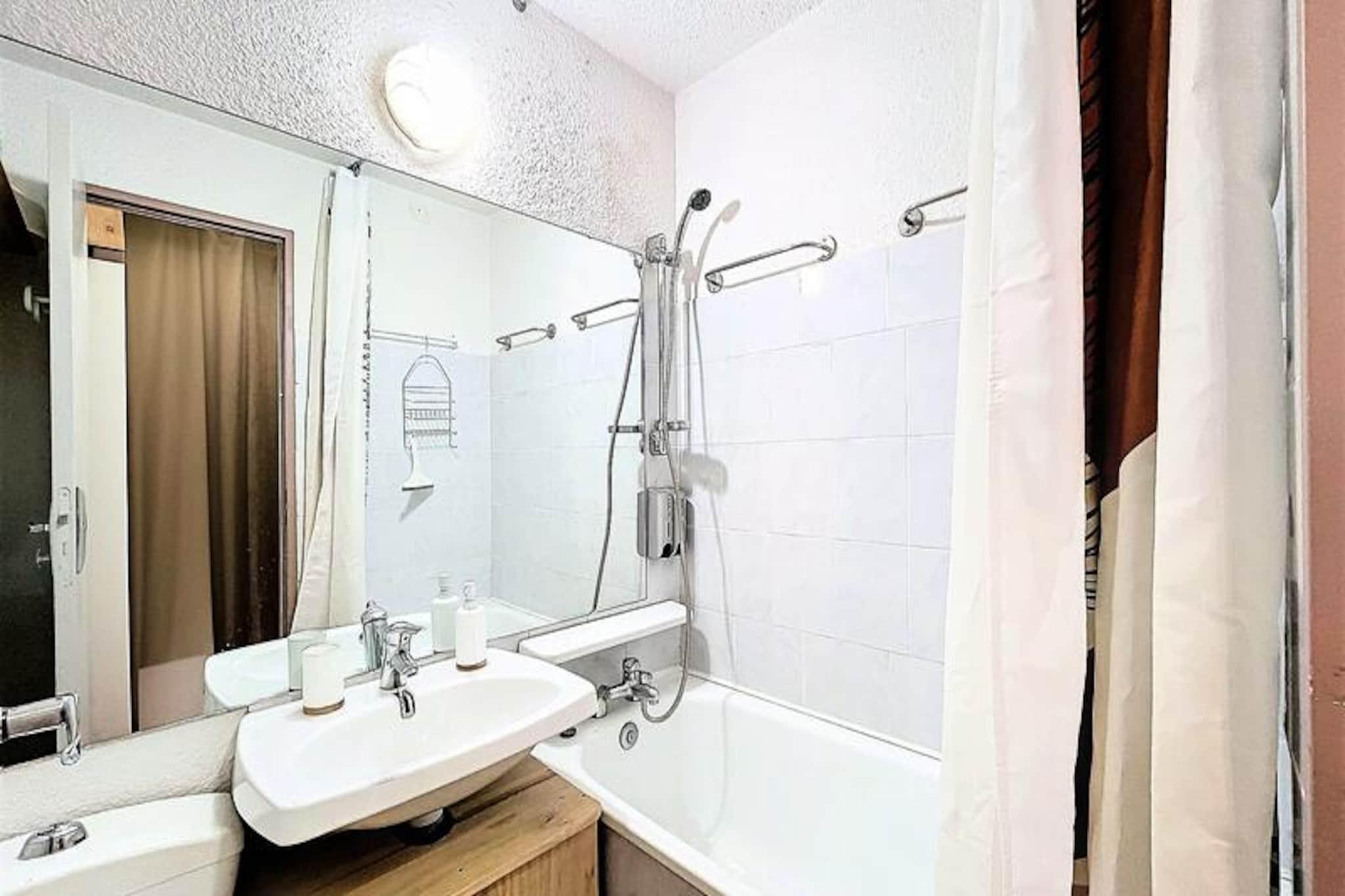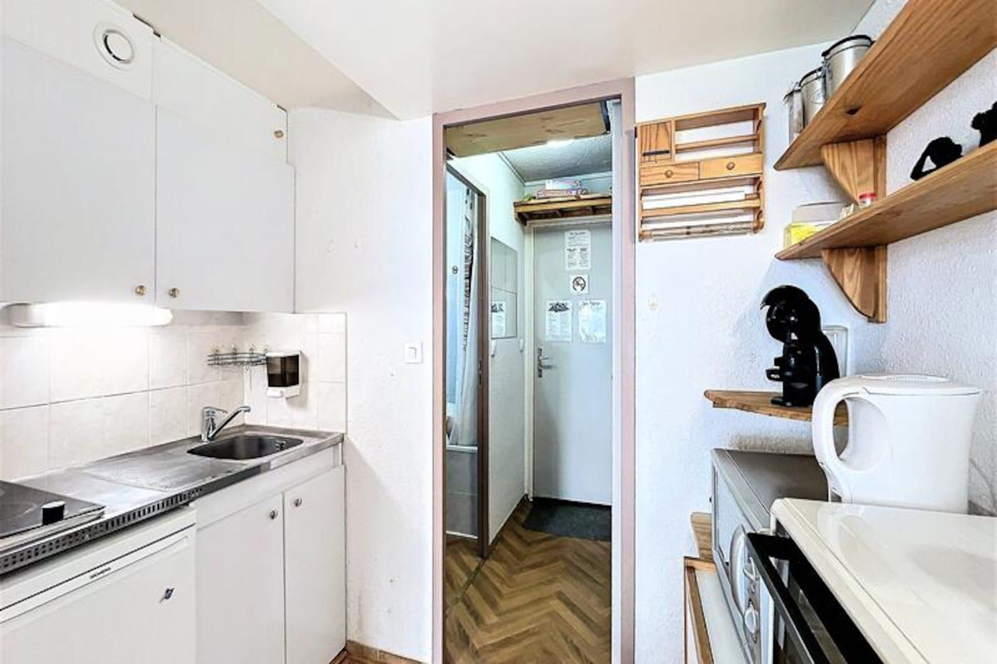 Denne charmerende studiolejlighed i Pegase Residence ligger i et fredeligt hjørne af resortet og tilbyder et hyggeligt tilflugtssted for op til fire gæster. Med sin nordvendte balkon kan du vågne op til en fredfyldt udsigt over bjergene og indånde den friske alpine luft. Boligen er bekvemt forbundet med resortets shoppingcenter, med en delikatesseforretning kun 10 meter væk og et supermarked 20 meter fra din dør. En stolelift ligger kun 100 meter væk, hvilket sikrer nem adgang til pisterne, mens en gratis shuttlebus giver problemfri forbindelse til den øvre del af resortet, ESF-skiskolen og snefronten.\n\nIndvendigt er lejligheden omhyggeligt designet til komfort og praktisk anvendelighed. Tekøkkenet er udstyret med alt, hvad du behøver for at tilberede solide måltider, herunder en keramisk kogeplade, miniovn, mikrobølgeovn og specialapparater som en raclettegrill og fondue-sæt til autentiske alpine spiseoplevelser. Sovearrangementet inkluderer en 140x190 cm sovesofa og to 80x190 cm køjesenge, hvilket gør den ideel til par, små familier eller vennegrupper. Moderne bekvemmeligheder som fladskærms-tv og skiboks forbedrer dit ophold, mens adgang til den opvarmede swimmingpool tilføjer et strejf af luksus.\n\nSelve boligen er tilgængelig for kørestolsbrugere med fire elevatorer og udendørs parkering for nemheds skyld. Familier vil sætte pris på den nærliggende legeplads, mens skientusiaster vil elske nærheden til pisterne og den nemme opbevaring af udstyr. For dem, der søger afslapning efter en aktiv dag, giver udsigten over bjergene fra balkonen den perfekte baggrund.\n\nUanset om du er her for at stå på ski, udforske feriestedet eller blot slappe af, tilbyder dette veludstyrede studie alt, hvad du behøver for en uforglemmelig alpeferie. Med sin førsteklasses beliggenhed og gennemtænkte faciliteter er det en perfekt base for dine eventyr i de franske alper.