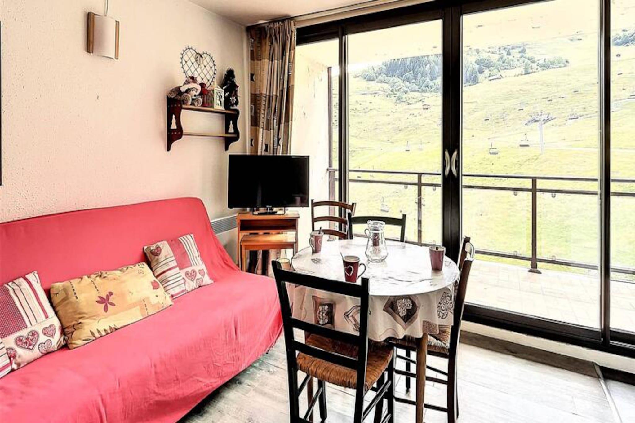Højt over feriestedets travle gader inviterer denne charmerende studiolejlighed på 8. sal i Baïkonour Residence dig til at opleve den perfekte alpine getaway. Med sin sydvendte balkon, der tilbyder uforstyrret udsigt over pisterne, er dette hyggelige tilflugtssted ideelt for par eller små familier, der søger en blanding af komfort og bekvemmelighed. Forestil dig at vågne op til synet af skiløbere, der snor sig ned ad bjerget, med Sybelle Express-stoleliften kun få skridt væk til dine egne eventyr. Uanset om du er her for vintersport eller sommervandreture, placerer denne beliggenhed dig i hjertet af det hele. \n\nIndenfor er studiolejligheden omhyggeligt designet til at maksimere plads og komfort. Stuen har en dobbelt sovesofa og et tv, mens soveområdet har to køjesenge, hvilket gør det velegnet til op til fire gæster. Tekøkkenet er fuldt udstyret med elektriske kogeplader, mikrobølgeovn, brødrister, kaffemaskine og elkedel, så du nemt kan tilberede måltider. Yderligere faciliteter inkluderer et skiskab, to elevatorer og parkering kun 50 meter væk. For ekstra afslapning kan gæster over tre år nyde adgang til den opvarmede swimmingpool under deres ophold. \n\nTræd udenfor og oplev den pulserende atmosfære på feriestedet. Shoppingarkaden for foden af ??boligen tilbyder alt, hvad du behøver, fra skiudlejning til lækker lokal mad. Skiskolen (ESF) er bekvemt placeret kun 20 meter væk, hvilket gør denne ejendom perfekt for både begyndere og erfarne skiløbere. Om sommeren forvandles området til et paradis for vandrere og naturelskere, med stier, der fører til betagende alpine udsigter. \n\nUanset om du søger spændende dage på pisterne eller rolige aftener under stjernerne, tilbyder denne studiolejlighed en uforglemmelig flugt i de franske alper. Book dit ophold nu og skab varige minder i dette maleriske bjergparadis.