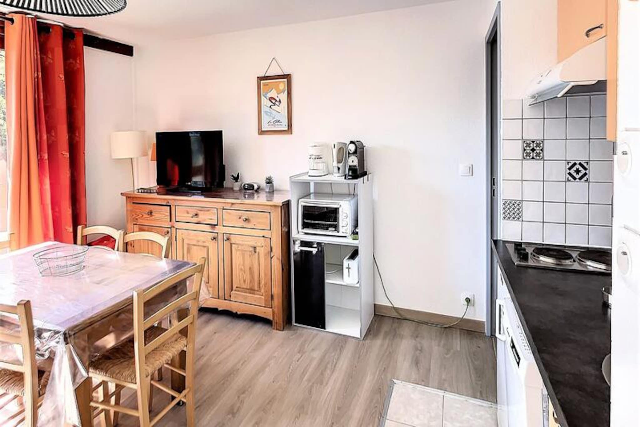 Højt over den charmerende alpelandsby Les Menuires tilbyder denne hyggelige lejlighed en perfekt blanding af komfort og bekvemmelighed til din bjergferie. Beliggende i Zodiaque Residence, kan den prale af ski-in/ski-out adgang, hvilket gør den til et ideelt valg for både ivrige skiløbere og familier. Fra den sydvendte balkon kan du nyde panoramaudsigten over pisterne og den opvarmede swimmingpool nedenfor, hvilket skaber en rolig kulisse for dit ophold. Lejligheden er designet til at rumme op til seks gæster og har en rummelig stue med sovesofa, et fuldt udstyret tekøkken og to indbydende soveværelser. Det første soveværelse har køjesenge og en ekstra enkeltseng, mens det andet har en komfortabel dobbeltseng. Moderne faciliteter såsom opvaskemaskine, vaskemaskine og raclettegrill sikrer et problemfrit og behageligt ophold. Badeværelset og det separate toilet bidrager til det praktiske, mens gennemtænkte detaljer som en Nespresso®-maskine og et fonduesæt inviterer dig til at nyde hyggelige aftener indendørs. Residensen er perfekt placeret til både eventyr og afslapning. Kun få skridt væk finder du ESF-skiskolen, en børnepasningsordning og et udvalg af restauranter og butikker. Om sommeren forvandler den opvarmede swimmingpool og de nærliggende vandrestier området til et paradis for friluftsentusiaster. Uanset om du glider ned ad pisterne eller udforsker de betagende landskaber, placerer denne lejlighed dig i hjertet af begivenhederne. Med sin uovertrufne beliggenhed, familievenlige faciliteter og fantastiske udsigt lover denne ejendom en uforglemmelig alpin flugt. Skab varige minder i de franske alper, hvor hvert øjeblik er indrammet af bjergenes skønhed.