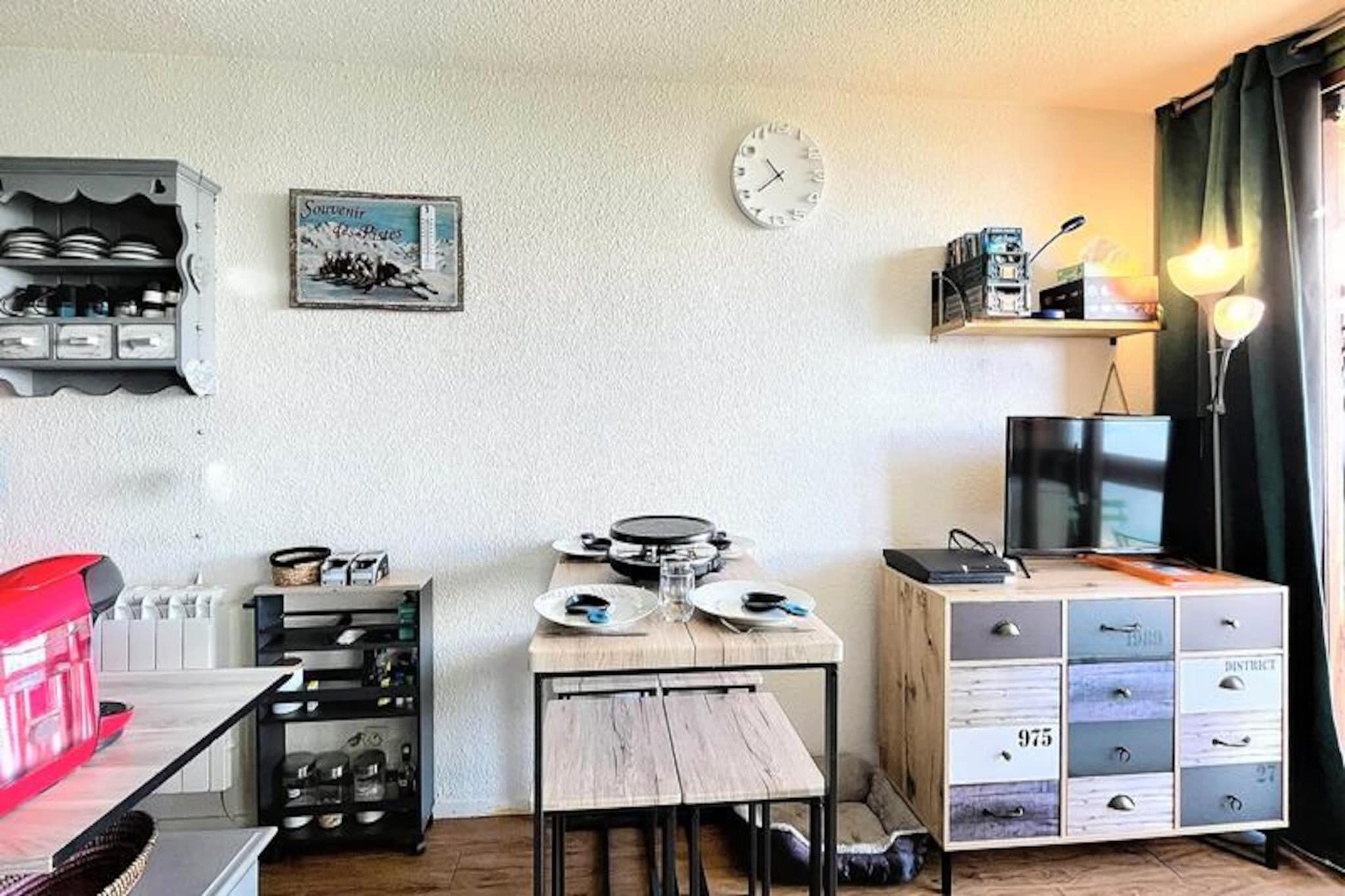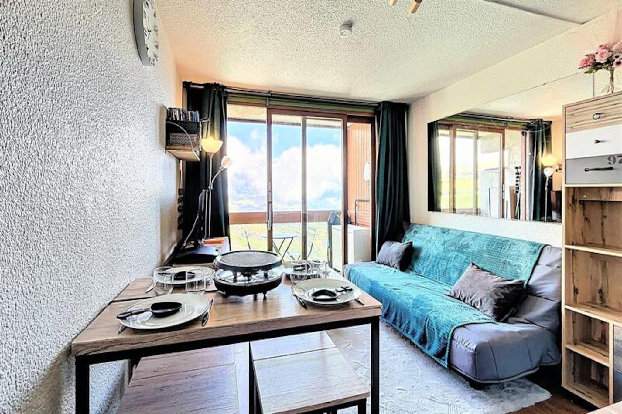 Højt over den maleriske Tarentaise-dal tilbyder dette charmerende studie et hyggeligt alpint tilflugtssted, perfekt til par eller små familier, der søger en ski-in/ski-out-oplevelse. Studiet, der ligger i Le Vanguard-residensen, ligger på 18. sal og tilbyder en betagende udsigt over bjergene fra den nordvendte balkon. Uanset om du er her for at slentre gennem pudrede pister eller blot slappe af i den fredfyldte atmosfære i de franske alper, lover denne ejendom et uforglemmeligt ophold. \n\nStudioet er nyrenoveret og smagfuldt indrettet og strækker sig over 22 m² og har komfortabel plads til op til fire gæster. Det gennemtænkte designede rum inkluderer en alkove med forhæng, en dobbeltseng, en sovesofa i den primære opholdsstue og et højt bord til måltider. Tekøkkenet er fuldt udstyret med moderne apparater såsom keramisk kogeplade, mikrobølgeovn, miniovn og endda en raclettegrill for en ægte Savoyard-oplevelse. Et brusebad med vaskemaskine og hårtørrer øger bekvemmeligheden, mens gratis Wi-Fi sikrer, at du forbliver forbundet under hele dit ophold. Gæsterne har også gratis adgang til den opvarmede swimmingpool, hvilket gør det til et dejligt valg for familier med børn over tre år. \n\nResidensen er ideelt beliggende ved foden af ??pisterne med et skirum i stueetagen for nem adgang. I nærheden finder du et minimarked, en cateringvirksomhed og ESF børneskiskole kun 200 meter væk, hvilket gør denne beliggenhed perfekt for både familier og skientusiaster. Derudover er der en legeplads og en børnepasning inden for gåafstand, hvilket sikrer bekvemmelighed for forældre, der rejser med små børn. \n\nUanset om du er her for vintersport eller sommervandreture, kombinerer denne studiolejlighed komfort, praktisk anvendelighed og en fantastisk udsigt for at skabe den perfekte alpine ferie. Med sin førsteklasses beliggenhed og gennemtænkte faciliteter er det et sted, hvor minder skabes, og eventyr begynder.