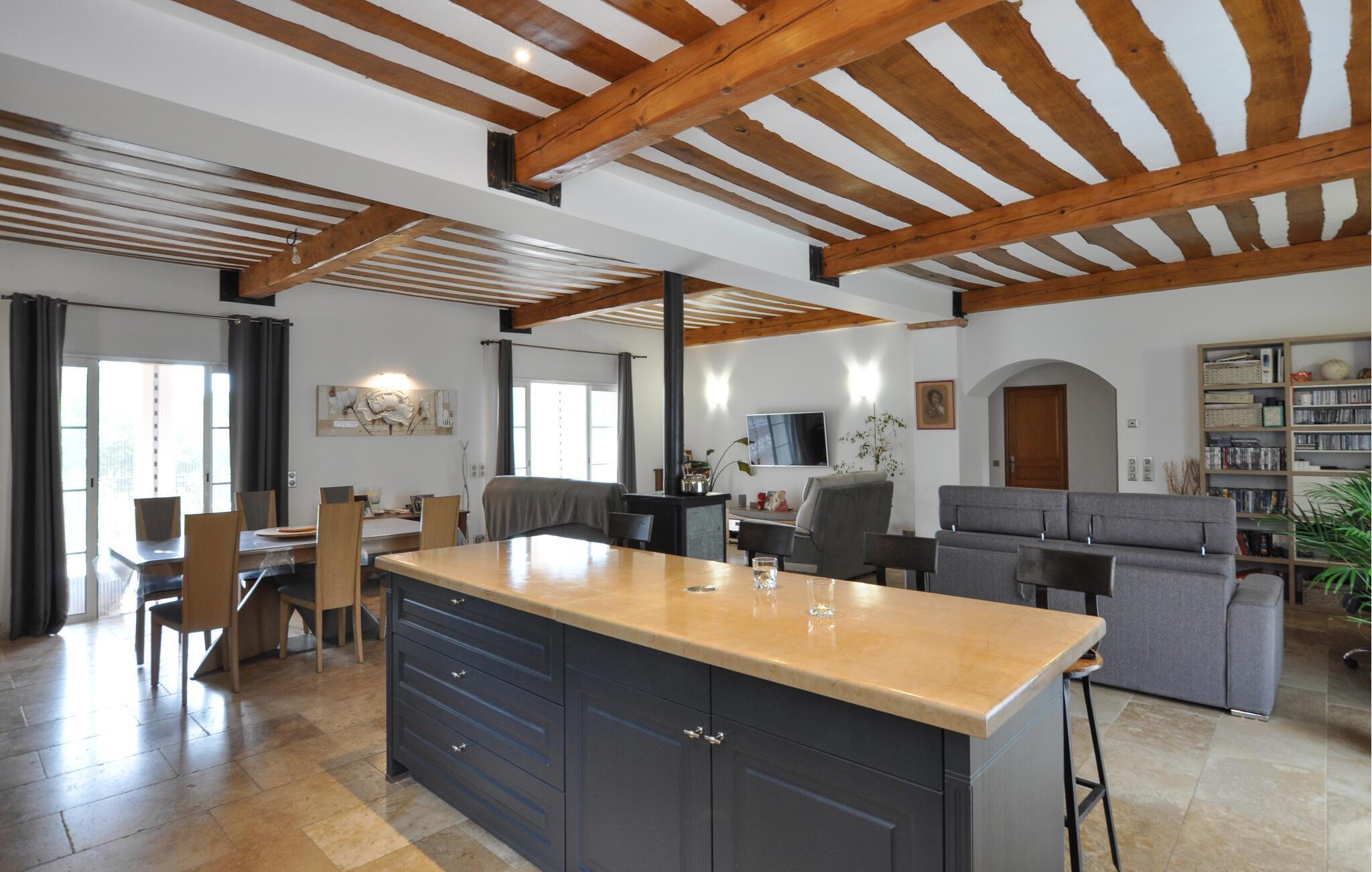 Dette rummelige og smagfuldt indrettede feriehus i Villecroze giver jer en helt særlig ferieoplevelse. De synlige træbjælker tilføjer interiøret en rustik elegance, mens den komfortable indretning sørger for, at I straks føler jer hjemme. Tilbring hyggelige stunder i den åbne stue, eller slap af på den indbydende veranda med en skøn udsigt over den smukt anlagte have og den forfriskende pool. Her venter en privat oase, der lover ro og velvære.