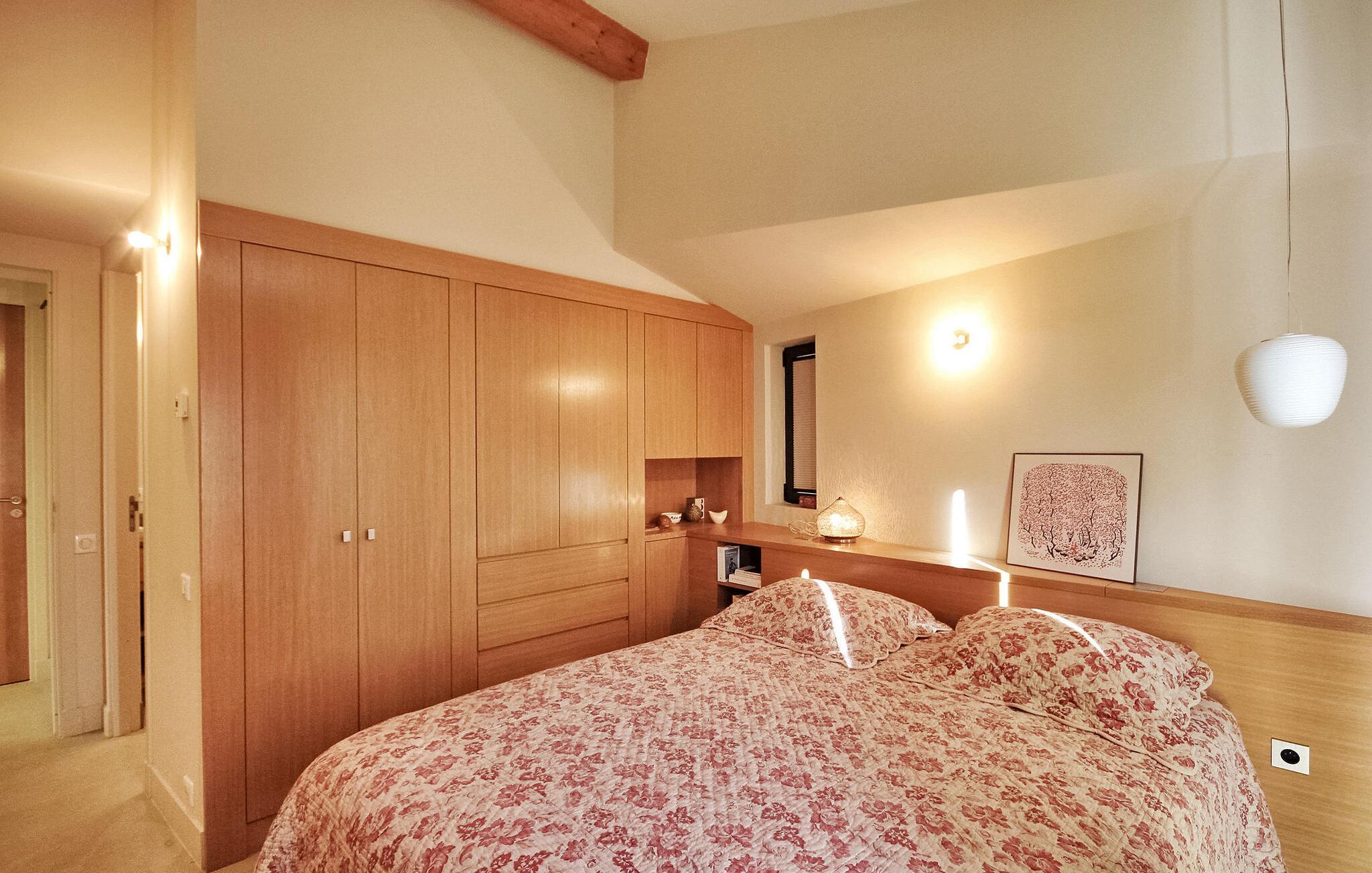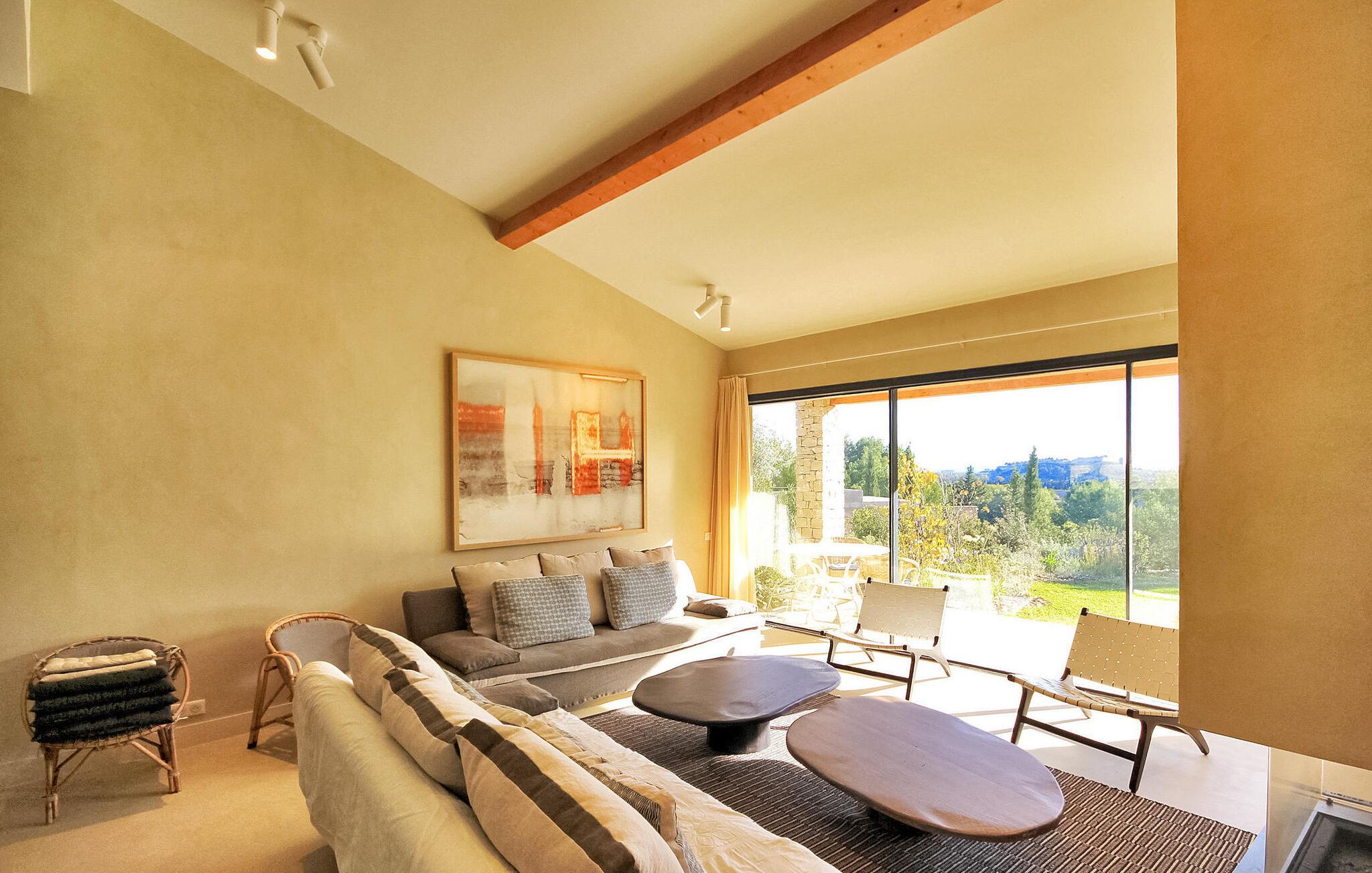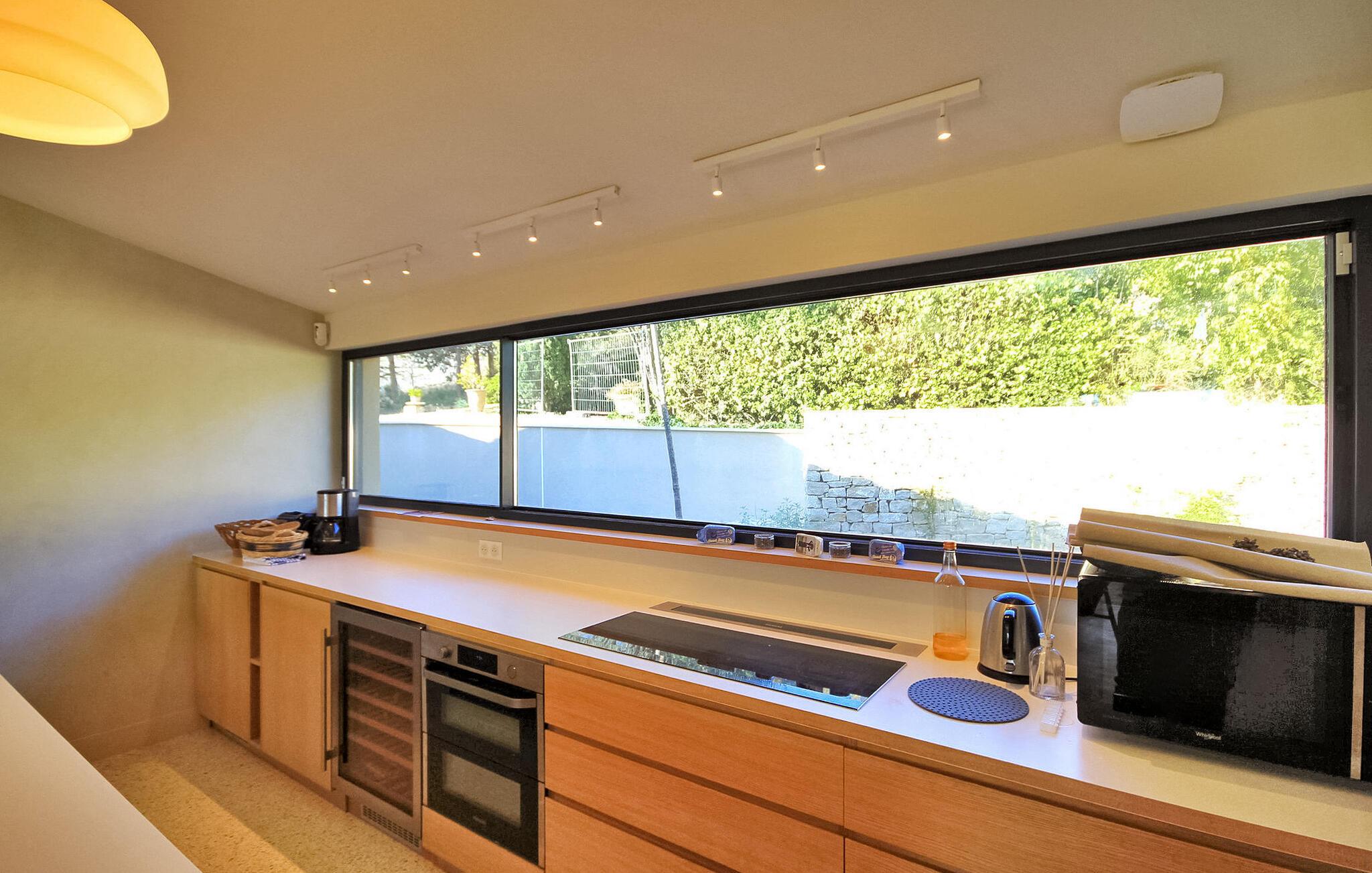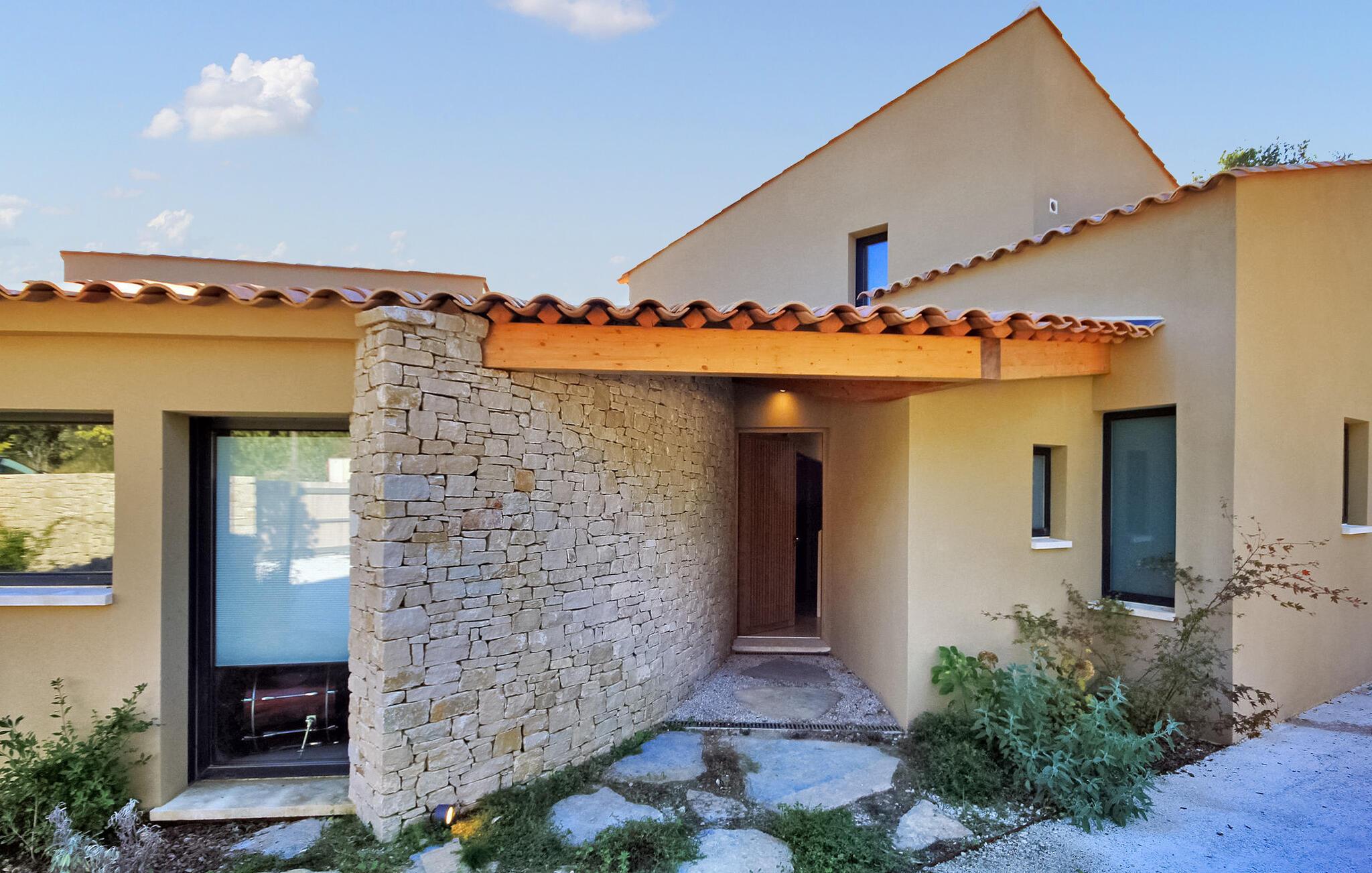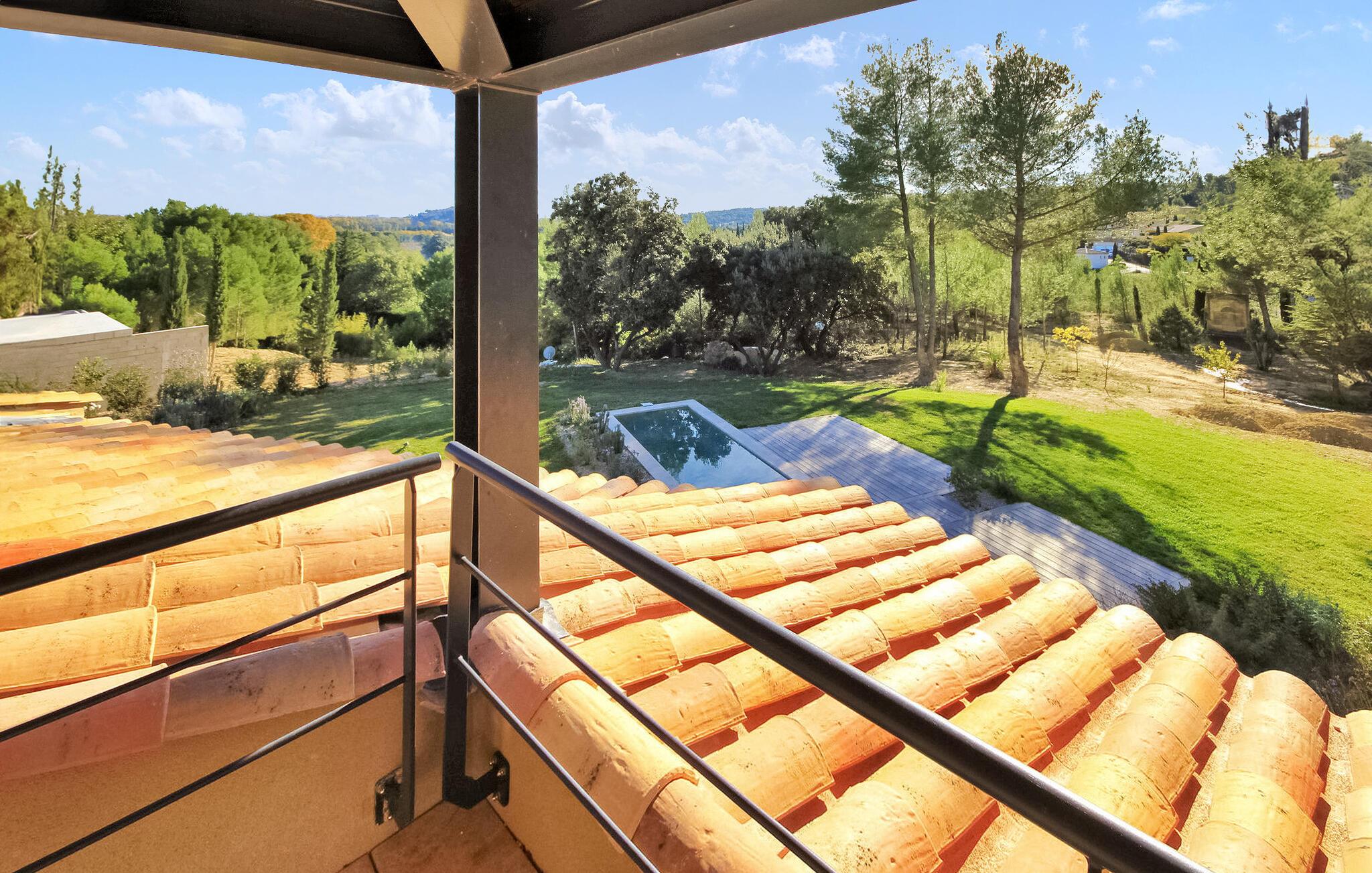 Denne klimatiserede ferievilla i Villeneuve-les-Avignon ligger i et fredeligt boligområde, ca. 2 km fra landsbyens centrum med butikker og restauranter. Villaen har et moderne, komfortabelt interiør og en privat pool. Den rummelige opholdsstue åbner ud til terrassen og haven og giver udsigt over det oplyste Fort Saint-André i Villeneuve les Avignon om aftenen. Stueetagen består af opholds- og spisepladser, et åbent køkken med kvalitets hvidevarer, en tv-stue med en halvrund sofa og flere soveværelser. Derudover er der et separat badeværelse og gulvkøling i hele soveværelserne og opholdsstuen. Ovenpå er der et soveværelse med eget badeværelse med aircondition og en terrasse. Udenfor er der en privat pool (8,5 mx 2,5 m) sikret med en alarm, liggestole, en anlagt have og en grill til gæsternes brug. Huset ligger i et fredeligt boligområde, ca. 2 km fra Villeneuves historiske centrum og dets butikker og restauranter. Den smukke middelalderby Avignon ligger lige på den anden side af Rhône-floden, 5 km.