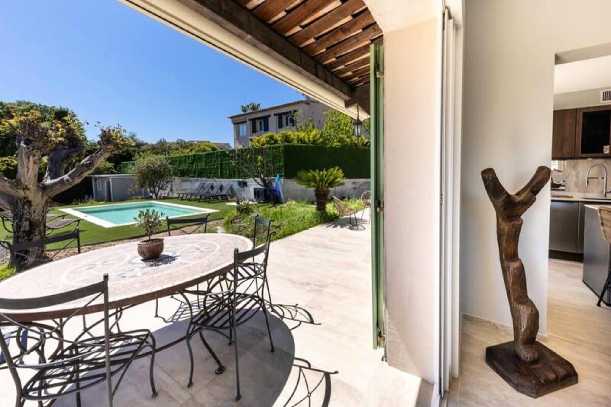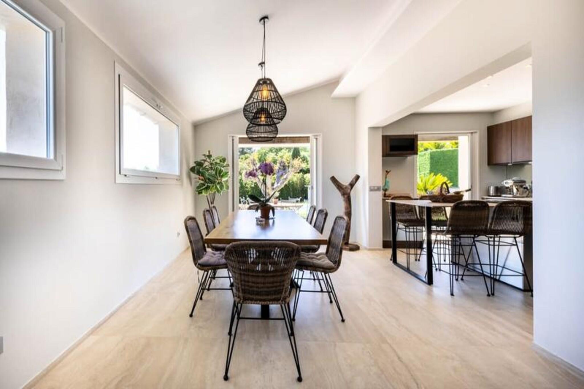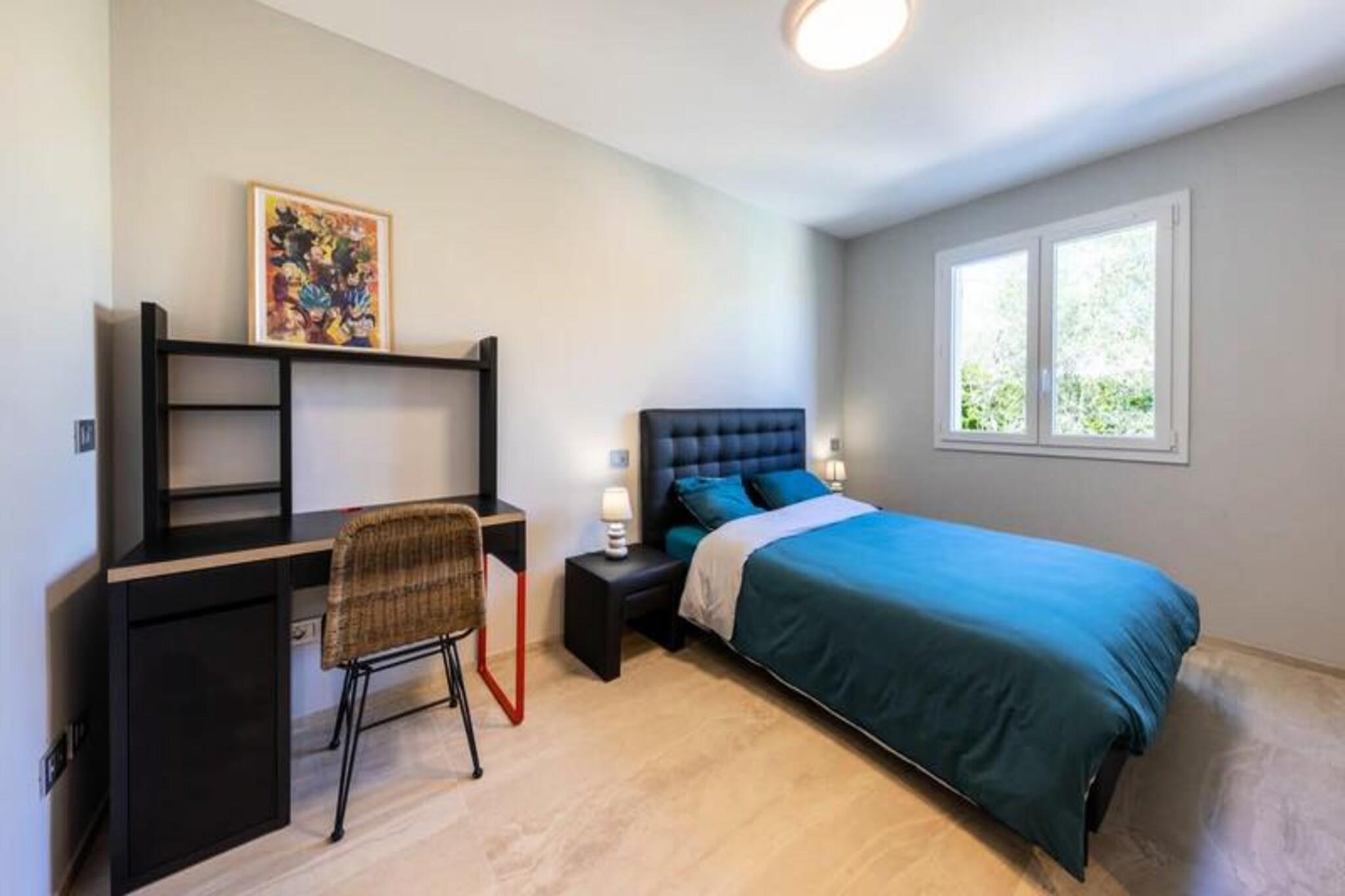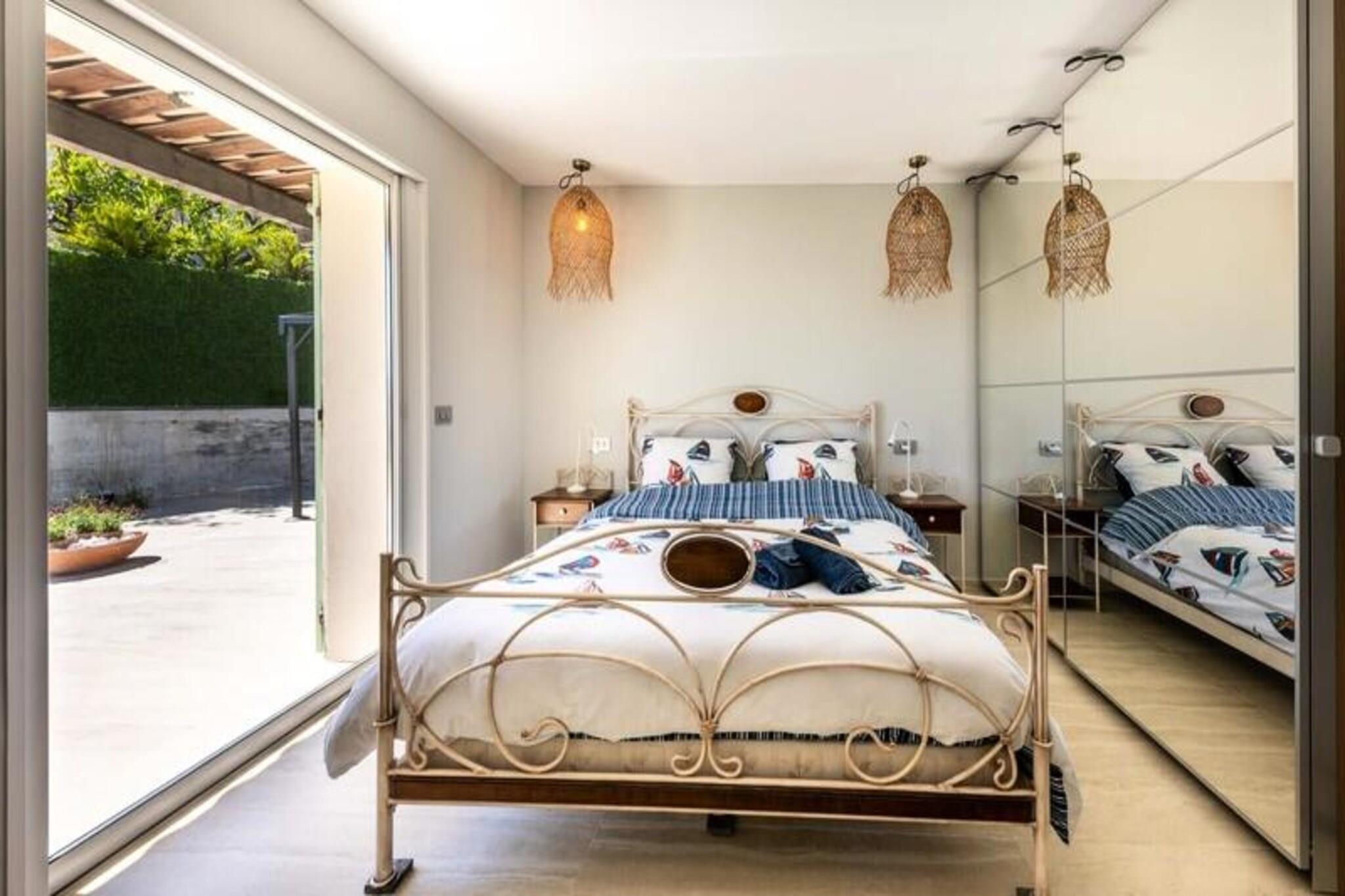 Denne luksuriøse villa i Villeneuve Loubet tilbyder en virkelig uforglemmelig ferieoplevelse. Villaen har fire soveværelser, hver med sit eget private badeværelse, og rummer komfortabelt gæster. Nyd en privat swimmingpool, en rummelig terrasse med fantastisk havudsigt, et veludstyret fitnesscenter og en afslappende sauna. Bemærk venligst, at kæledyr ikke er tilladt. Oplev skønheden ved den franske riviera! Udforsk den charmerende by Villeneuve Loubet, slap af på sandstrandene i Baie des Anges, og besøg den pulserende Marina Baie des Anges. Nyd nem adgang til lokale butikker, restauranter og togstationen for bekvem rejse langs Côte d'Azur. Denne fantastiske villa kan prale af en smukt anlagt have med en pergola og komfortable udendørs siddepladser. Den rummelige stue har et køkken i åbent plan, perfekt til underholdning. Forkæl dig selv med de luksuriøse faciliteter, herunder et privat fitnesscenter og sauna, hvilket sikrer et virkelig afslappende og foryngende ophold.