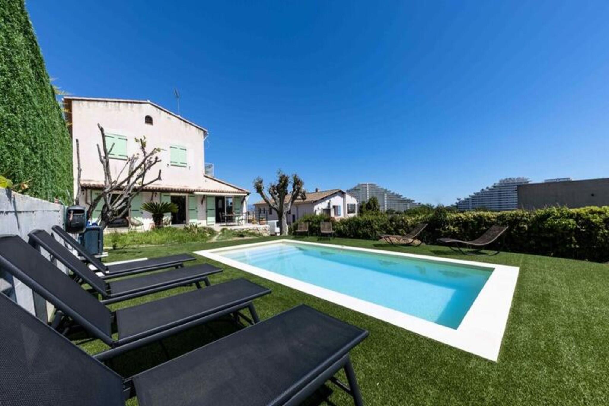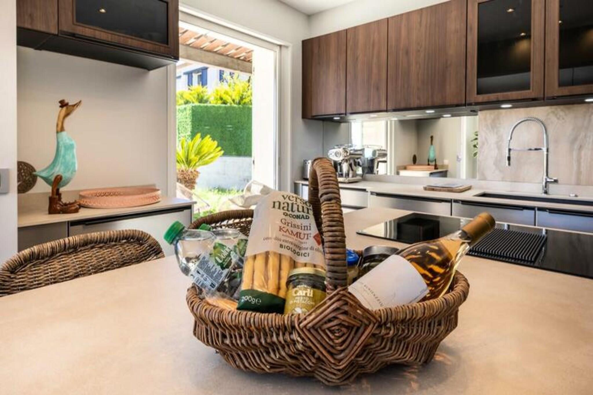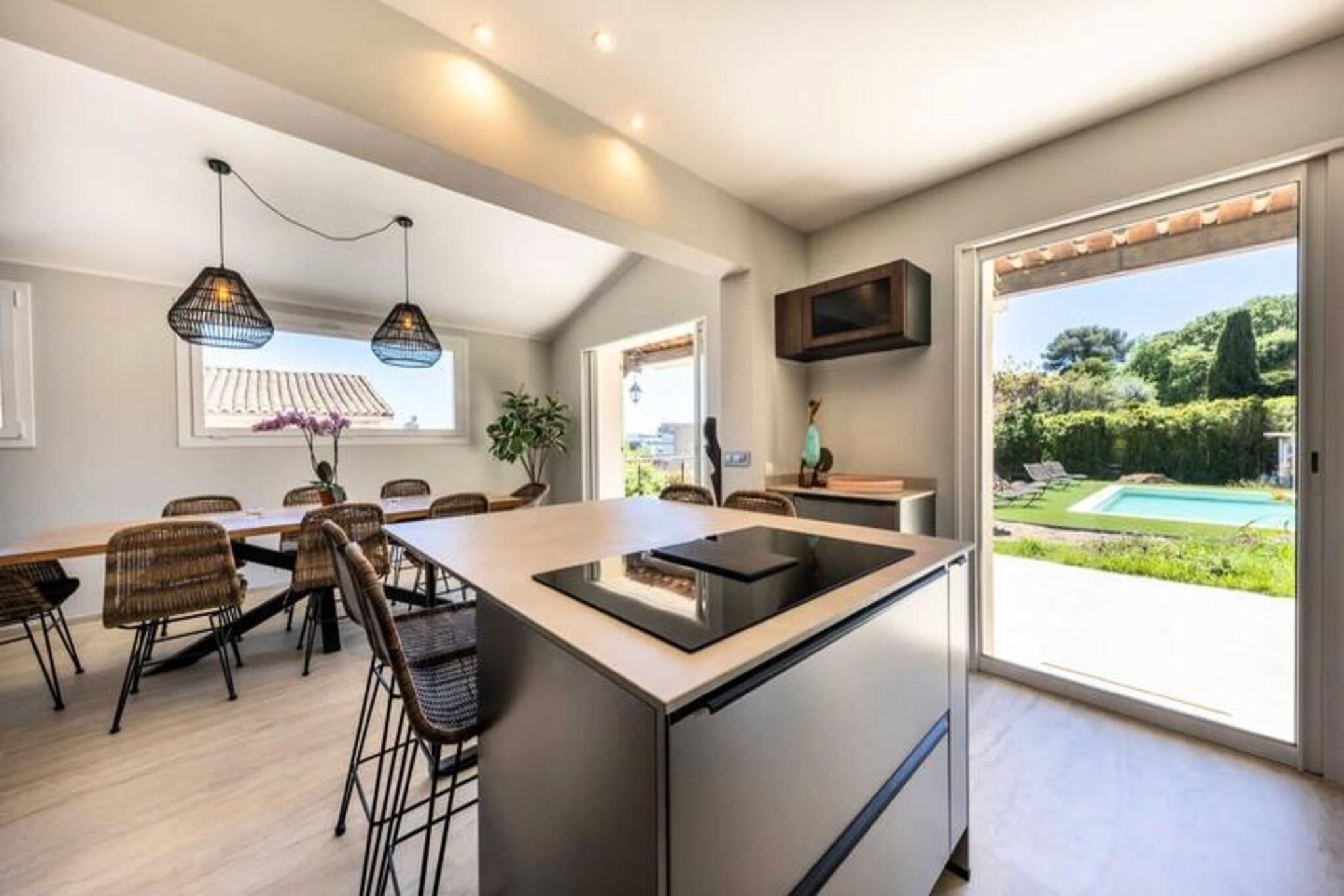 Denne luksuriøse villa i Villeneuve Loubet tilbyder en virkelig uforglemmelig ferieoplevelse. Villaen har fire soveværelser, hver med sit eget private badeværelse, og rummer komfortabelt gæster. Nyd en privat swimmingpool, en rummelig terrasse med fantastisk havudsigt, et veludstyret fitnesscenter og en afslappende sauna. Bemærk venligst, at kæledyr ikke er tilladt. Oplev skønheden ved den franske riviera! Udforsk den charmerende by Villeneuve Loubet, slap af på sandstrandene i Baie des Anges, og besøg den pulserende Marina Baie des Anges. Nyd nem adgang til lokale butikker, restauranter og togstationen for bekvem rejse langs Côte d'Azur. Denne fantastiske villa kan prale af en smukt anlagt have med en pergola og komfortable udendørs siddepladser. Den rummelige stue har et køkken i åbent plan, perfekt til underholdning. Forkæl dig selv med de luksuriøse faciliteter, herunder et privat fitnesscenter og sauna, hvilket sikrer et virkelig afslappende og foryngende ophold.