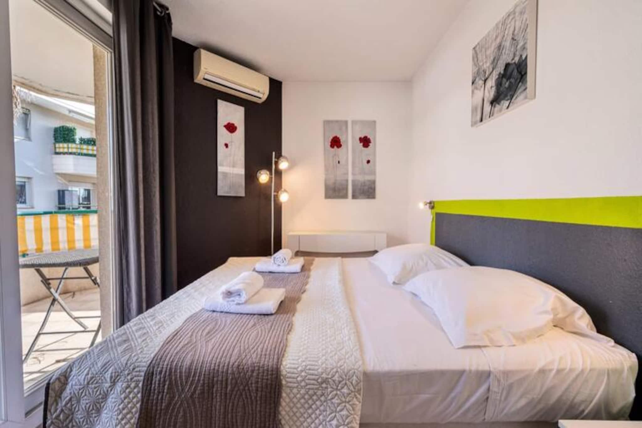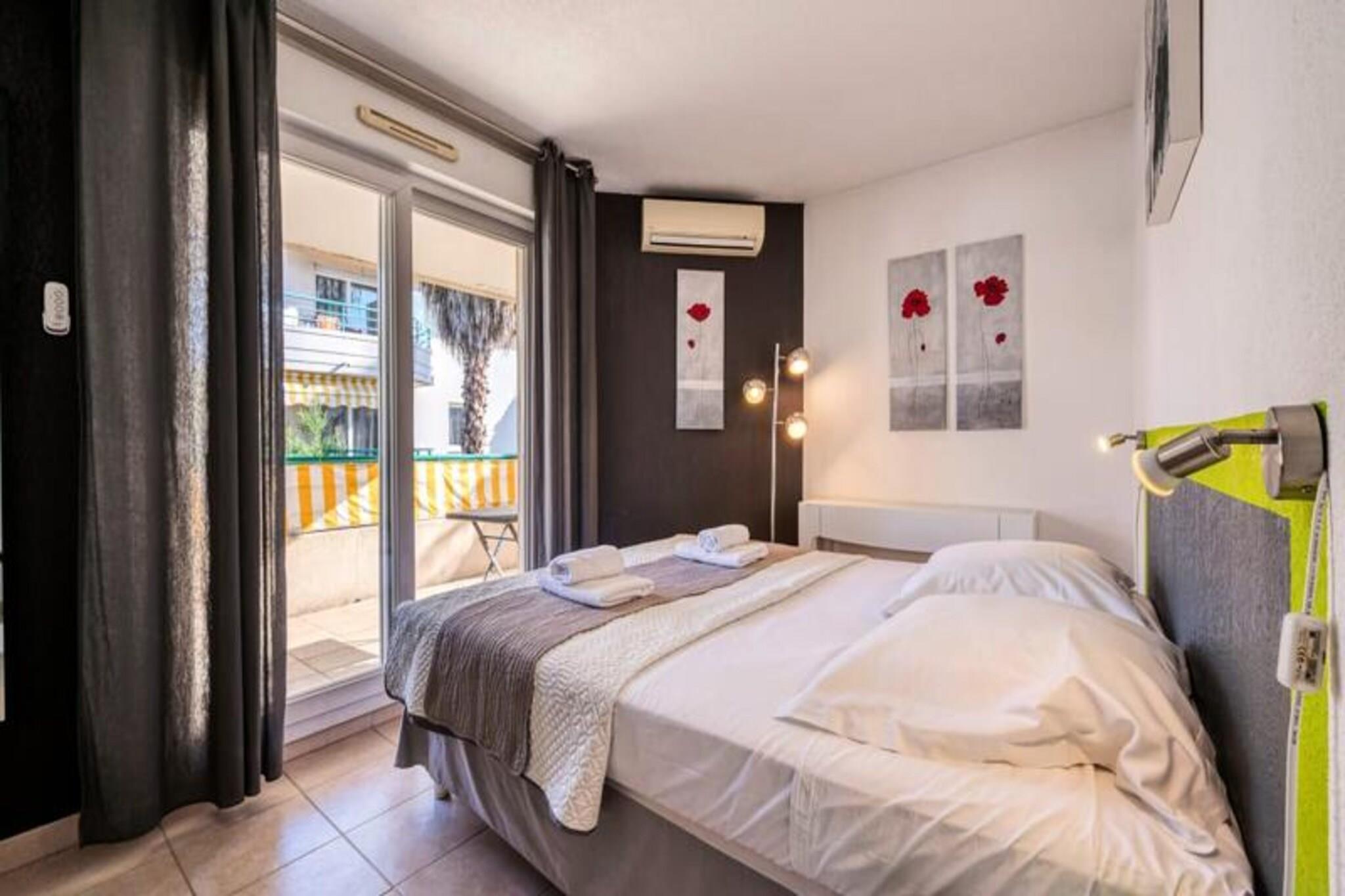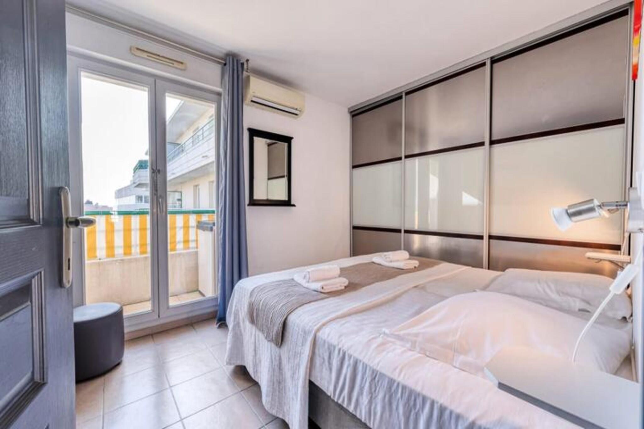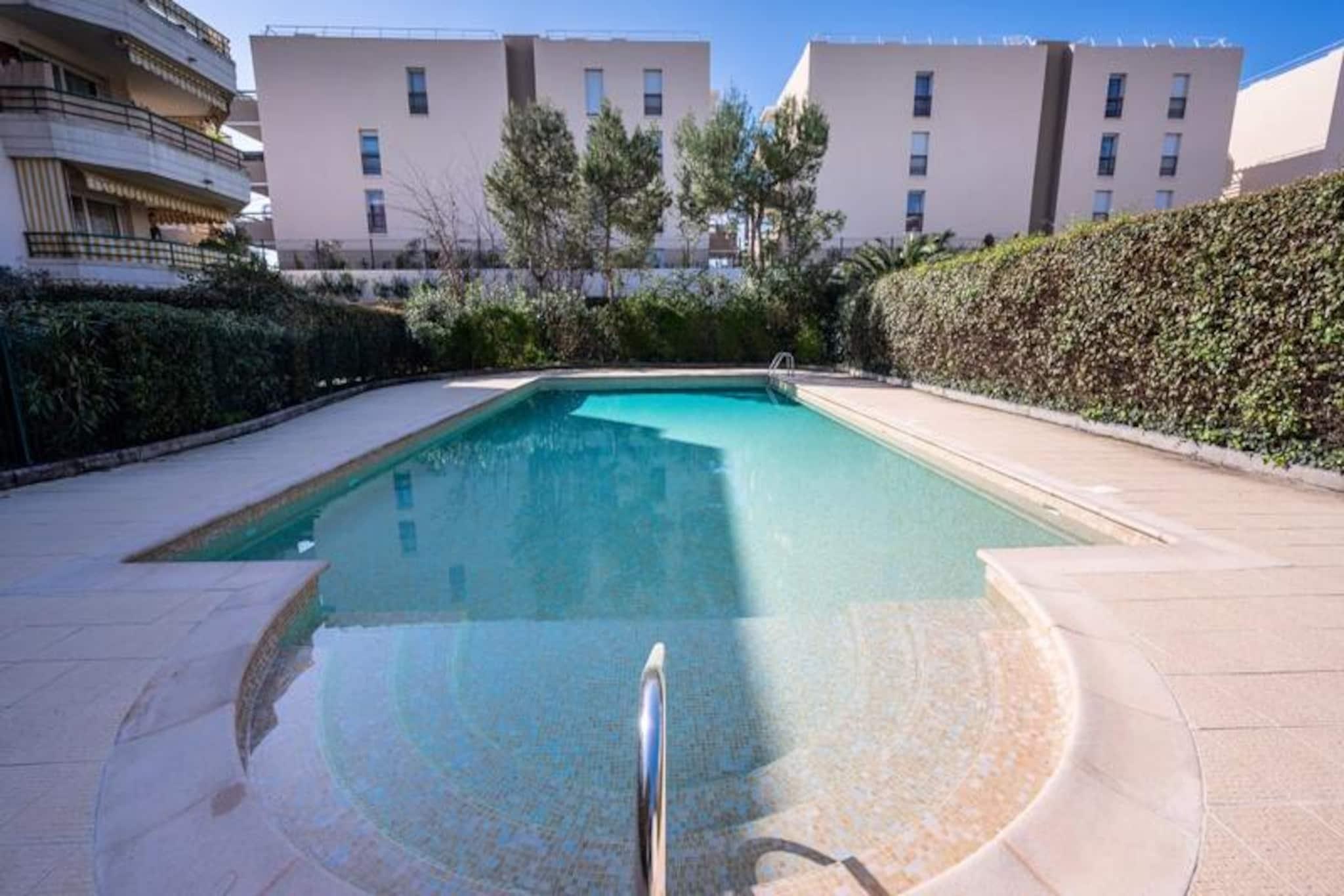 Denne komfortable lejlighed med aircondition tilbyder et fredeligt ophold med to soveværelser, herunder et med en 160 cm seng og det andet med en enkeltseng. Lejligheden kan rumme op til 4 gæster eller 6 mod et ekstra gebyr og tilbyder endda plads til to babyer under 3 år. Gæsterne vil nyde en møbleret terrasse med udsigt til swimmingpoolen samt adgang til en kælderparkeringsplads. Boligen omfatter en swimmingpool (sæsonbestemt), hvilket sikrer afslapning under dit ophold. Lejligheden er ikke kæledyrsvenlig, og der kræves et depositum ved ankomst. Lejligheden er ideelt beliggende, kun 5 minutters gang fra butikker og mindre end 10 minutter fra strandene. Det er også tæt på den berømte Marina Baie des Anges og i gåafstand fra Villeneuve Loubet togstation. Området er omgivet af forskellige caféer, restauranter og markeder, der tilbyder masser af muligheder for at spise og udforske. Med sin førsteklasses beliggenhed er denne lejlighed perfekt til at nyde både det pulserende kystliv og fredelige afslapning. Lejligheden er fuldt udstyret med et amerikansk køkken med komfur, mikroovn-grillovn, køleskab med fryser, opvaskemaskine og Nespresso kaffemaskine. Badeværelset er udstyret med badekar, håndvask og separat toilet samt ekstra bekvemmeligheder som håndklædetørrer og hårtørrer. Lejligheden tilbyder også WiFi, en vaskemaskine og linned af høj kvalitet for at sikre et behageligt og bekvemt ophold.