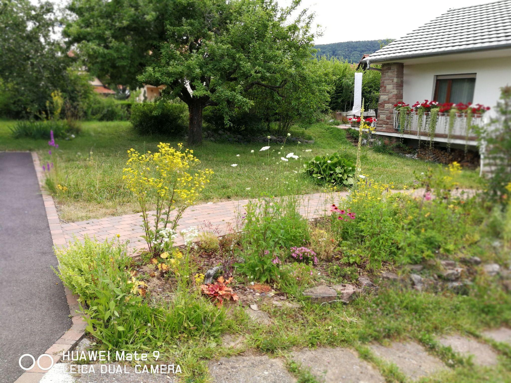 There is a large garden with fruit trees surrounded by hedges between the house and the residential street. There is a parking space for 2 vehicles at the entrance.