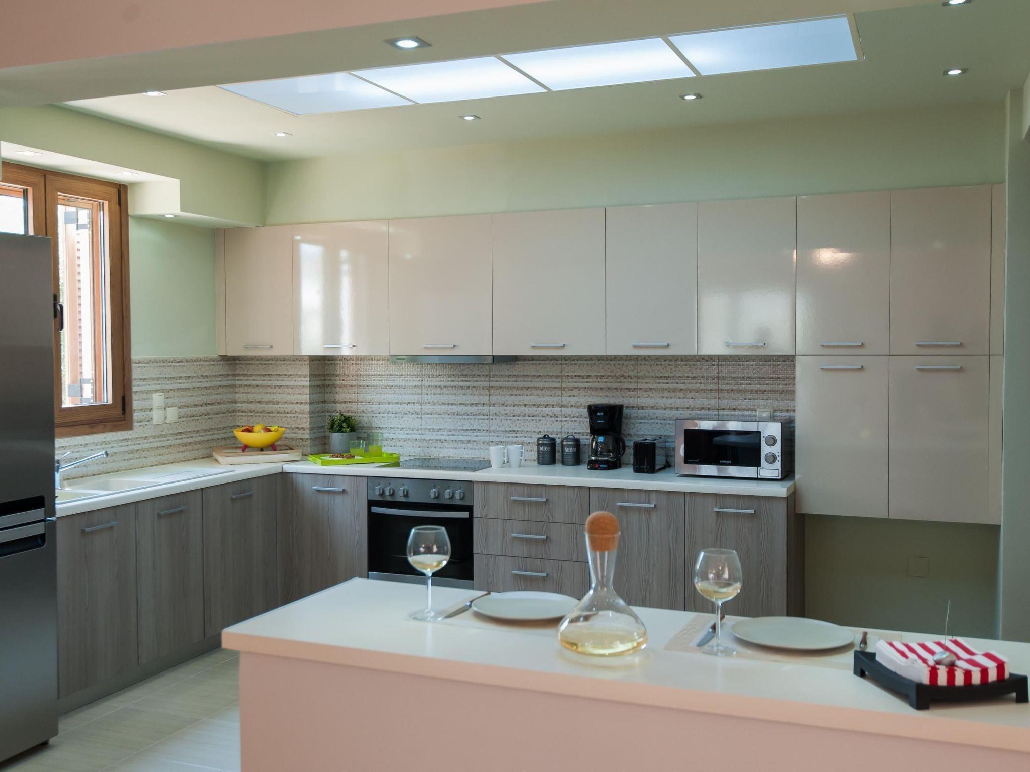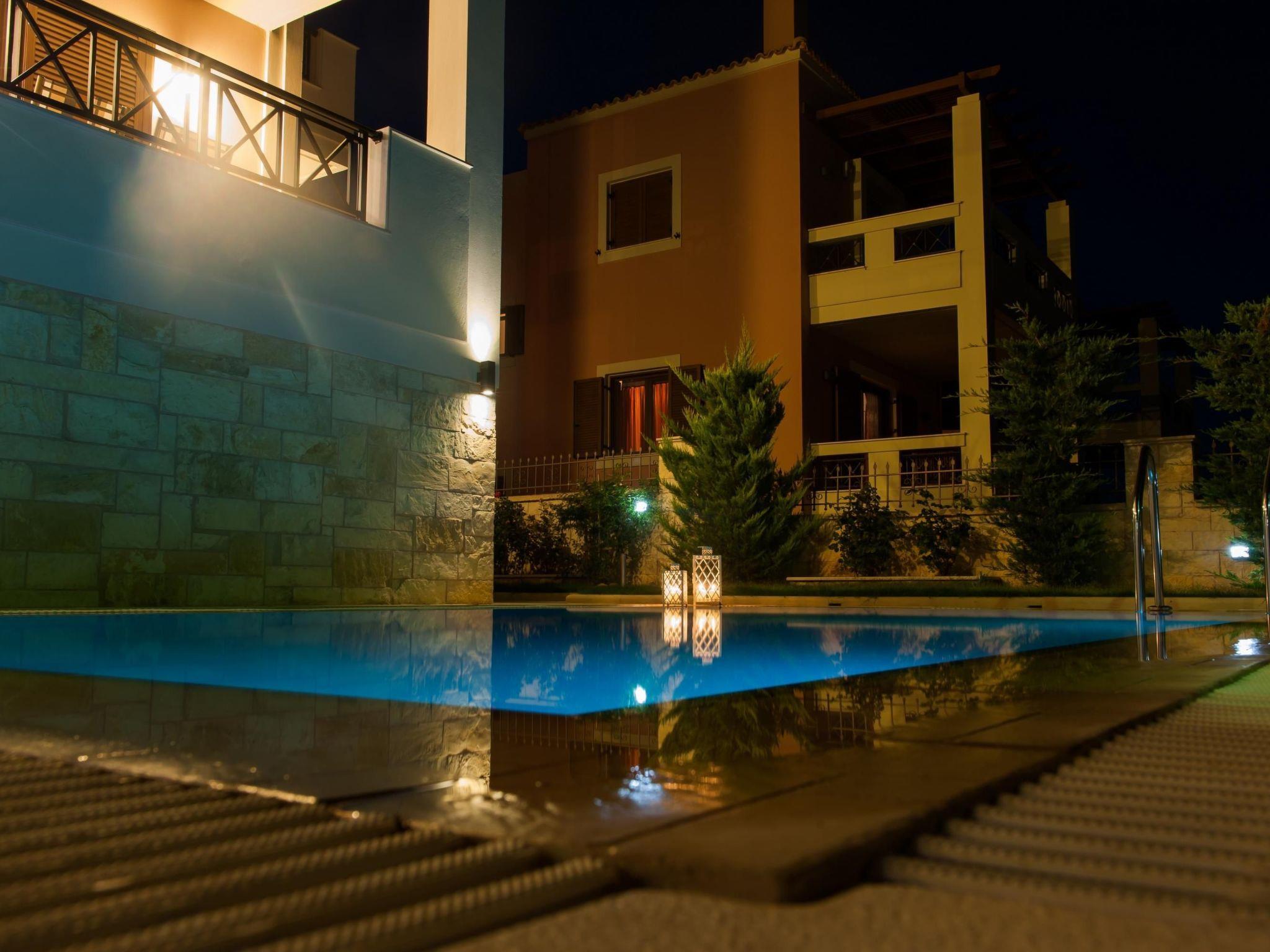 Inside, the villa boasts a spacious living room on the ground floor, featuring a comforting fireplace, air conditioning, and a sizeable corner sofa for relaxation. Adjacent to it is a dining room and an open, fully-equipped kitchen, perfect for culinary adventures. The presence of a bathroom with a shower and a separate guest toilet adds to the convenience. The rooms are adorned with modern furniture and ambient, indirect lighting. The first floor houses three bedrooms, ensuring restful nights for all guests. Two bedrooms offer double beds (160 x 200cm) and the third presents two single beds (90 x 200cm), with the flexibility to join them as a double bed. All mattresses are natural, reversible with one side made of natural latex and the other with memory foam, accompanied by air conditioning for ultimate comfort. The upper level also features a luxurious bathroom equipped with a whirlpool bath and soothing indirect lighting.