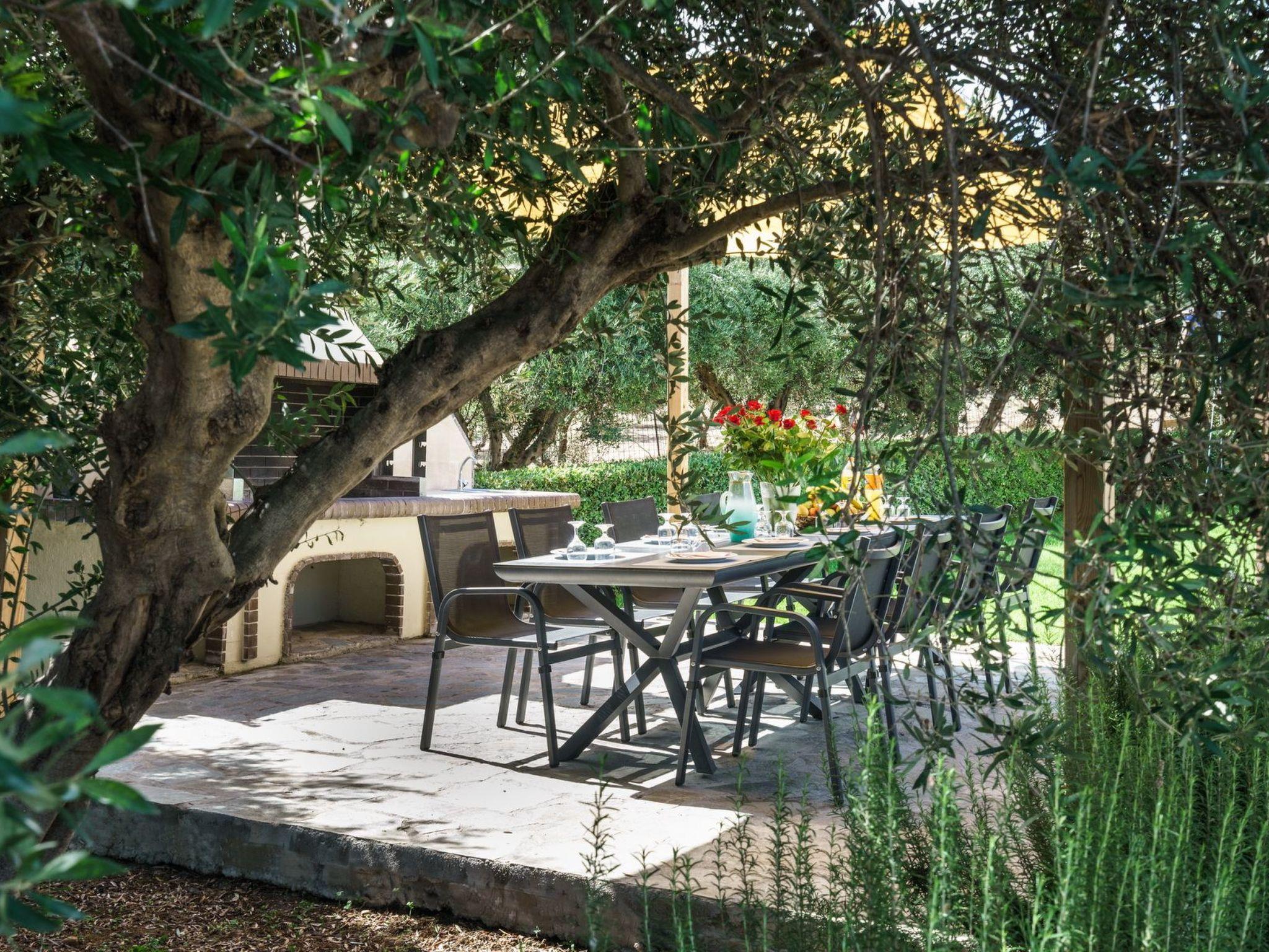 parking of the villa for up to 3 cars, a BBQ, lounge seats, dining