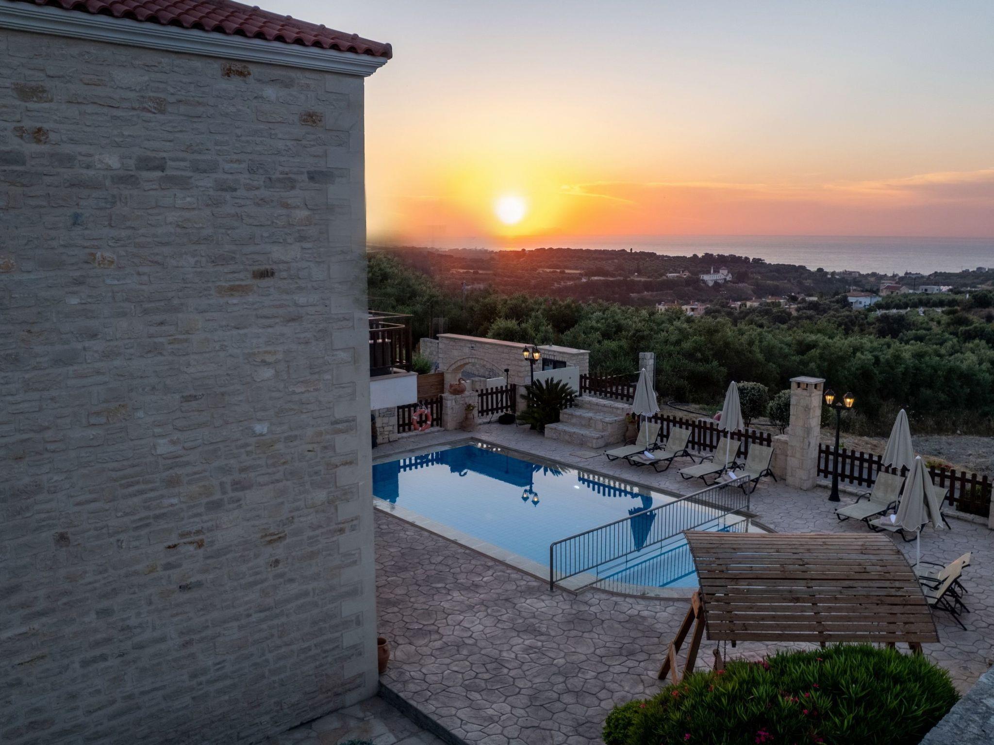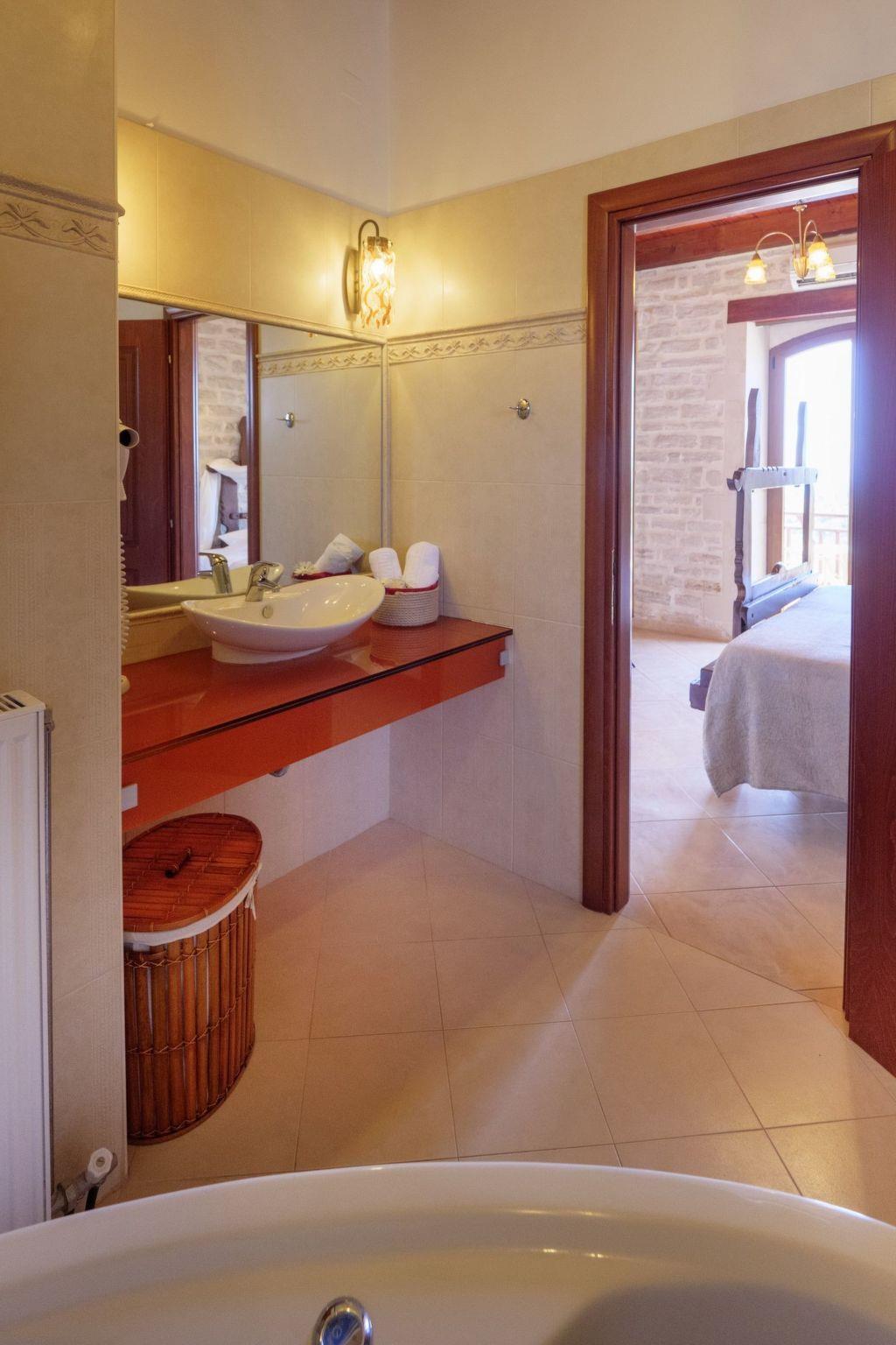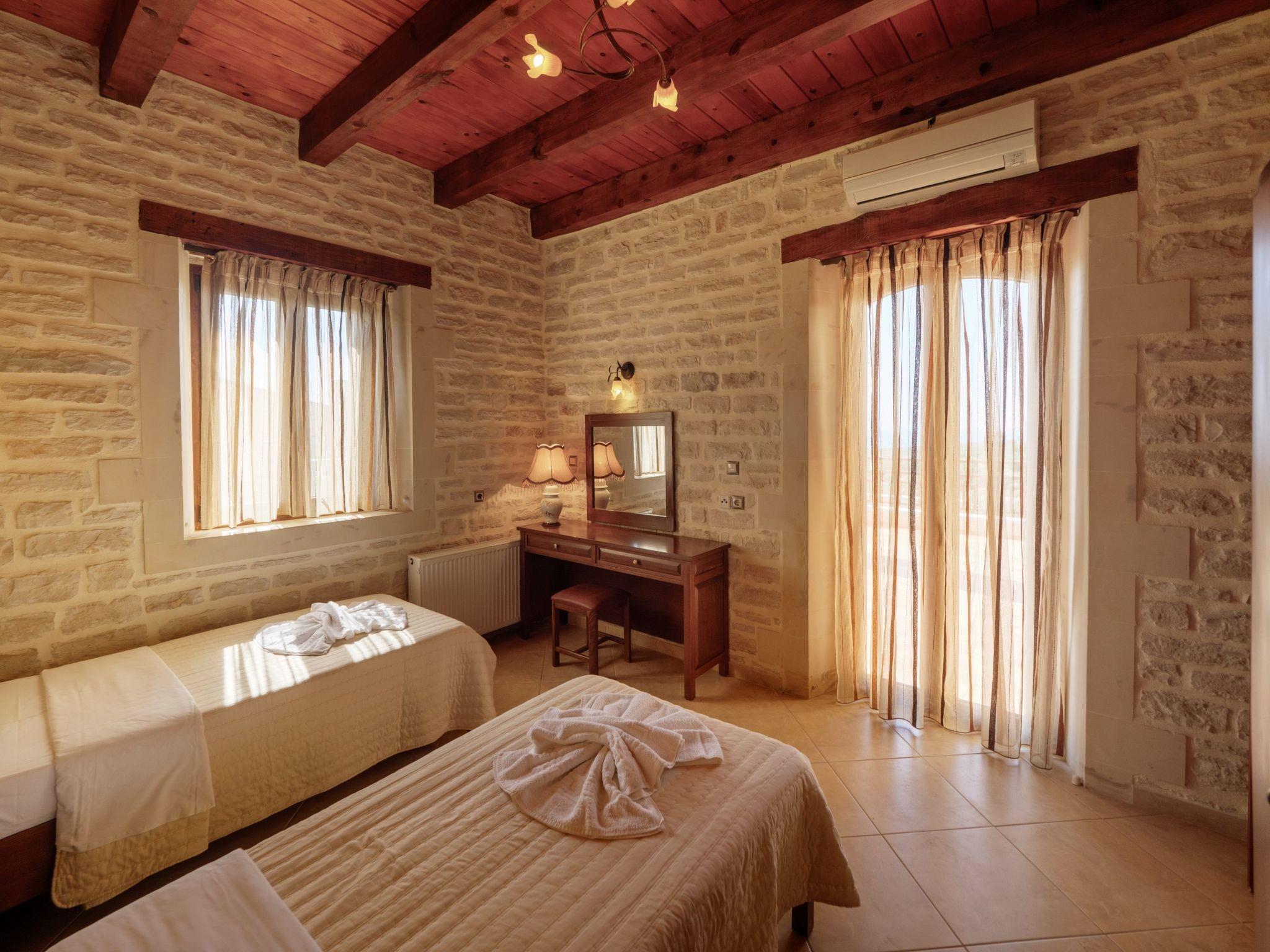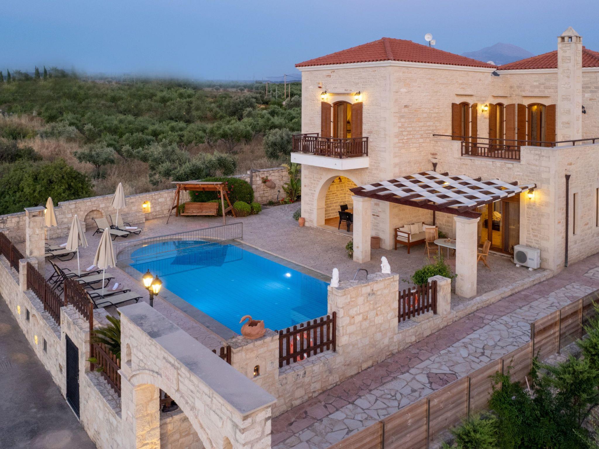 Villa Erofili is an impressive newly built stone villa situated in Asteri Village, only 14 km east of Rethymno. The villa's beautiful design and layout, combined with the fabulous location offering panoramic views over the mountains, sea, and olive groves, takes you immediately to your happy place. The villa has 4 bedrooms and three bathrooms suitable for 8 people. The entrance leads to the spacious open plan living/dining area with fireplace, satellite TV and comfortable sitting area. The kitchen is modern and fully equipped. The ground floor also features one bedroom with twin beds and a shower/WC. An internal staircase leads to the upper floor with three more bedrooms. The main bedroom has a double bed and en-suite bathroom/WC with a hydro-massage bathtub; the other two have twin beds. There is another spacious bathroom with a washing machine and a bathtub on this floor. Each bedroom has a balcony with wonderful views to the sea and mountains. In addition, the villa has a big beautiful rooftop of 30 sq. m., where you can enjoy the magnificent views to the sea, the mountain and the City of Rethymno. Check out is 11:00 latest and check in is 15:00 earliest.