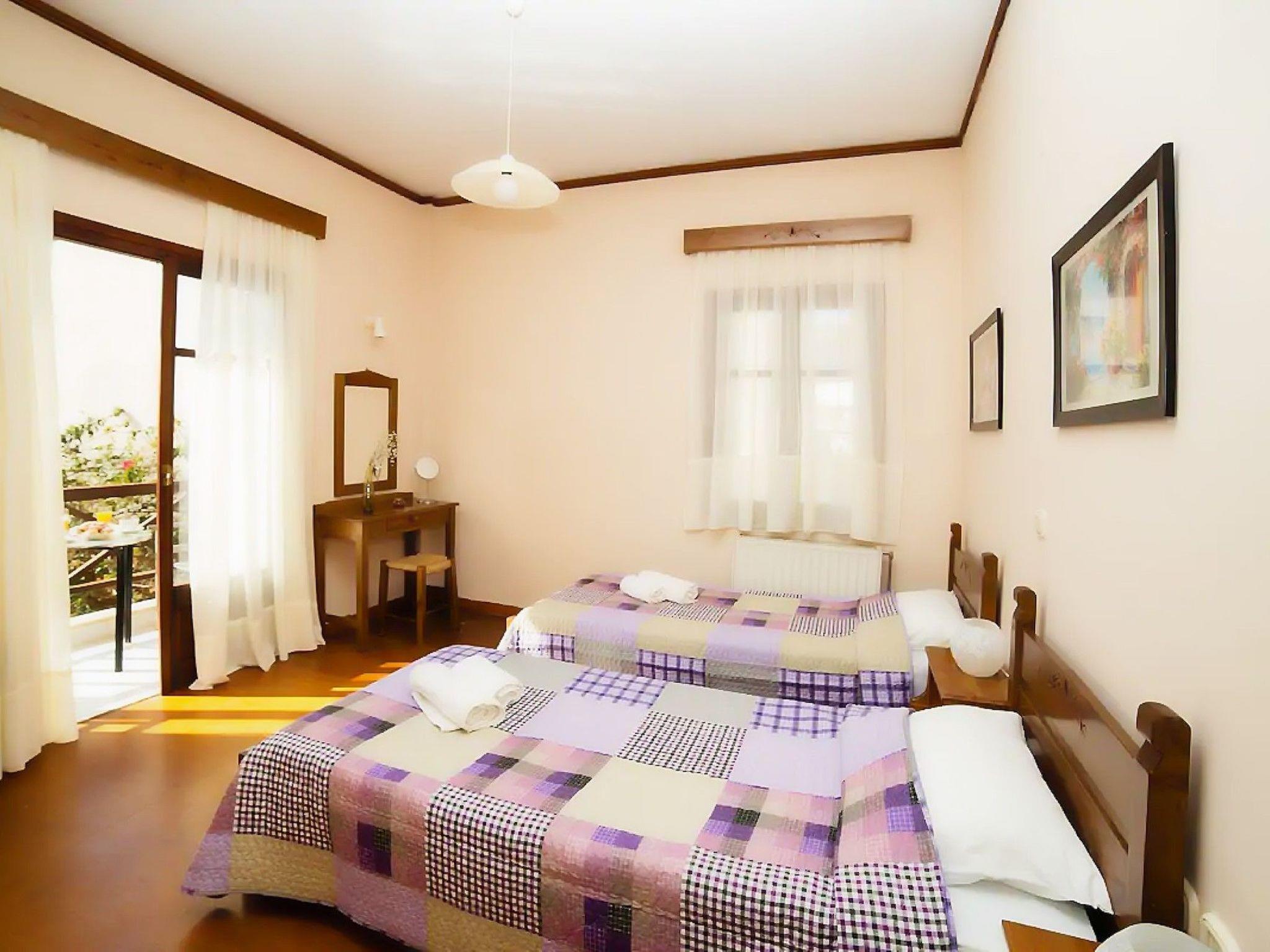 The villa was built in 1995 by the family of the owners. It was in 2001, after a complete renovation – always with great respect to the natural beauties and attractions of Roussospiti village, that the villa was first used to lodge visitors and tourists. It was the caring and hospitable father of the family who had it going for a two-year period under the name “Villa Dina-Irini”. Due to personal reasons and despite the its overall successful course, the operation was for some time closed. Some months ago it was decided to renovate once again and re-open the premises. Its new name, “Amarandos”, refers to amaranth or sempre viva, the flower of the everlasting blossom. The villa consists of two separate fully furnished 110 m2 apartments that are rented together as one and can accommodate up to 14 people. Each level has 3 bedrooms (linen and towels available), a fully equipped kitchen (dishwasher, microwave oven, toaster, coffe-machine, kettle), living-room, bathroom and WC and wide balconies with a fantastic view of the sea. All other electrical appliances that will make your stay pleasant and easy (such as air-condition, TV set, washing machine, iron, blow-drier) are also available.
