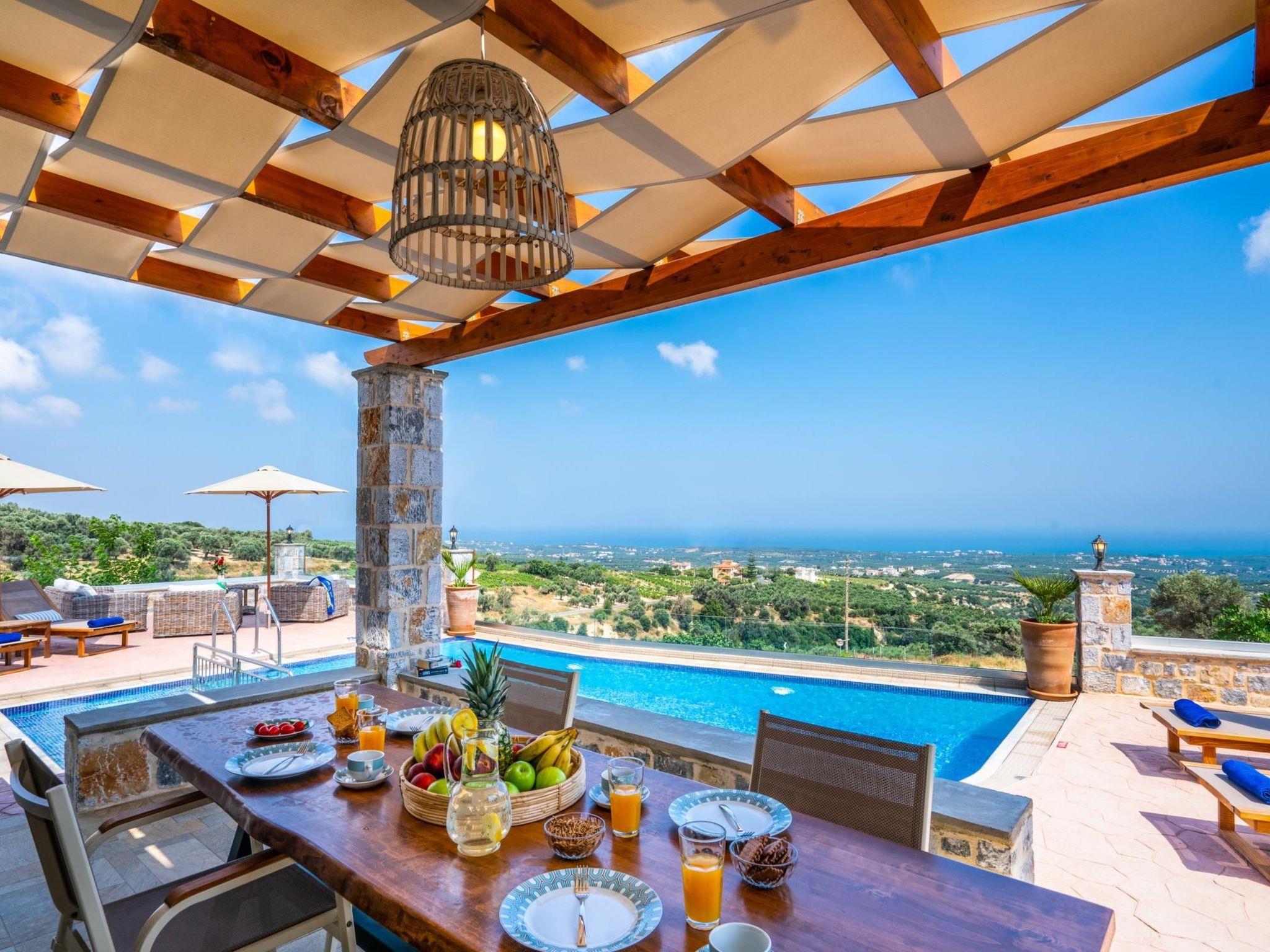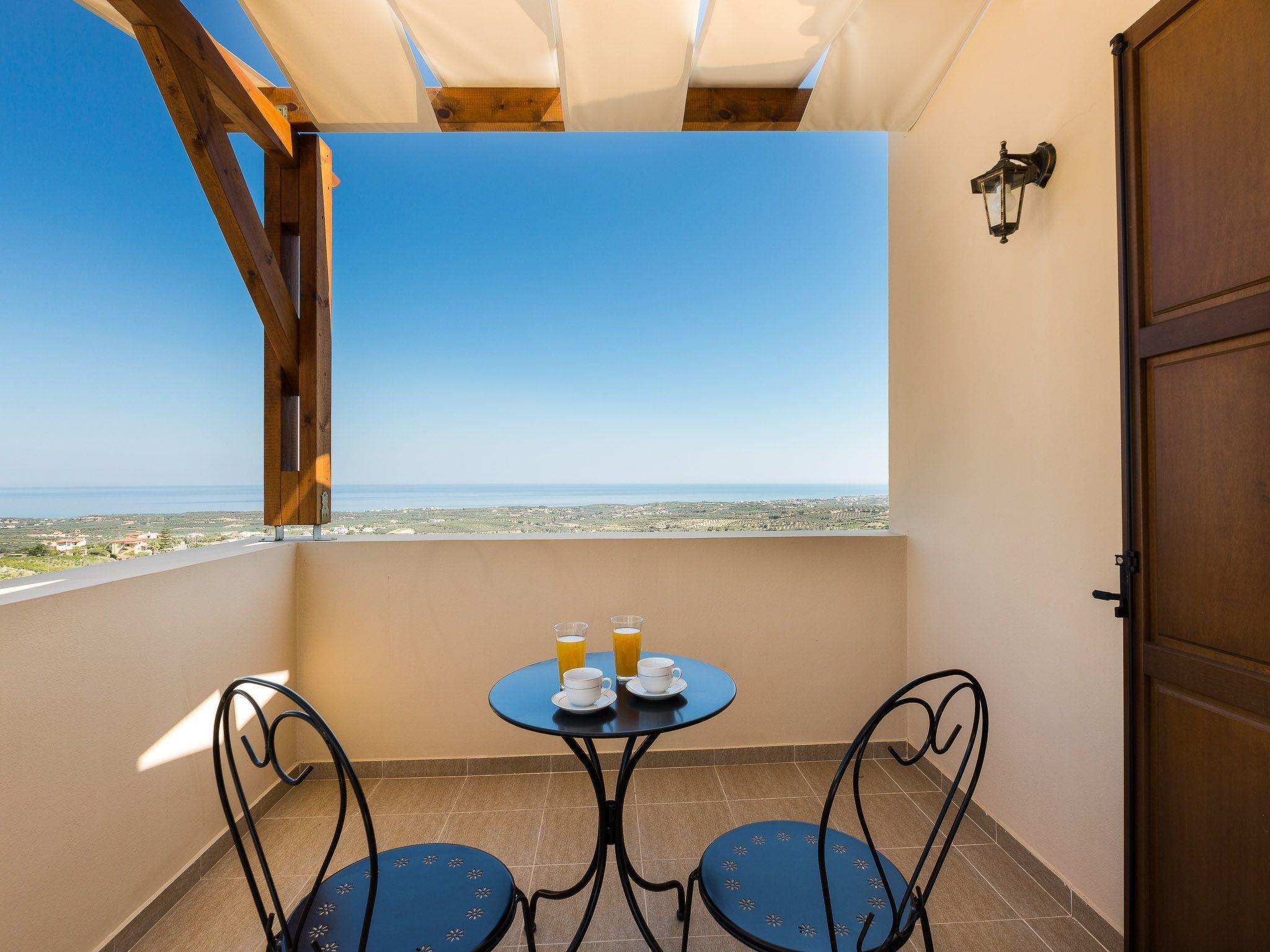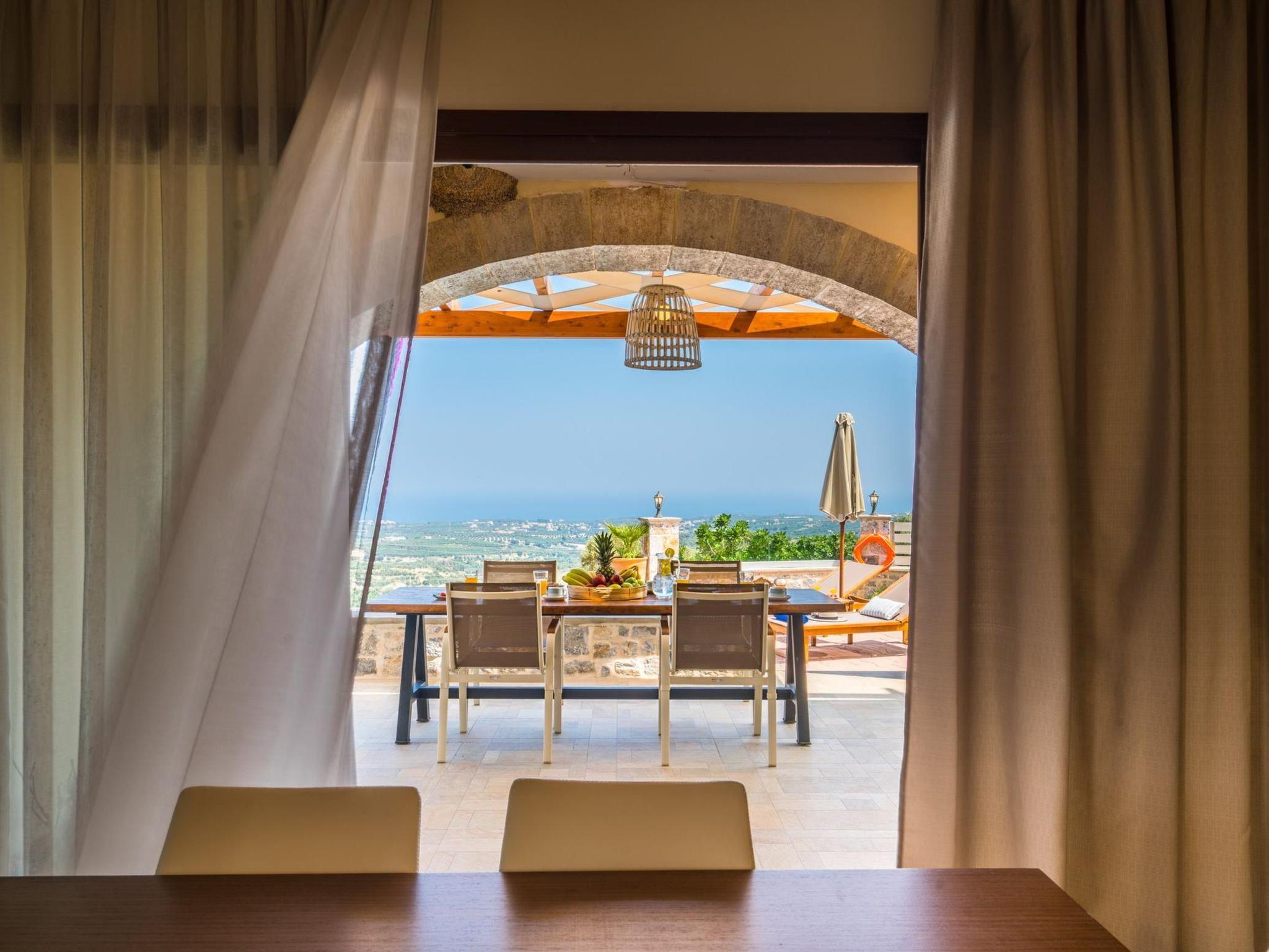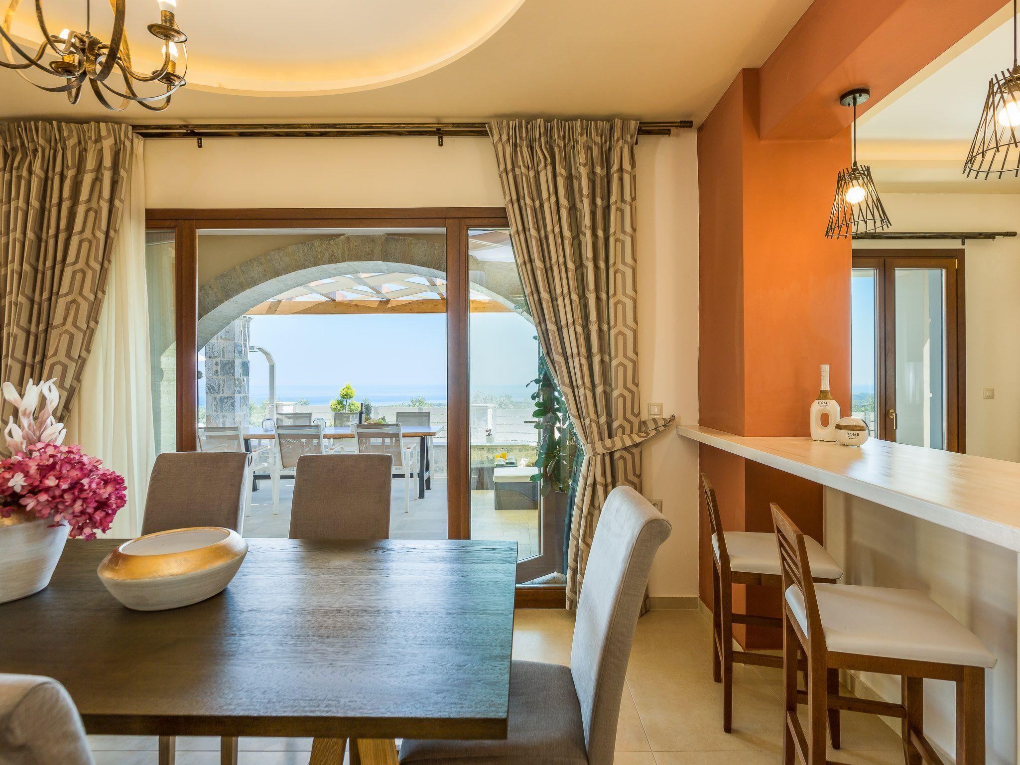 Kantifes property, a villa you can calm and spend your personal time away from everything. Your family or friends will be glad for an exquisite holiday home in Crete that is only 7 kilometers away from the nearest sandy beach. It is located between the largest cities of Crete and can be an ideal choice for your daily excursions of exploration. Villa Kantifes was built in 2018 and is designed to provide comfort and ergonomics for every visitor, without any aversion to aesthetics. On the outdoors there is a sea view and you can enjoy it as you sunbathe from the pool. It has a terrace with outdoor furniture and a barbecue area. On the ground floor there is a comfortable lounge with large flat-screen TV, banquet and a kitchen with a breakfast table and all modern amenities. In the ground floor the color of wood dominates in a timeless minimalist style. Cozy curtains decorate the windows and offer privacy when it is required. The house can accommodate up to 5 guests in its two bedrooms, with one double bed in one room and three single beds in the other (they can be converted in to double bed and a single bed on request). The bedrooms are located on the first floor and have two balconies with a shelter and awesome green and sea views.