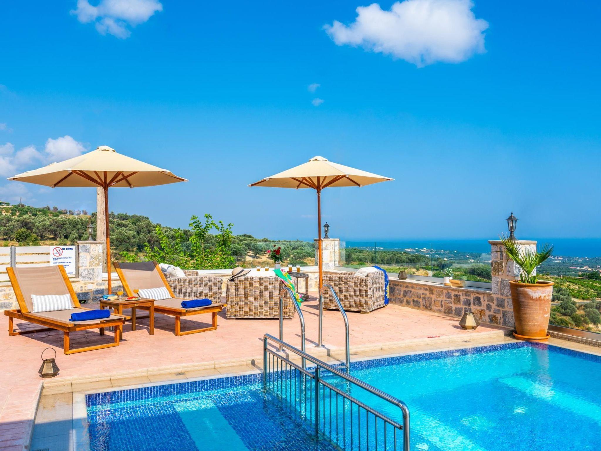 Exterior Area:-First of all, all the exterior areas of the property are private and also provide full privacy-32m2 private swimming pool and depth 1.45-4m2 children's pool and depth 0.45- Fully equipped built in barbecue area - outdoor dining tables under shadows with views to the sea and the surrounding landscape- Different places to relax under a shade or under the sun along with sun beds, umbrellas, dining tables or exterior sofas- 2 parking spaces