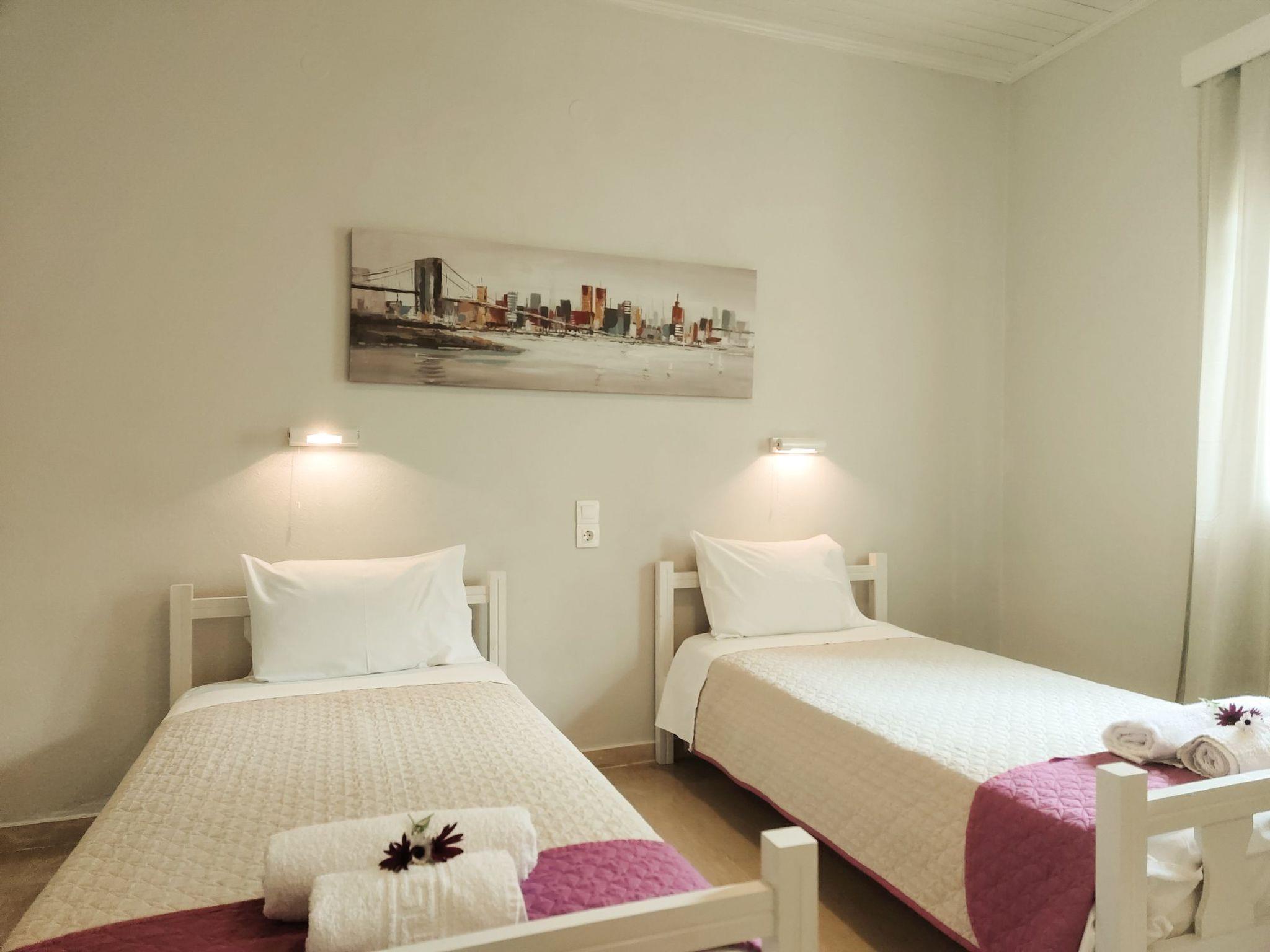 Amalia Ena has two bedrooms: one double with a balcony door opening to the front terrace and one twin with a back window overlooking the olive grove.