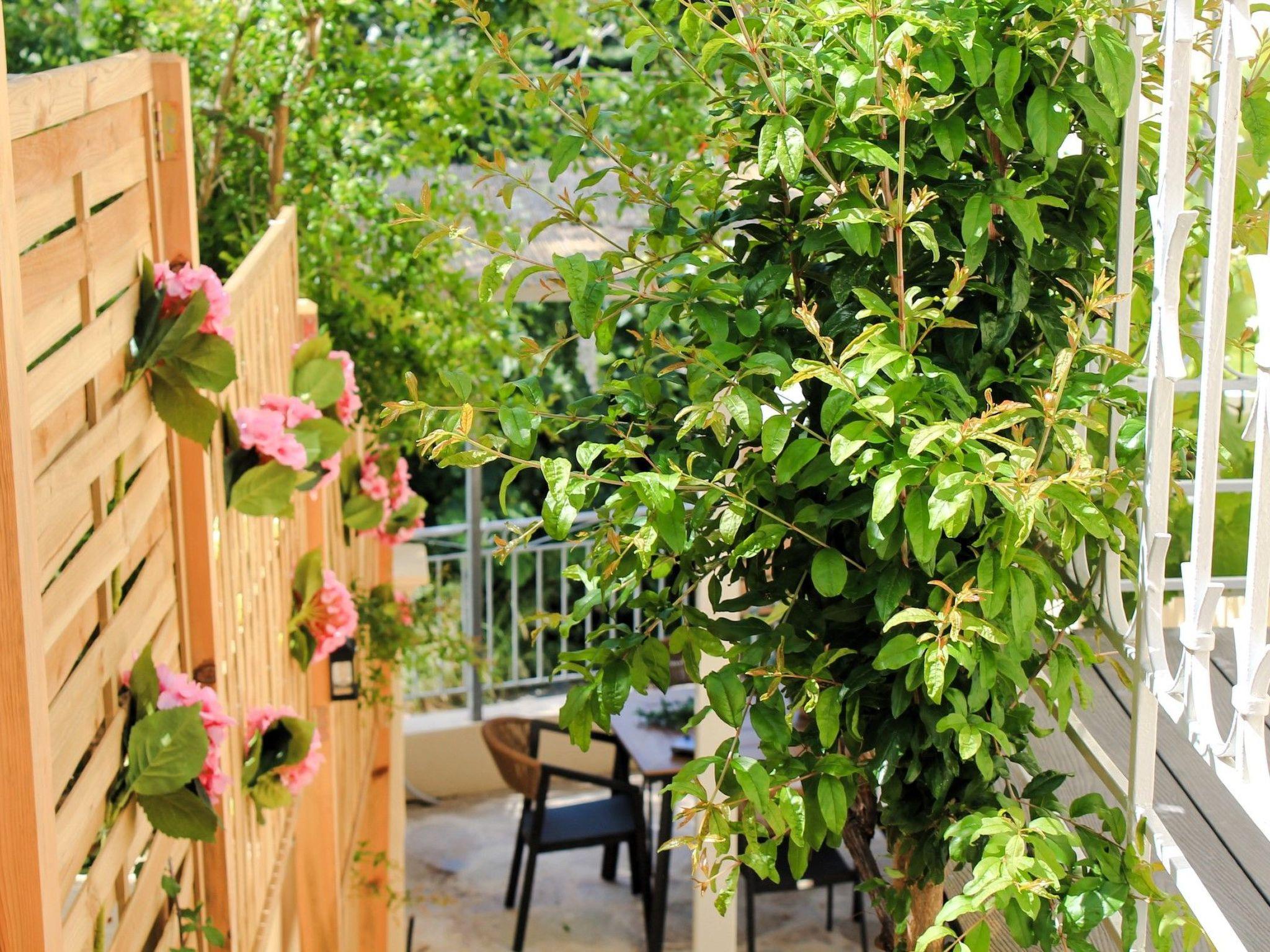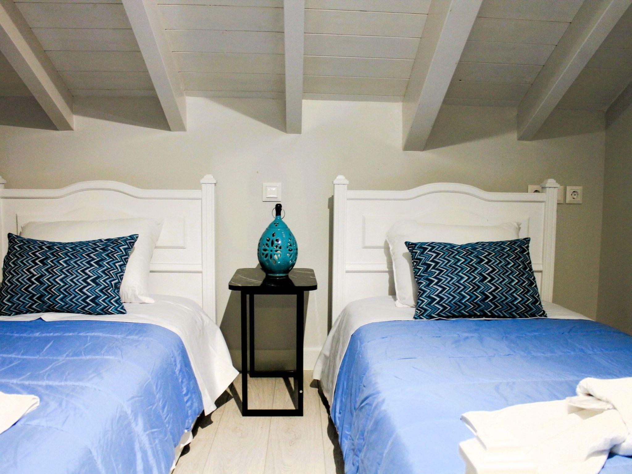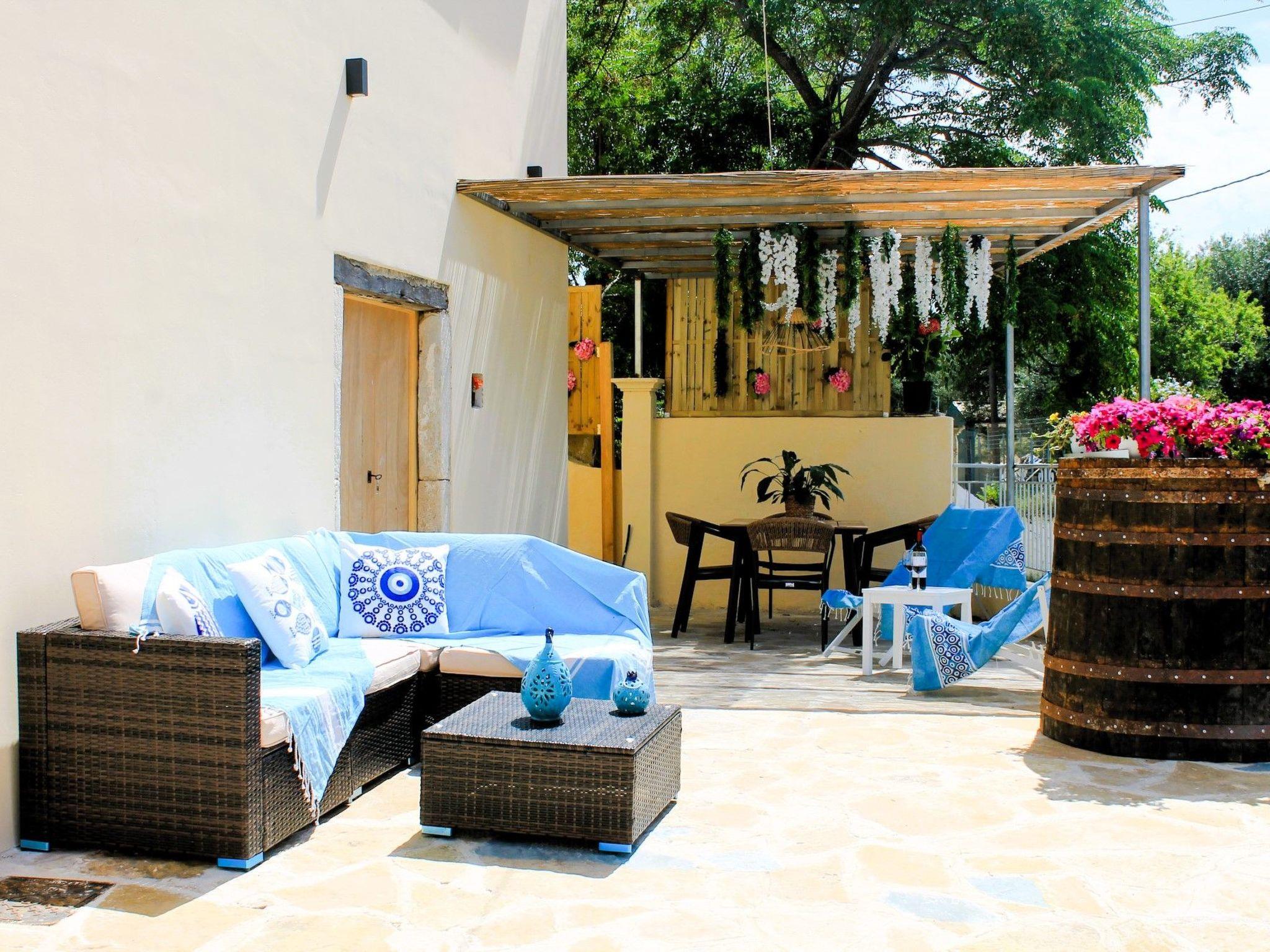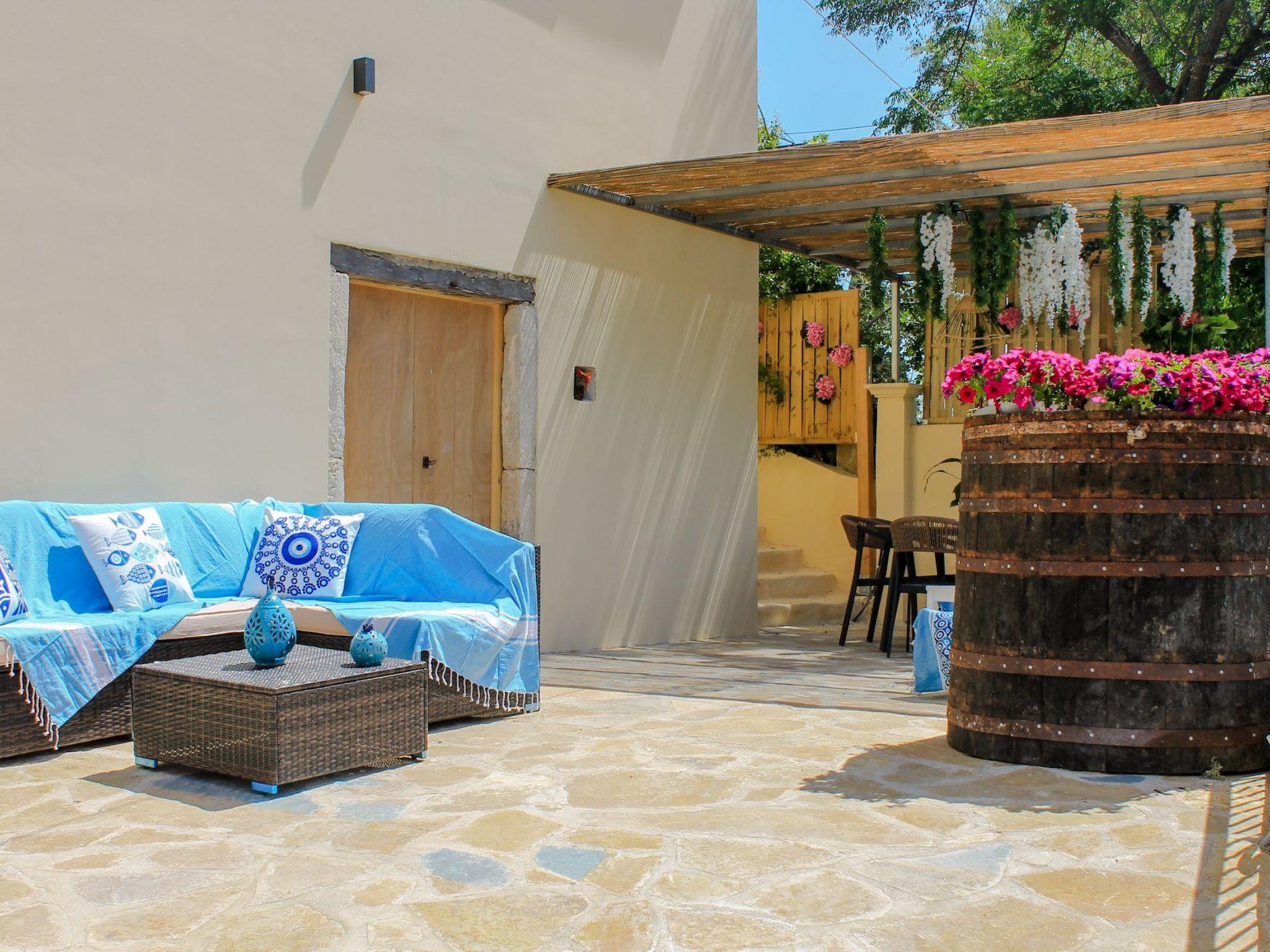 Step outside and experience the inviting ambiance of Villa Linos. The courtyard offers ample space for guests to enjoy breakfast or meals in the open air, surrounded by the peaceful melodies of the countryside. Immerse yourself in the serene ambiance of this picturesque location, where every detail is designed to create cherished memories with your dear ones.