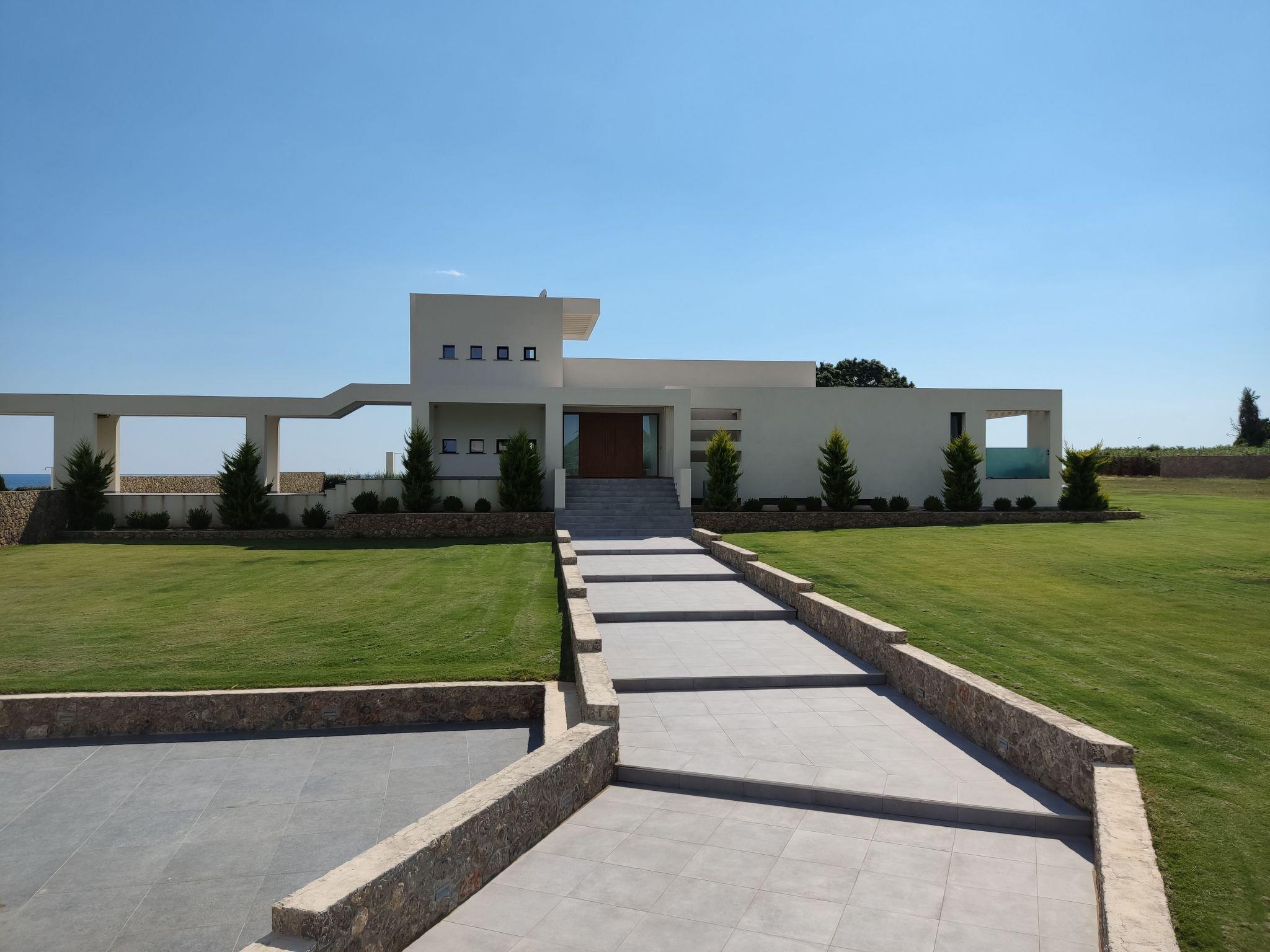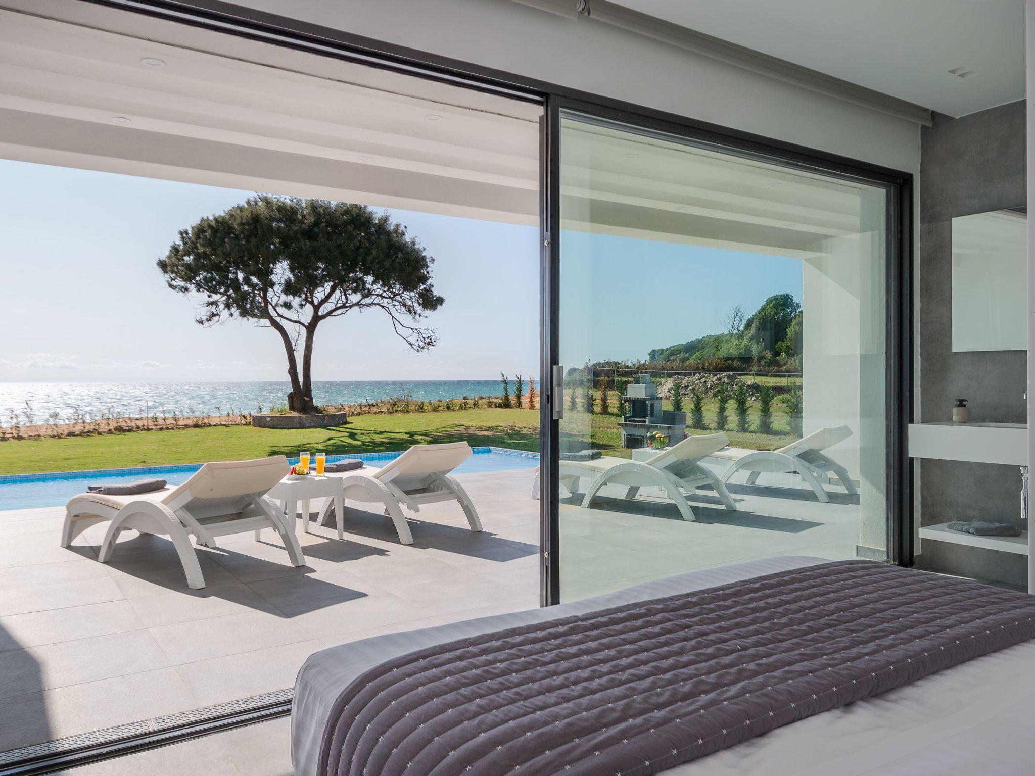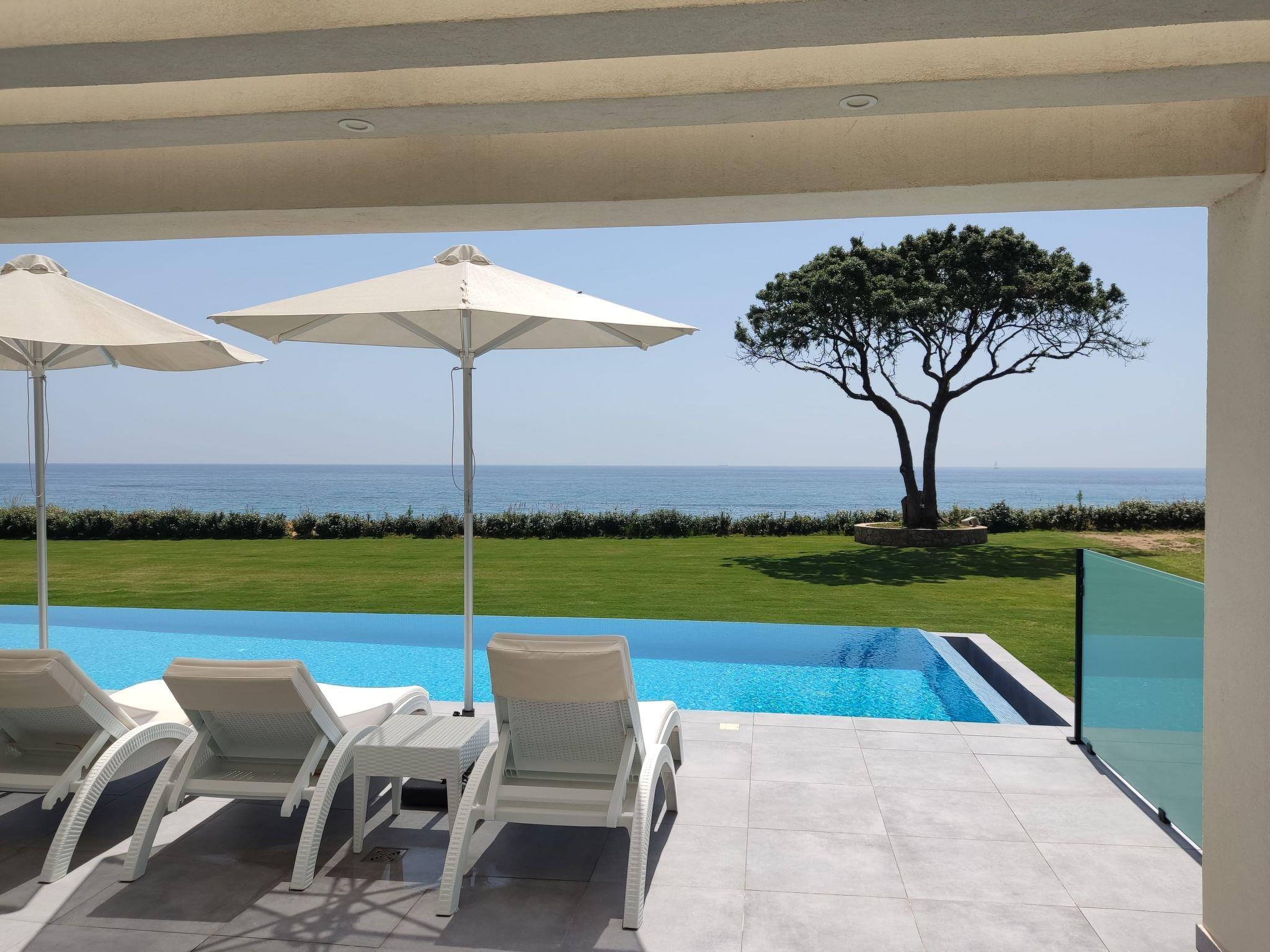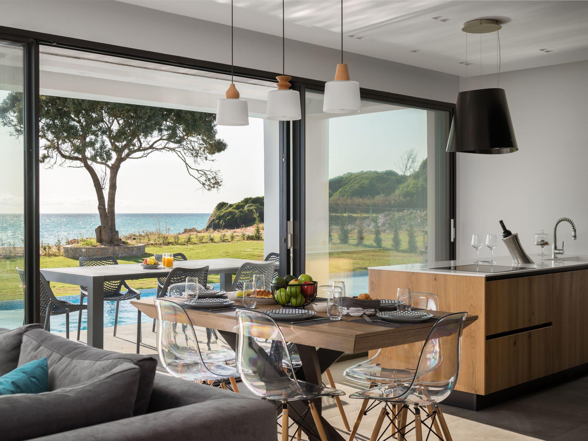 Newly built contemporary villa, with a minimalist design, build with of the best materials and equipped for all your needs to enjoy this luxurious accommodation in a wonderful location by the sea.Luxury Seafront Villa with Private heated infinity Pool, jacuzzi on the pool, and playground for the children. Amazing Sea View. Peaceful location ideal for families seeking relaxation. Secure parking. The sunset from this villa is is an unforgettable experience.We are pleased to inform you that the villa from the 2023 season has direct access to the beach within the plot.Our beach below the villa has two umbrellas and four sun beds for private use by our clients.Near to our villa located Halikounas beach (10 min walk), recently described in Forbes magazine as one of the top 10 safest beaches in Europe for safe social distancing.