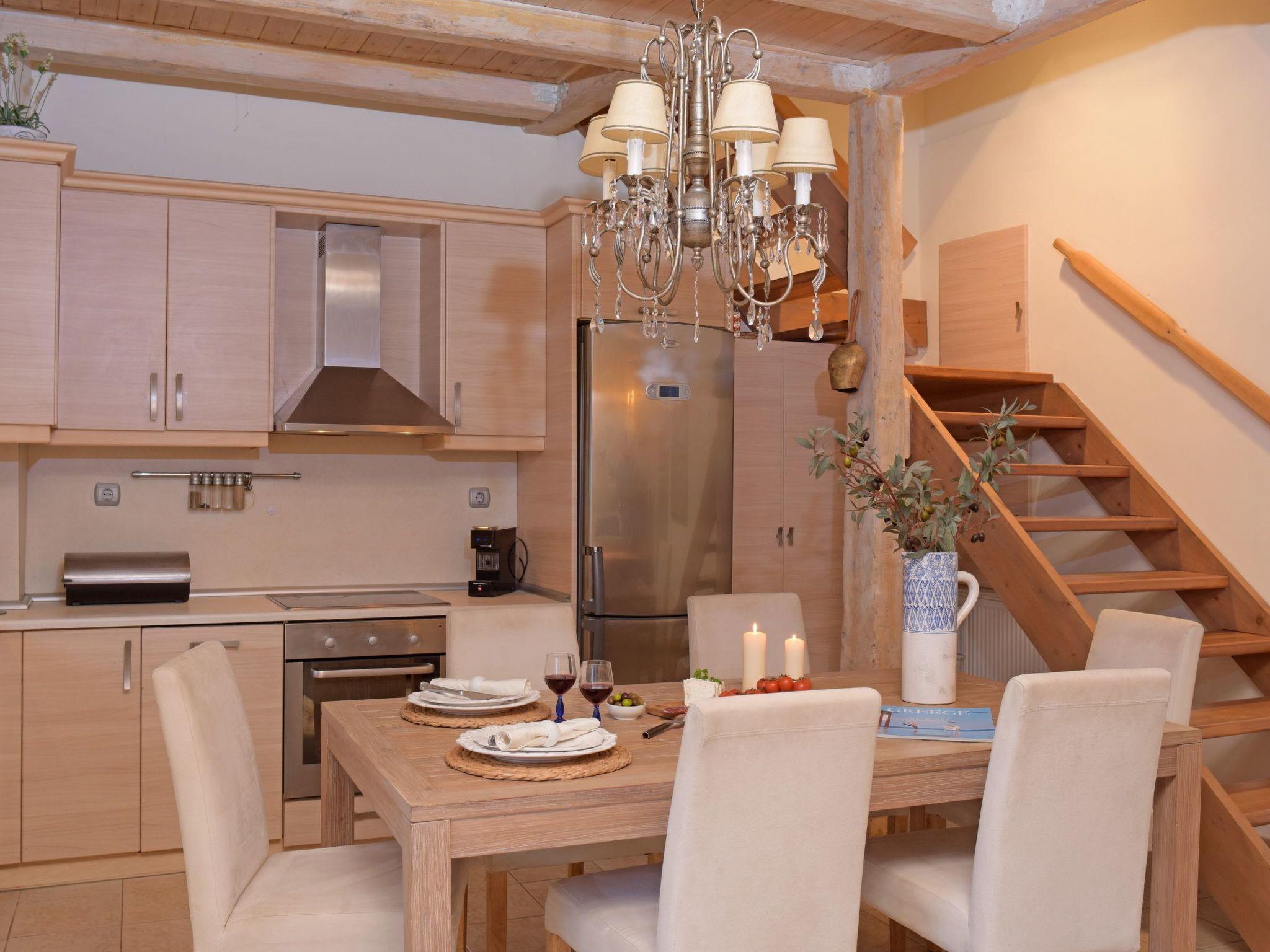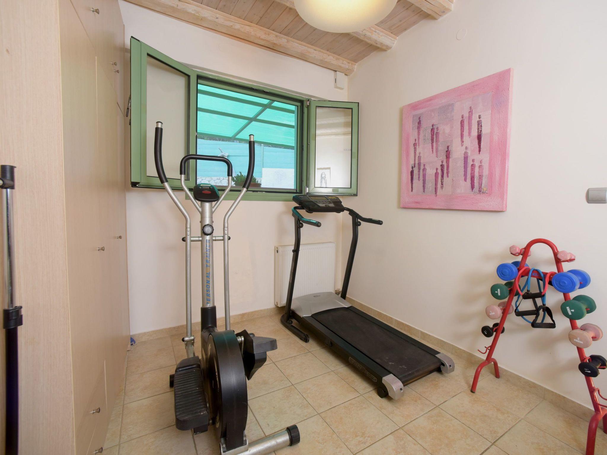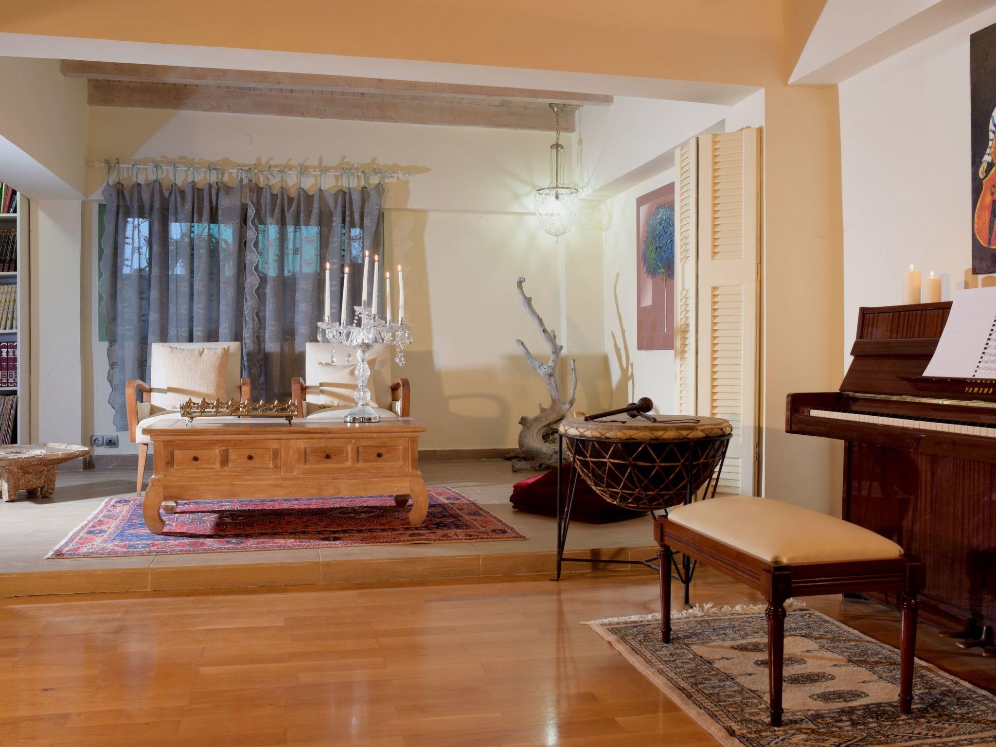 The ground floor is about 92 m² in size and comprises of the following rooms: Two living rooms, one with a fireplace, a flatscreen TV, a double sofa. Plus there is a fully-equipped kitchen with an oven, coffee machines and a dining area for 8 persons. The second living room is in a slighter upper level which consists of a musical instruments' corner, a double sofa, a library. A peaceful area for readers and artists. Next to it there is a bathroom with a bathtub and a toilette. Lastly there is also a fitness room next to it and the door that leads to the exterior barbecue area.