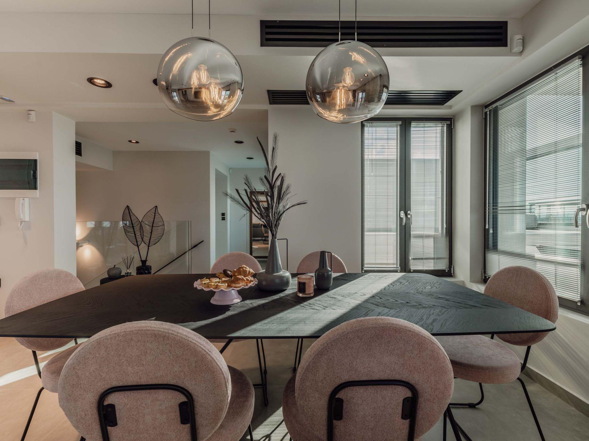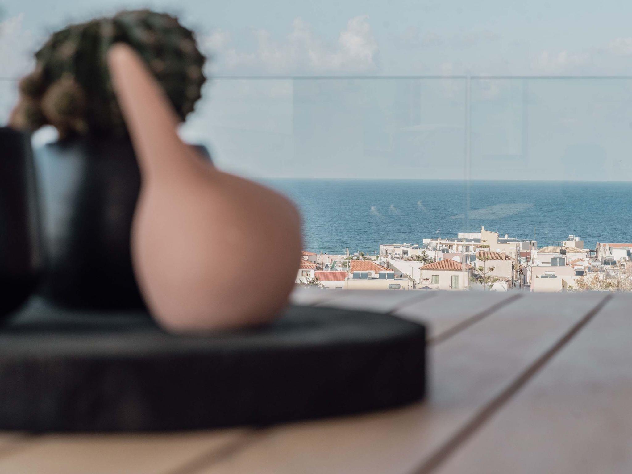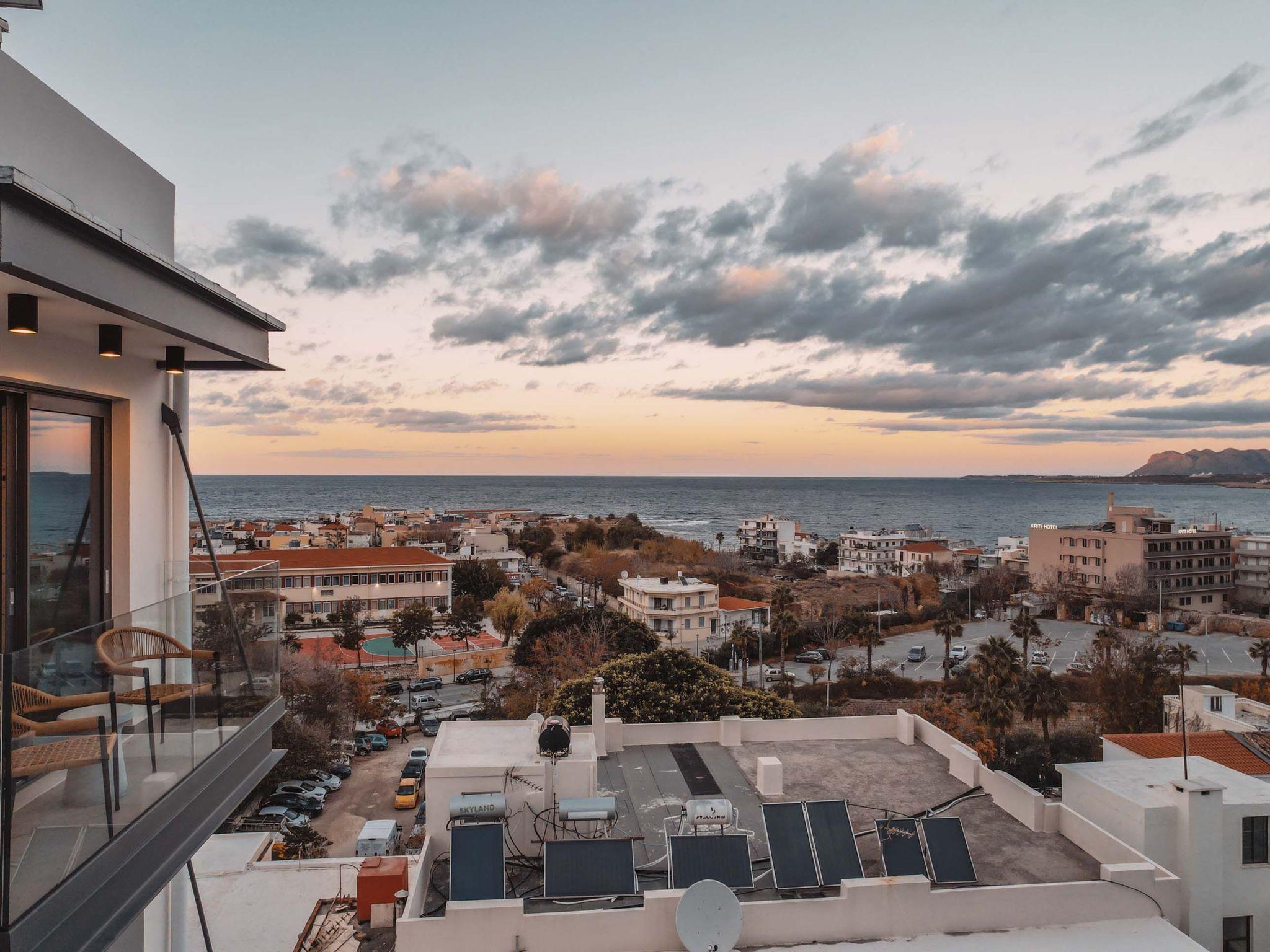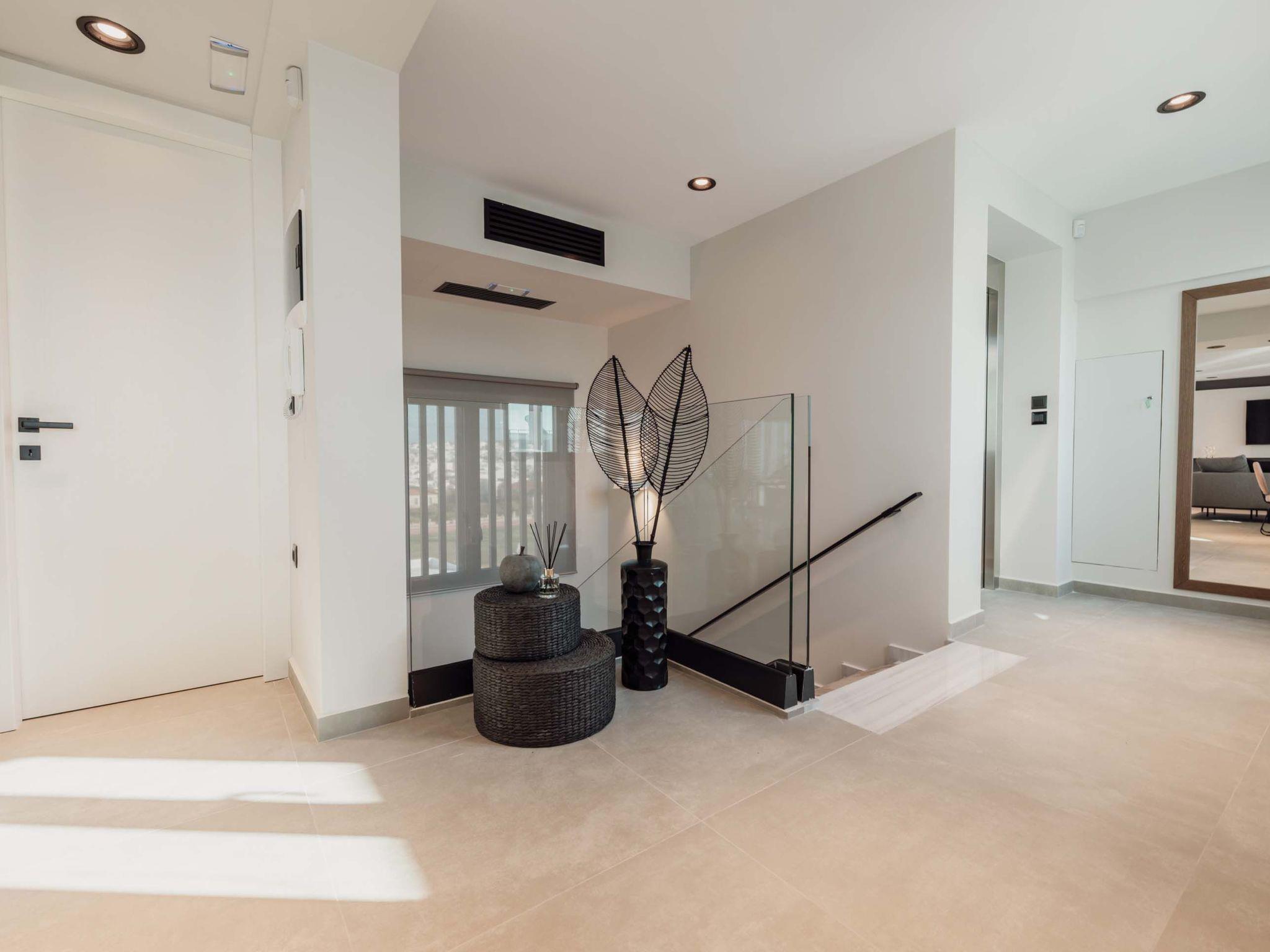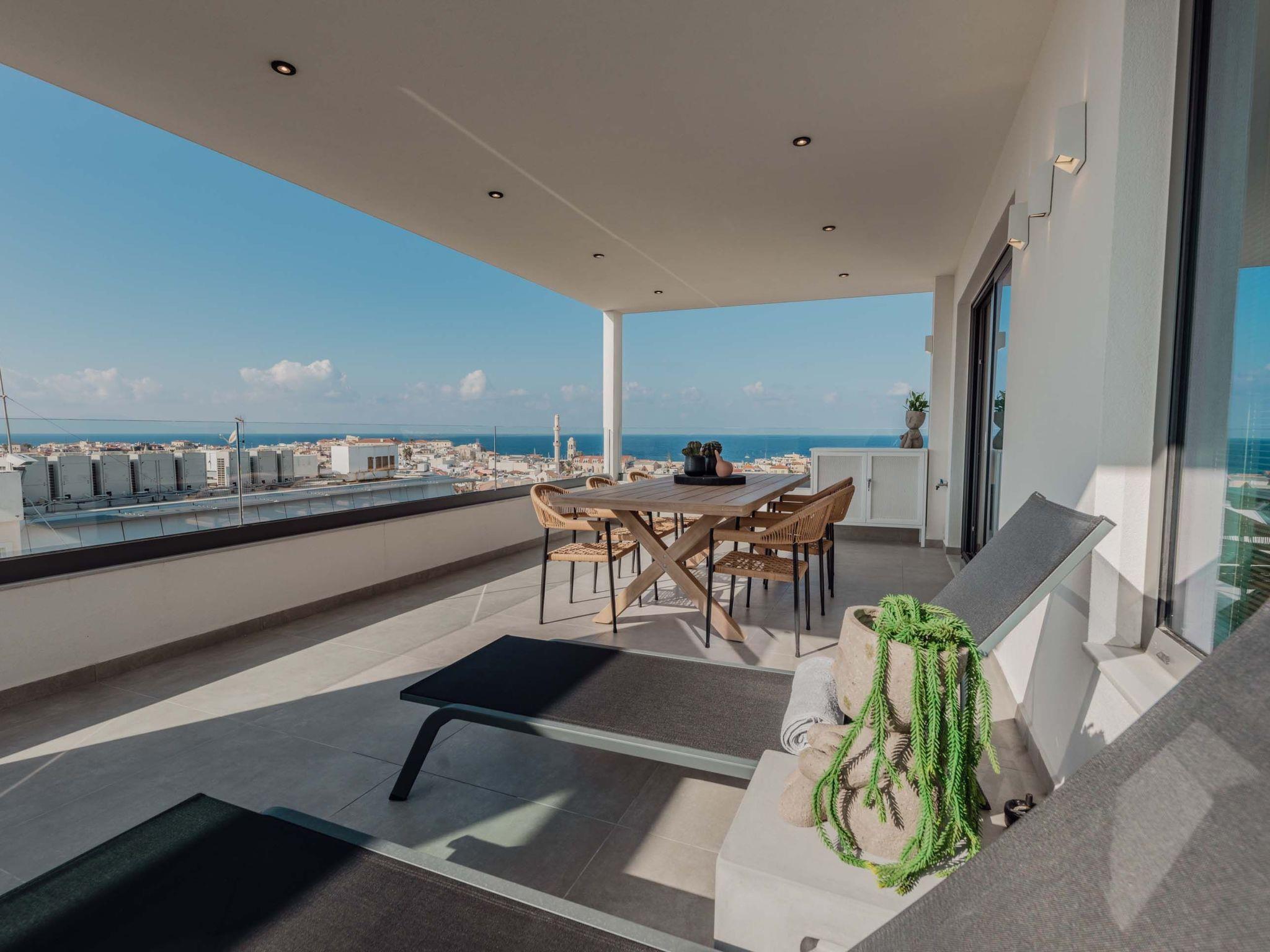 The stunning penthouse features generous indoor and outdoor areas that can host up to 6 guests generously featuring lavish design, supreme amenities handcrafted furniture, an exuberant living room, and a dining area on the upper floor, completing the utopian hideaway. Set across two floors, on the 5th and 6th floors of a new building, the owners have styled each room to feel like an immersive sanctuary. On the entrance floor, there is the open-plan living accommodation with a living area with a satellite TV, a modern fireplace for perfect cosy nights, a dining area, and a fully equipped, fitted, and modern kitchen. The large windows create the illusion of transparency allowing for a flood of Cretan sunshine to illuminate the room. When you reach the lower floor through the elevator you will find 3 modern-designed bedrooms that themselves host queen-size beds with ensuite bathrooms offering complete autonomy and privacy. Next to the bedrooms, for your convenience, you can find a coffee bar with two coffee machines, a small fridge, and some tableware adequate to serve your needs. The property is filled with natural light and instyled with minimal furniture specially designed for this specific project. All the spaces in it offer an indelible mark on the visitor's heart. Its various luxury facilities, its generous stylish areas, its unique location, and its matchless natural beauty make the City Moment Penthouse the perfect opportunity for a high-quality stay and the ideal summer home.